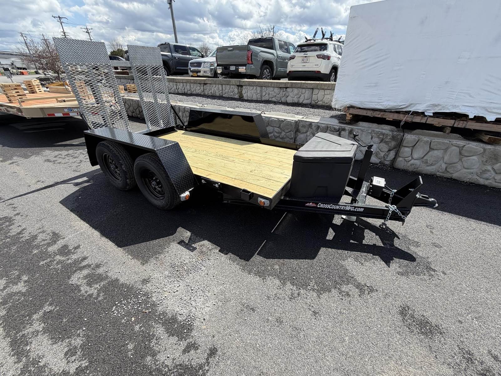 RAMP TRANSITION, POLY TONGUE BOX, , 4” Drop Axles Radial Tires on White Spoke Wheels, , Height Adjustable Hitch 2000 lb. Tongue Jack (7000#...
