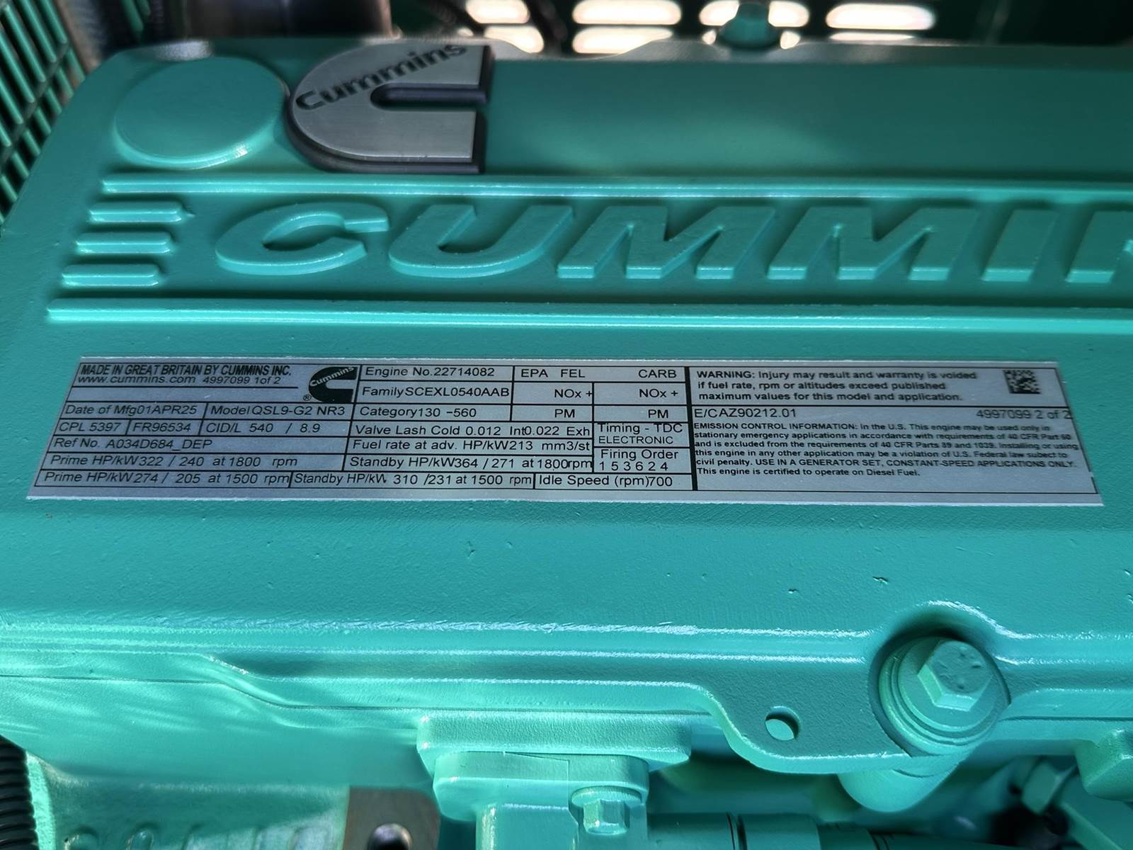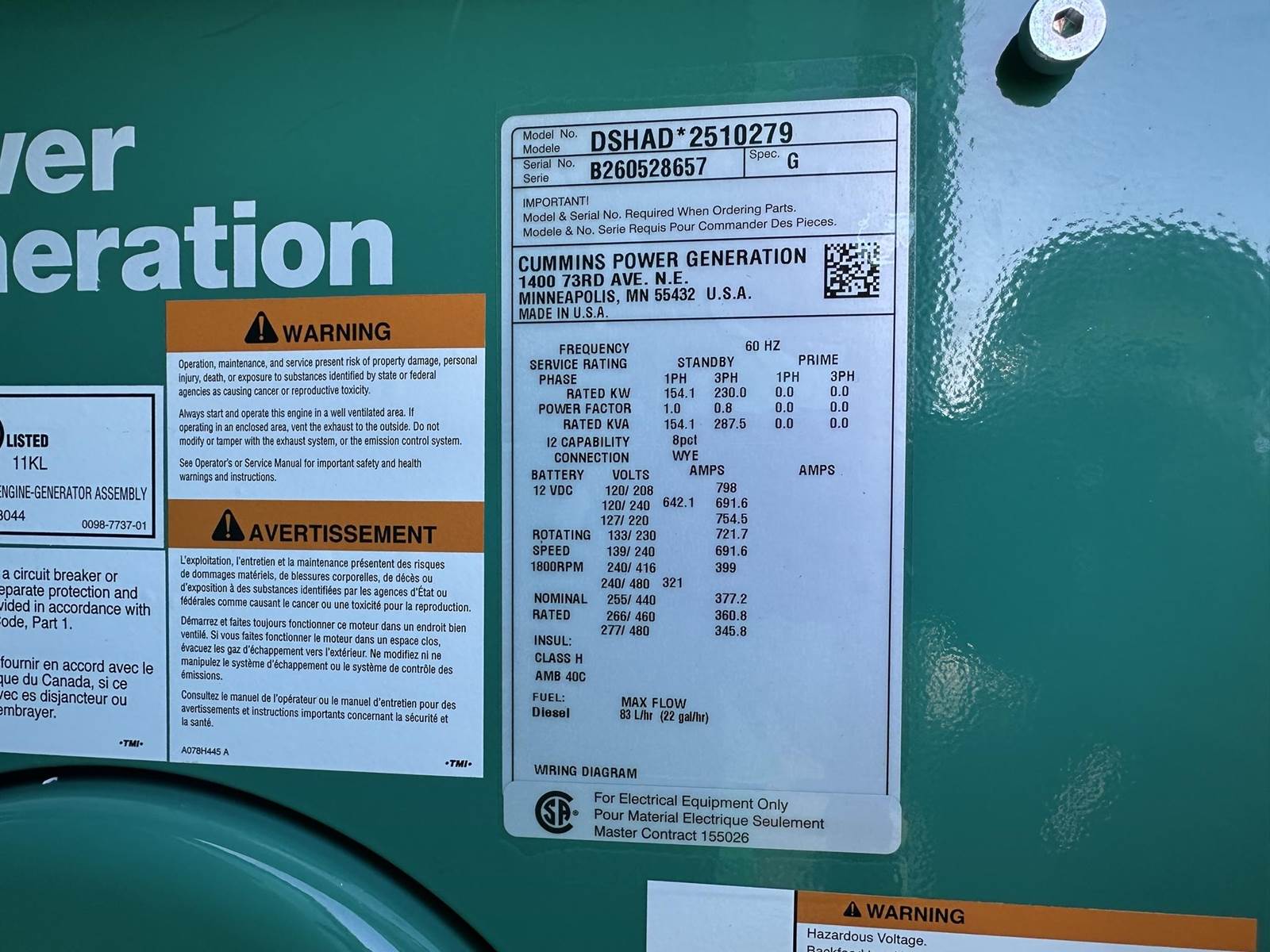 New Cummins 230 kW standby (209 kW prime) diesel generator set, model DSHAD, SN-B260528657. Cummins QSL9-G2 NR3 engine rated 364 HP at 1800 RPM, SN-22714082, EPA Tier 3 emissions. 3/60/120/208V, 12 lead reconnectable to other voltages. 800 Amp main-line circuit breaker. PMG permanent magnet generator. Engine cooling radiator rated 50C/122F ambient. UL 2200 listed package. PowerCommand 2.3 digital control panel. EnerGenius battery charger 10 Amp, ships loose. Coolant heater 208/240/480V. Weather enclosure. 336 gallon UL142 sub-base fuel tank with secondary containment. Batteries and start up not included. 0 Hours. Year 2026. Cummins 2 Yr 1000 Hr limited warranty. Overall dimensions 40W x 105L x 88H, 4811 lbs, ships on 45W x 117L skid. FOB Waukesha, WI