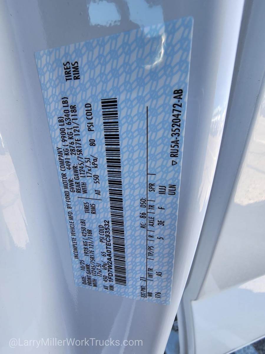Options: 153 18A 21 425 44F 52B 572 600A 66D 66S 67D 96V 9900 99A AS CONN FOG TD8 X3E,ELECTRONIC-LOCKING W/3.73 AXLE RATIO,190 AMP ALTERNATOR,ENGINE: 6.8L 2V DEVCT NA PFI V8 GAS (STD),ORDER CODE 600A,PICKUP BOX DELETE -inc: rear view camera and prep kit Deletes tailgate tie down hooks rearview camera and 7/4 pin connector Incomplete vehicle package - requires further manufacture and certification by a final stage manufacturer In addition Ford urges manufacturers to follow the recommendations of the Ford incomplete vehicle manual and the Ford truck body builder's layout book (and applicable supplements) GVWR: 9 900 lbs Rear Bumper Delete Spare Tire Wheel Jack & Tire Carrier Delete,250 AMP ALTERNATOR,TIRES: LT245/75RX17E BSW A/S -inc: Spare may not be the same as road tire (STD),FRONT LICENSE PLATE BRACKET -inc: Standard in states requiring 2 license plates and optional to all others,TRANSMISSION: TORQSHIFT-G 10-SPEED AUTOMATIC -inc: SelectShift and selectable drive modes: normal eco slippery roads tow/haul and trail (STD),MEDIUM DARK SLATE HD VINYL 40/20/40 SPLIT BENCH SEAT -inc: center armrest cupholder storage and driver's side manual lumbar,TRAILER BRAKE CONTROLLER -inc: smart trailer tow connector,XL CHROME PACKAGE -inc: 4 pickup box tie-down plates Halogen Fog Lamps Bright Chrome Hub Covers & Center Ornaments Chrome Rear Step Bumper Chrome Front Bumper,UPFITTER SWITCHES (6) -inc: Located in overhead console,VEHICLE INTEGRATION SYSTEM 2.0 -inc: programmable vehicle integration system Recommended for trucks that will utilize upfit aftermarket equipment,Rear Wheel Drive,Tow Hitch,Power Steering,ABS,4-Wheel Disc Brakes,Brake Assist,Steel Wheels,Tires - Front All-Season,Tires - Rear All-Season,Tow Hooks,Heated Mirrors,Power Mirror(s),Integrated Turn Signal Mirrors,Intermittent Wipers,Variable Speed Intermittent Wipers,Power Door Locks,Daytime Running Lights,Automatic Headlights,AM/FM Stereo,MP3 Capability,MP3 Capability,Steering Wheel Audio Controls,Bluetooth Connection,Telematics,Auxiliary Audio Input,Smart Device Integration,Requires Subscription,Bluetooth Connection,Pass-Through Rear Seat,Rear Bench Seat,Adjustable Steering Wheel,Trip Computer,Power Windows,Keyless Entry,Power Door Locks,Cruise Control,A/C,Vinyl Seats,Split Bench Seat,Driver Adjustable Lumbar,Passenger Vanity Mirror,Smart Device Integration,Requires Subscription,Smart Device Integration,WiFi Hotspot,Power Windows,Power Door Locks,Trip Computer,Security System,Immobilizer,Traction Control,Stability Control,Traction Control,Front Side Air Bag,Telematics,Requires Subscription,Tire Pressure Monitor,Front Head Air Bag,Rear Head Air Bag,Driver Air Bag,Passenger Air Bag,Child Safety Locks