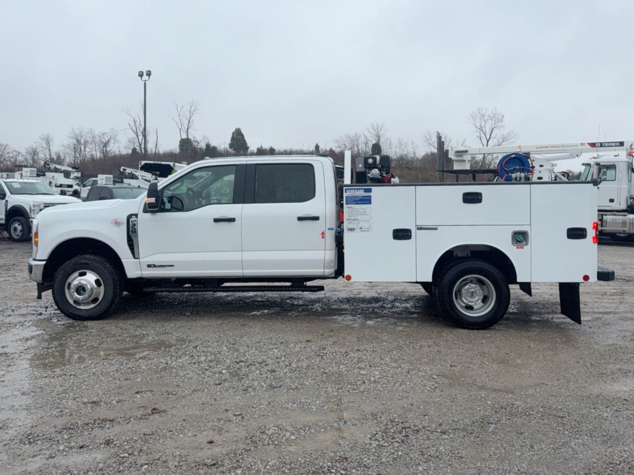 This Ford F350 4x4 Crew Cab with the Renegade 44 service body is a versatile field-ready work truck tailored for maintenance, repair, and light construction crews. With a 330-hp Powerstroke diesel, TorqShift automatic transmission, and 14,000-lb GVWR, it delivers the power and durability needed for daily heavy use. The Renegade aluminum service body maximizes organization and efficiency with adjustable shelving, concealed hinges, reinforced aluminum doors, and secure key/e-lock systems. Integrated features like LED compartment lighting, rear camera, power outlets, and front strobes improve safety and usability. Compact yet rugged, it provides operators with a cost-effective, dependable platform for tools, towing, and jobsite mobility.