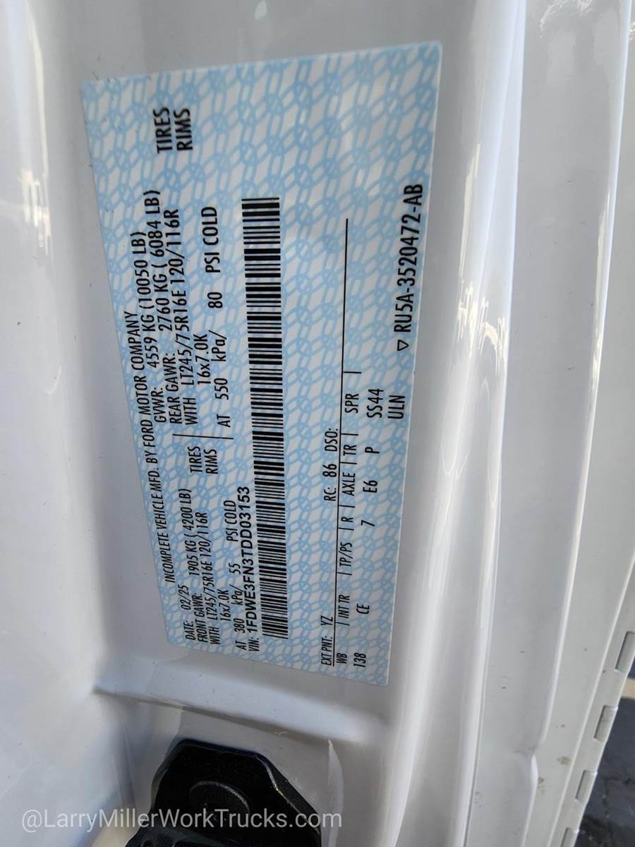Options: 153 162 18A 20X 211 41H 425 43E 44P 516 525 52S 534 54E 559 572 587 596 614 63O 642 657 780A 87A 903 942 99N C CE L23 T38 XE6 YZ,USER-DEFINED SWITCHES -inc: 4 upfitter switches on the instrument panel,DUAL HIGH BACK BUCKETS (STD),MEDIUM FLINT CLOTH CAPTAIN'S CHAIRS,TIRES: LT245/75R16E BSW A/S -inc: Hankook DynaPro RH03 (STD),TAMPER PROOF ODOMETER,240 AMP ALTERNATOR,LICENSE PLATE BRACKET,OXFORD WHITE,ENGINE: 7.3L V8 PORT FUEL INJECTED GASOLINE (STD),CRUISE CONTROL,NON-CONFIGURABLE DAYTIME RUNNING LAMPS,TRANSMISSION: 6-SPEED O/D W/TOW HAUL -inc: auxiliary cooler (STD),HIGH SERIES EXTERIOR UPGRADE PACKAGE -inc: Front Chrome Bumper Chrome Grille,MANUAL TELESCOPING TRAILER TOW MIRRORS (54E) -inc: power-adjust flat lens,POWER EQUIPMENT GROUP -inc: 1-touch down power driver window 110V Power Inverter Remote Keyless Entry SecuriLock Passive Anti-Theft System (ePATS),4.10 AXLE RATIO W/LIMITED-SLIP,ENGINE BLOCK HEATER -inc: Single element Recommended when minimum temperature is 10 degrees fahrenheit or below,TRAILER TOWING PACKAGE (CLASS I),ORDER CODE 780A,FRAME PUCKS (ISOLATORS) -inc: 12 body mounts,16 SPORT WHEEL COVERS,REAR VIEW CAMERA KIT -inc: camera and large rear view video display that utilizes most of the mirror area,MEDIUM FLINT CLOTH BUCKET SEATS,Rear Wheel Drive,Power Steering,ABS,4-Wheel Disc Brakes,Steel Wheels,Tires - Front All-Season,Tires - Rear All-Season,Intermittent Wipers,Variable Speed Intermittent Wipers,Daytime Running Lights,Automatic Headlights,AM/FM Stereo,MP3 Capability,Bluetooth Connection,Auxiliary Audio Input,Adjustable Steering Wheel,A/C,Stability Control,Front Collision Mitigation,Tire Pressure Monitor,Driver Air Bag,Passenger Air Bag