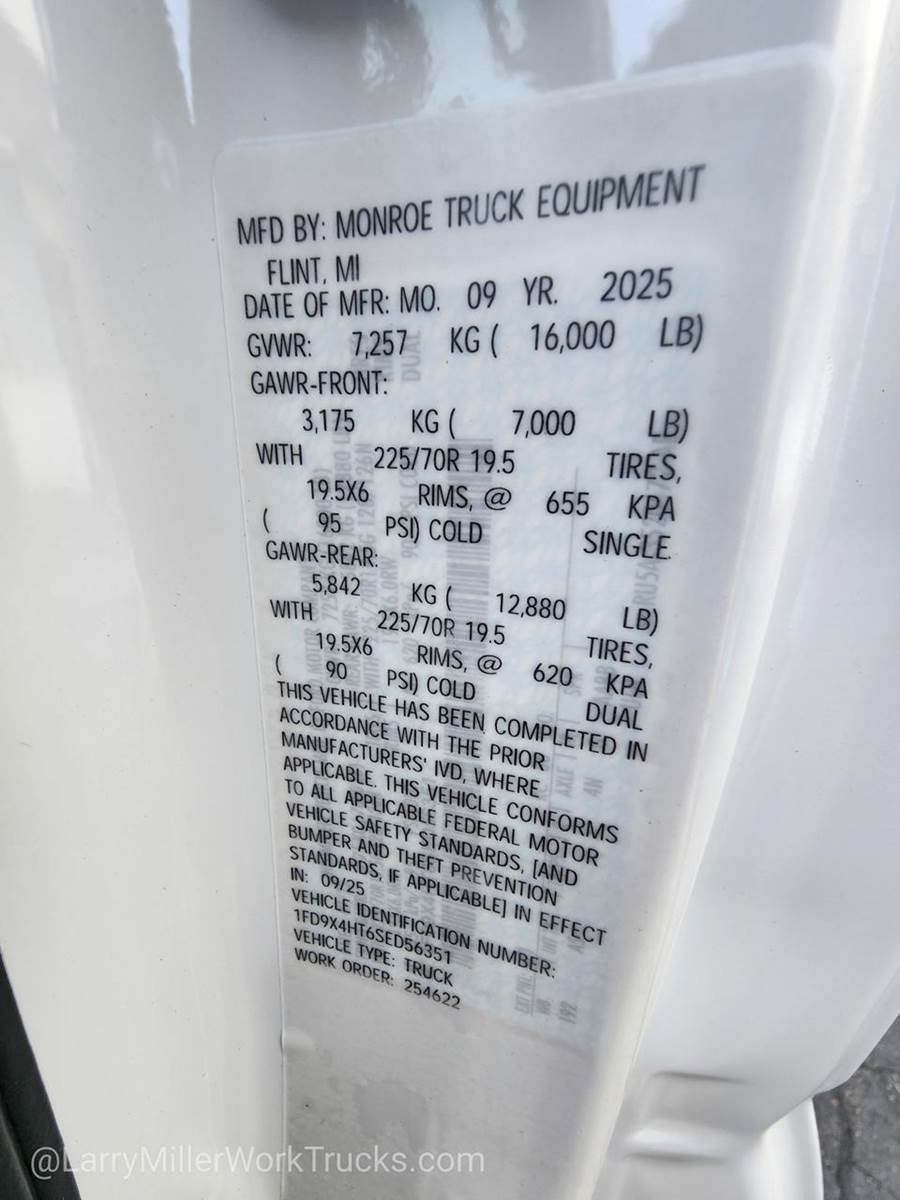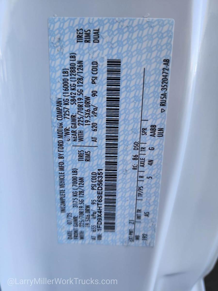 Options: 153 18B 41H 425 43C 44G 473 51D 572 61J 650A 67A 68L 86M 872 96V 99T AS B3Z TGK X4N Z1,REAR VIEW CAMERA & PREP KIT -inc: Pre-installed content includes cab wiring and frame wiring to the rear most cross member Upfitters kit includes camera w/mounting bracket 20' jumper wire and camera mounting/aiming instructions,350 AMP DUAL ALTERNATORS -inc: 190 Amp + 160 Amp,LIMITED SLIP W/4.10 AXLE RATIO,120V/400W OUTLET -inc: 1 in-dash mounted outlet,ENGINE BLOCK HEATER,OXFORD WHITE,XL CHROME PACKAGE -inc: Privacy Glass w/Power Sliding Rear Glass Halogen Fog Lamps Bright Grille Remote Start Chrome Front Bumper Rear Window Defroster,TRANSMISSION: TORQSHIFT 10-SPEED AUTOMATIC -inc: SelectShift selectable drive modes: normal tow/haul eco slippery roads and off-road and transmission power take-off provision (STD),ENGINE: 6.7L 4V OHV POWER STROKE V8 TURBO DIESEL B20 -inc: Operator Commanded Regeneration (OCR) Diesel Exhaust Fluid (DEF) tank and manual push-button engine-exhaust braking 4.10 Axle Ratio 250 Amp Alternator Dual 68 AH/65 AGM Battery,PLATFORM RUNNING BOARDS,GVWR: 16 000 LB PAYLOAD PACKAGE,6-TON HYDRAULIC JACK,SPARE TIRE & WHEEL DELETE,DUAL 68 AH/65 AGM BATTERY,SNOW PLOW PREP PACKAGE -inc: pre-selected springs (see order guide supplemental reference for springs/FGAWR of specific vehicle configurations) Note 1: Restrictions apply; see supplemental reference or body builders layout book for details Note 2: Also allows for the attachment of a winch Note 3: Highly recommended to add (86M) dual battery on 7.3L gas engine Adding (67B) 410 amp dual alternators for diesel engine is highly recommended for max power output,FRONT LICENSE PLATE BRACKET,TIRES: 225/70RX19.5G BSW TRACTION (TGK) -inc: 4 traction tires on the rear and 2 traction tires on the front Not recommended for over the road applications; could incur irregular front tire wear and/or NVH,MEDIUM DARK SLATE HD VINYL 40/20/40 SPLIT BENCH SEAT -inc: center armrest cupholder storage 2-way adjustable driver/passenger headrests and driver's side manual lumbar,ORDER CODE 650A,Four Wheel Drive,Power Steering,Dual Rear Wheels,ABS,4-Wheel Disc Brakes,Brake Assist,Steel Wheels,Tires - Front All-Season,Tires - Rear All-Season,Tow Hooks,Heated Mirrors,Power Mirror(s),Integrated Turn Signal Mirrors,Intermittent Wipers,Variable Speed Intermittent Wipers,Daytime Running Lights,Automatic Headlights,AM/FM Stereo,Steering Wheel Audio Controls,Auxiliary Audio Input,Pass-Through Rear Seat,Rear Bench Seat,Adjustable Steering Wheel,WiFi Hotspot,Keyless Entry,Cruise Control,A/C,Vinyl Seats,Split Bench Seat,Driver Adjustable Lumbar,Passenger Vanity Mirror,Security System,Immobilizer,Traction Control,Front Side Air Bag,Lane Departure Warning,Front Collision Mitigation,Driver Air Bag,Passenger Air Bag,Passenger Air Bag On/Off Switch,Front Head Air Bag,Rear Head Air Bag