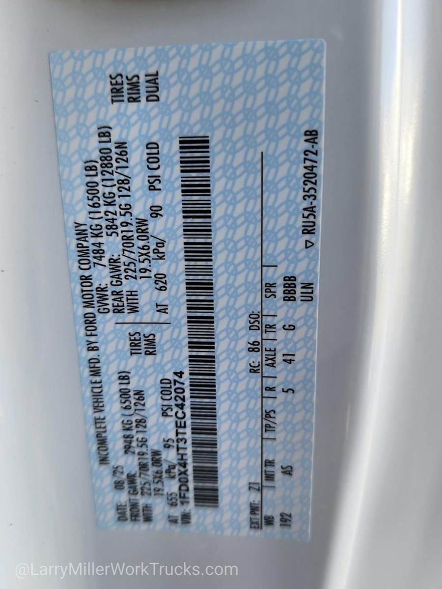 Options: 153 18B 41H 41P 425 43C 44G 51D 572 59H 61J 650A 67A 86M 872 96V 99T AS TGJ X41 Z1,4.10 AXLE RATIO,REAR VIEW CAMERA & PREP KIT -inc: Pre-installed content includes cab wiring and frame wiring to the rear most cross member Upfitters kit includes camera w/mounting bracket 20' jumper wire and camera mounting/aiming instructions,350 AMP DUAL ALTERNATORS -inc: 190 Amp + 160 Amp,ENGINE BLOCK HEATER,OXFORD WHITE,XL CHROME PACKAGE -inc: Privacy Glass w/Power Sliding Rear Glass Halogen Fog Lamps Bright Grille Remote Start Chrome Front Bumper Rear Window Defroster,TRANSMISSION: TORQSHIFT 10-SPEED AUTOMATIC -inc: SelectShift selectable drive modes: normal tow/haul eco slippery roads and off-road and transmission power take-off provision (STD),PRO POWER ONBOARD - 400W OUTLET -inc: 1 in-dash mounted outlet,ENGINE: 6.7L 4V OHV POWER STROKE V8 TURBO DIESEL B20 -inc: Operator Commanded Regeneration (OCR) Diesel Exhaust Fluid (DEF) tank and manual push-button engine-exhaust braking 4.10 Axle Ratio 250 Amp Alternator Dual 68 AH/65 AGM Battery,PLATFORM RUNNING BOARDS,MEDIUM DARK SLATE HD VINYL 40/20/40 SPLIT BENCH SEAT -inc: center armrest cupholder storage and driver's side manual lumbar,FRONT LICENSE PLATE BRACKET,6-TON HYDRAULIC JACK,SPARE TIRE & WHEEL DELETE,DUAL 68 AH/65 AGM BATTERY,TRANSFER CASE SKID PLATES,TIRES: 225/70RX19.5G BSW A/P (STD),CENTER HIGH-MOUNTED STOP LAMP (CHMSL),ORDER CODE 650A,Four Wheel Drive,Power Steering,Dual Rear Wheels,ABS,4-Wheel Disc Brakes,Brake Assist,Steel Wheels,Tires - Front All-Season,Tires - Rear All-Season,Tow Hooks,Heated Mirrors,Power Mirror(s),Integrated Turn Signal Mirrors,Intermittent Wipers,Variable Speed Intermittent Wipers,Daytime Running Lights,Automatic Headlights,AM/FM Stereo,Steering Wheel Audio Controls,Auxiliary Audio Input,Pass-Through Rear Seat,Rear Bench Seat,Adjustable Steering Wheel,Keyless Entry,Cruise Control,A/C,Vinyl Seats,Split Bench Seat,Driver Adjustable Lumbar,Passenger Vanity Mirror,WiFi Hotspot,Security System,Immobilizer,Traction Control,Front Side Air Bag,Lane Departure Warning,Front Collision Mitigation,Tire Pressure Monitor,Driver Air Bag,Passenger Air Bag,Passenger Air Bag On/Off Switch,Front Head Air Bag,Rear Head Air Bag