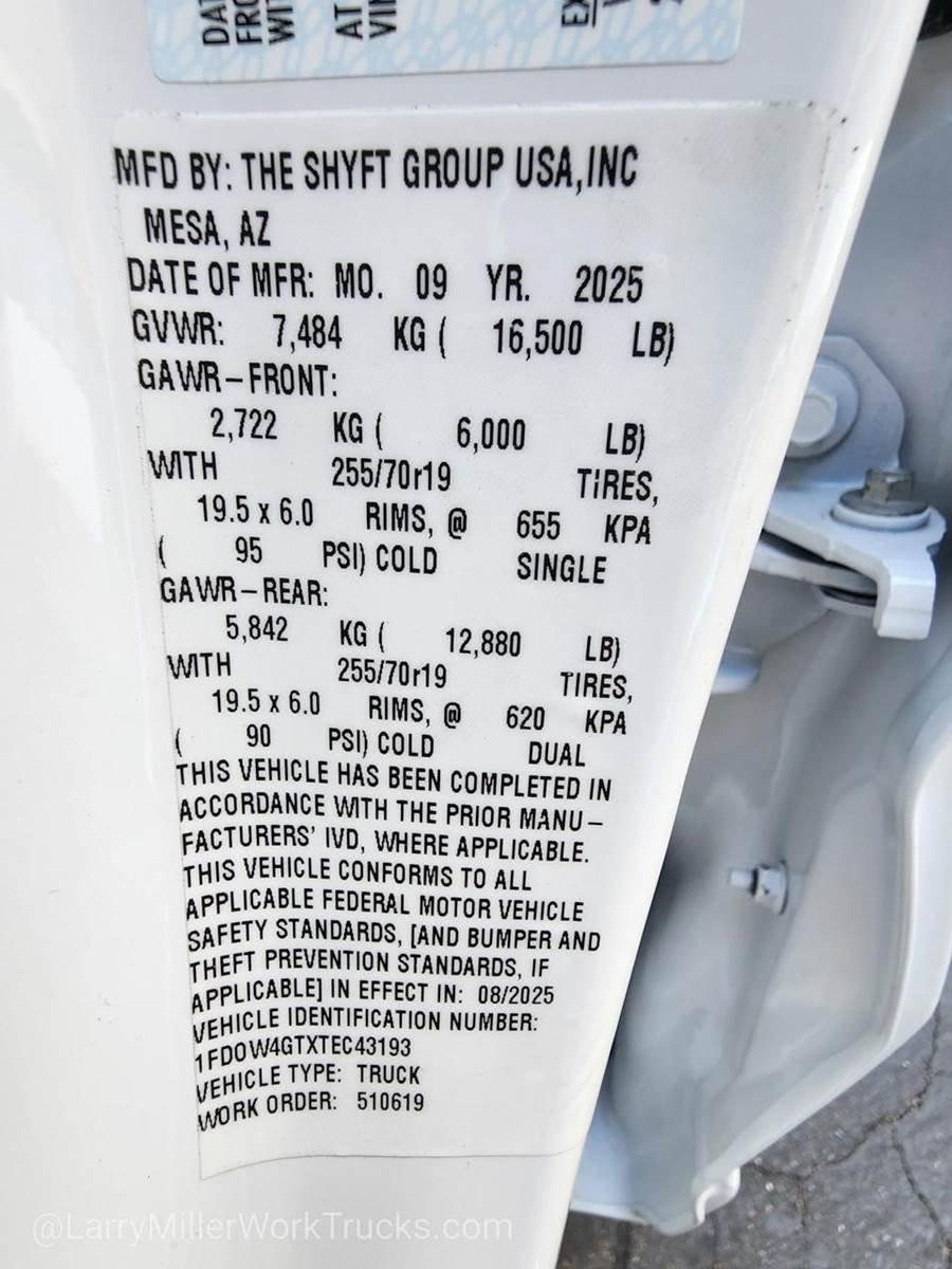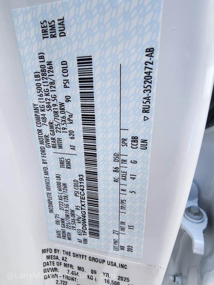 Options: 1 153 1S 205 425 44G 512 52B 572 59H 61J 650A 86M 872 96V 99T TGJ X41 Z1,OXFORD WHITE,ENGINE: 6.7L 4V OHV POWER STROKE V8 TURBO DIESEL B20  -inc: Operator Commanded Regeneration (OCR)  Diesel Exhaust Fluid (DEF) tank and manual push-button engine-exhaust braking  4.10 Axle Ratio  250 Amp Alternator  Dual 68 AH/65 AGM Battery,6-TON HYDRAULIC JACK,REAR VIEW CAMERA & PREP KIT  -inc: Pre-installed content includes cab wiring and frame wiring to the rear most cross member  Upfitters kit includes camera w/mounting bracket  20' jumper wire and camera mounting/aiming instructions,DUAL 68 AH/65 AGM BATTERY,FRONT LICENSE PLATE BRACKET,SPARE TIRE & WHEEL  -inc: Excludes carrier  6-Ton Hydraulic Jack,4.10 AXLE RATIO,ORDER CODE 650A,TRAILER BRAKE CONTROLLER,TIRES: 225/70RX19.5G BSW A/P  (STD),CENTER HIGH-MOUNTED STOP LAMP (CHMSL),TRANSMISSION: TORQSHIFT 10-SPEED AUTOMATIC  -inc: SelectShift  selectable drive modes: normal  tow/haul  eco  slippery roads and trail and transmission power take-off provision (STD),XL CHROME PACKAGE  -inc: Privacy Glass w/Power Sliding Rear Glass  Halogen Fog Lamps  Bright Grille  Remote Start  Chrome Front Bumper  Rear Window Defroster,MEDIUM DARK SLATE  CLOTH 40/20/40 SPLIT BENCH SEAT  -inc: center armrest  cupholder  storage and driver's side manual lumbar,Rear Wheel Drive,Power Steering,Dual Rear Wheels,ABS,4-Wheel Disc Brakes,Brake Assist,Steel Wheels,Tires - Front All-Season,Tires - Rear All-Season,Tow Hooks,Heated Mirrors,Power Mirror(s),Integrated Turn Signal Mirrors,Intermittent Wipers,Variable Speed Intermittent Wipers,Daytime Running Lights,Automatic Headlights,AM/FM Stereo,MP3 Capability,MP3 Capability,Steering Wheel Audio Controls,Bluetooth Connection,Telematics,Auxiliary Audio Input,Smart Device Integration,Requires Subscription,Bluetooth Connection,Pass-Through Rear Seat,Rear Bench Seat,Adjustable Steering Wheel,Trip Computer,Power Windows,Keyless Entry,Power Door Locks,Cruise Control,A/C,Split Bench Seat,Driver Adjustable Lumbar,Passenger Vanity Mirror,Smart Device Integration,Requires Subscription,Smart Device Integration,WiFi Hotspot,Power Windows,Power Door Locks,Trip Computer,Security System,Immobilizer,Traction Control,Front Side Air Bag,Telematics,Requires Subscription,Lane Departure Warning,Front Collision Mitigation,Tire Pressure Monitor,Front Head Air Bag,Rear Head Air Bag,Driver Air Bag,Passenger Air Bag,Child Safety Locks
