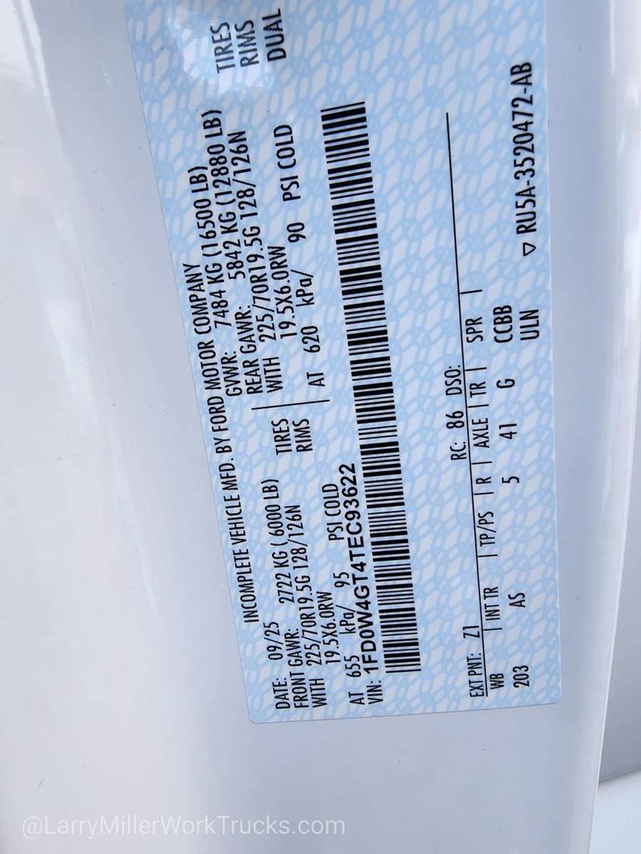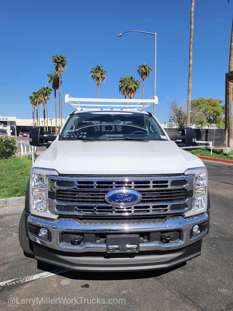 Options: 153 18B 425 43C 44G 51D 52B 572 61J 650A 67A 86M 872 96V 99T AS TGJ X41 Z1,OXFORD WHITE,ENGINE: 6.7L 4V OHV POWER STROKE V8 TURBO DIESEL B20 -inc: Operator Commanded Regeneration (OCR) Diesel Exhaust Fluid (DEF) tank and manual push-button engine-exhaust braking 4.10 Axle Ratio 250 Amp Alternator Dual 68 AH/65 AGM Battery,PLATFORM RUNNING BOARDS,MEDIUM DARK SLATE HD VINYL 40/20/40 SPLIT BENCH SEAT -inc: center armrest cupholder storage 2-way adjustable driver/passenger headrests and driver's side manual lumbar,6-TON HYDRAULIC JACK,REAR VIEW CAMERA & PREP KIT -inc: Pre-installed content includes cab wiring and frame wiring to the rear most cross member Upfitters kit includes camera w/mounting bracket 20' jumper wire and camera mounting/aiming instructions,SPARE TIRE & WHEEL DELETE,DUAL 68 AH/65 AGM BATTERY,FRONT LICENSE PLATE BRACKET,PRO POWER ONBOARD - 400W OUTLET -inc: 1 in-dash mounted outlet,4.10 AXLE RATIO,ORDER CODE 650A,TRAILER BRAKE CONTROLLER,TIRES: 225/70RX19.5G BSW A/P (STD),350 AMP DUAL ALTERNATORS -inc: 190 Amp + 160 Amp,TRANSMISSION: TORQSHIFT 10-SPEED AUTOMATIC -inc: SelectShift selectable drive modes: normal tow/haul eco slippery roads and trail and transmission power take-off provision (STD),XL CHROME PACKAGE -inc: Privacy Glass w/Power Sliding Rear Glass Halogen Fog Lamps Bright Grille Remote Start Chrome Front Bumper Rear Window Defroster,Rear Wheel Drive,Power Steering,Dual Rear Wheels,ABS,4-Wheel Disc Brakes,Brake Assist,Steel Wheels,Tires - Front All-Season,Tires - Rear All-Season,Tow Hooks,Heated Mirrors,Power Mirror(s),Integrated Turn Signal Mirrors,Intermittent Wipers,Variable Speed Intermittent Wipers,Daytime Running Lights,Automatic Headlights,AM/FM Stereo,Steering Wheel Audio Controls,Auxiliary Audio Input,Pass-Through Rear Seat,Rear Bench Seat,Adjustable Steering Wheel,Keyless Entry,Cruise Control,A/C,Vinyl Seats,Split Bench Seat,Driver Adjustable Lumbar,Passenger Vanity Mirror,WiFi Hotspot,Security System,Immobilizer,Traction Control,Front Side Air Bag,Lane Departure Warning,Front Collision Mitigation,Tire Pressure Monitor,Front Head Air Bag,Rear Head Air Bag,Driver Air Bag,Passenger Air Bag,Child Safety Locks