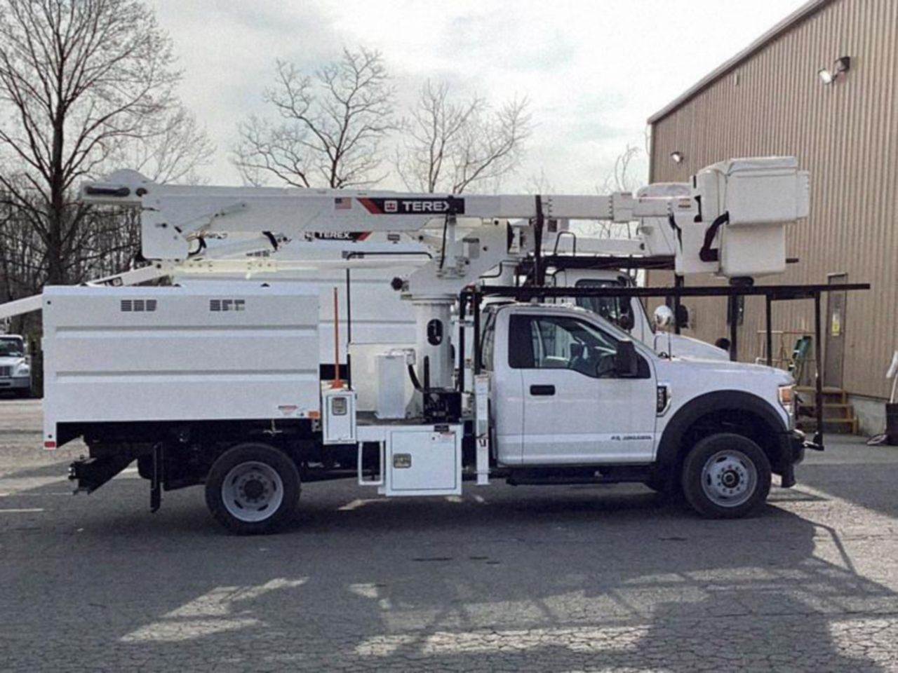 FOR SALE! A brand new Ford F550 4x4 chip truck upfitted with a Terex LT40 forestry bucket. This vehicle is powered by a 330 hp Ford 6.7L diesel motor, and gears are shifted via an Allison 10-speed automatic transmission. The FAWR is 7,500 lbs and the rear is rated at 14,706 lbs. The upfitted Terex LT40 offers a working height of 45.6 ft and a max side reach of 29.4 ft. Contact for more information! Located in Lynchburg, VA.