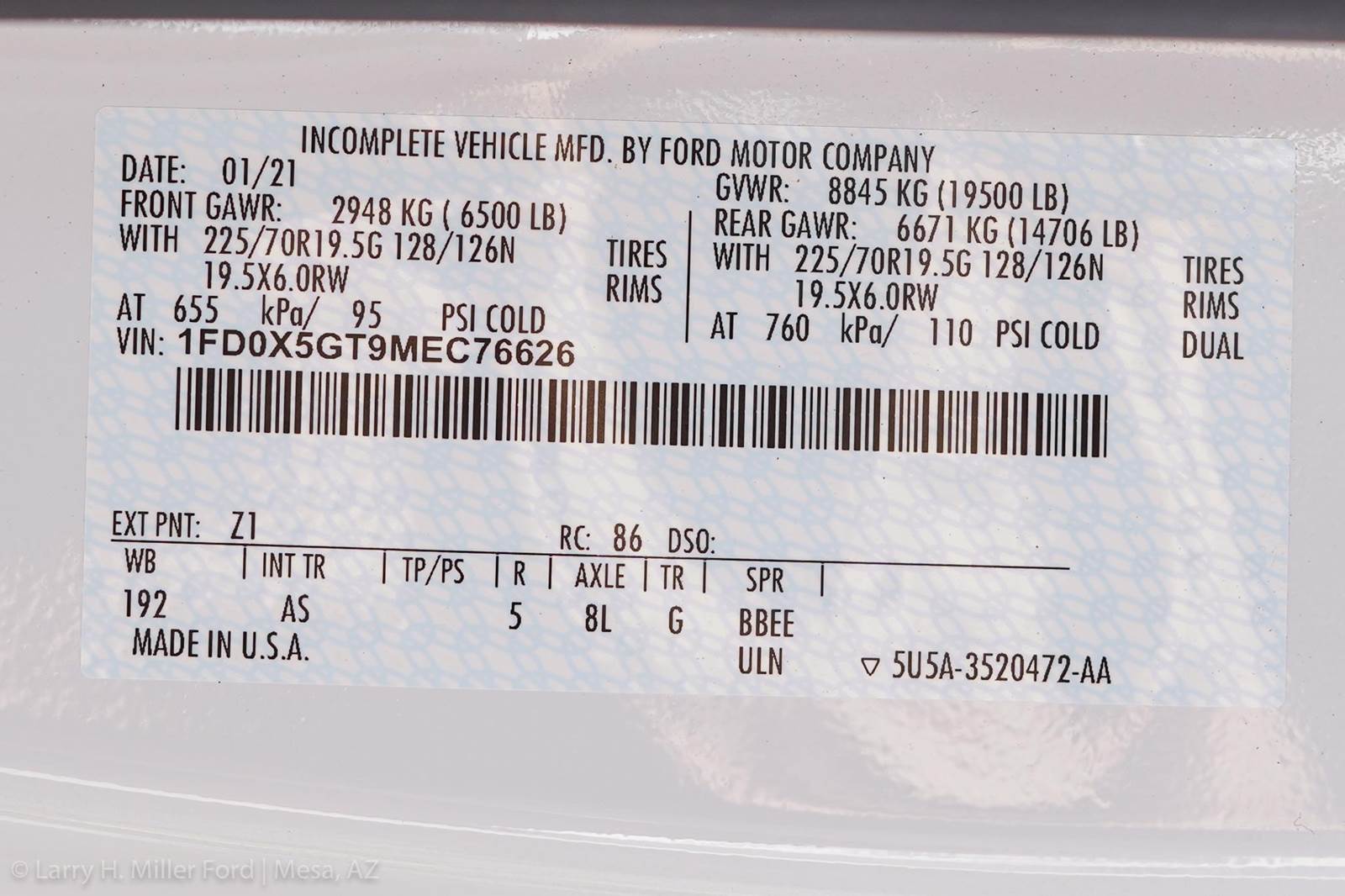 19500# GVWR. 50 states emissions. 4.30 limited slip axle. NO Spare Tire.