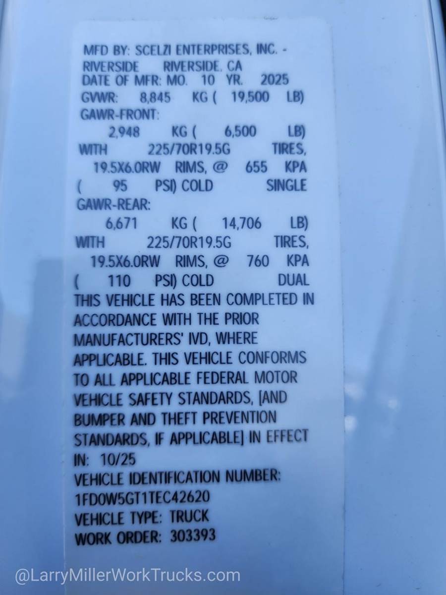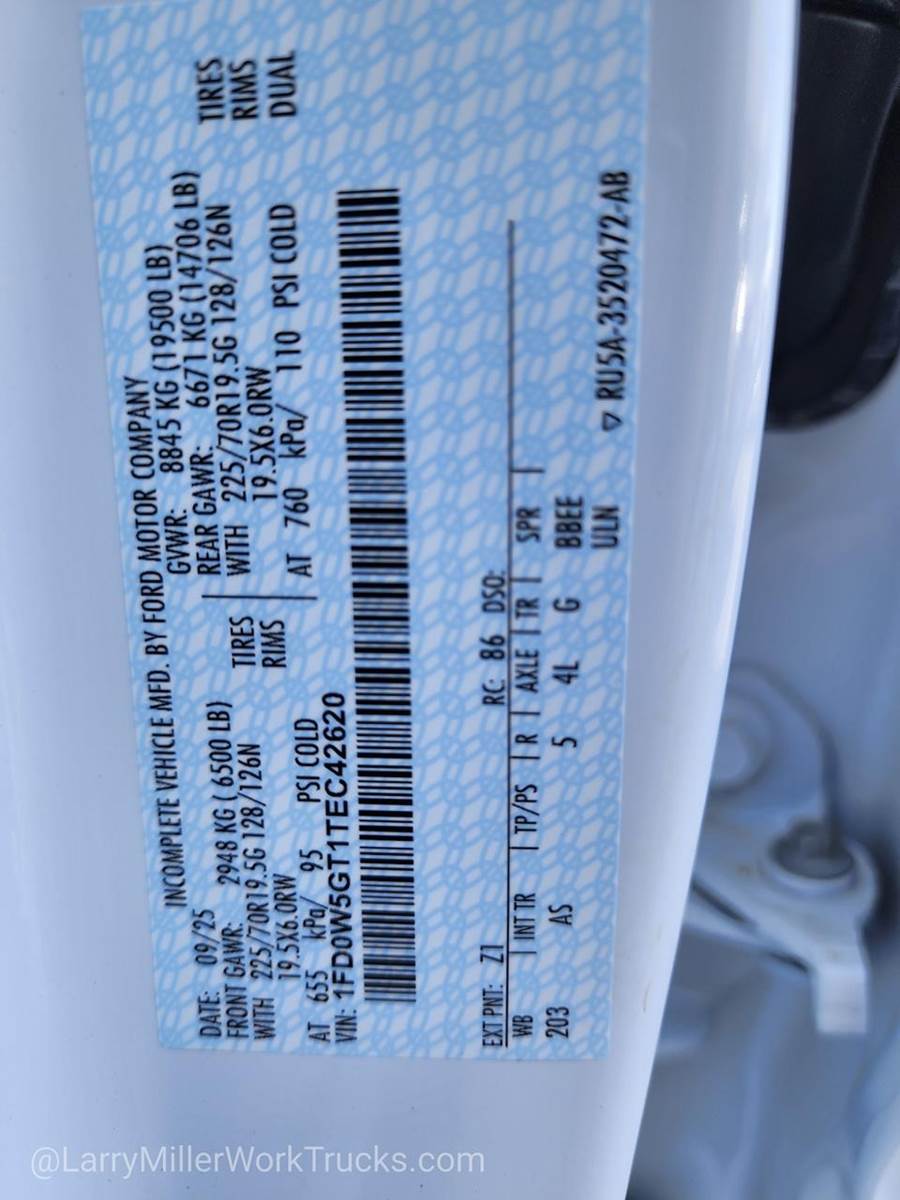 Options: 153 18B 425 43C 44G 51D 52B 535 572 61J 65Z 660A 67A 68M 86M 872 96V 99T AS TGJ X4L Z1,REAR VIEW CAMERA & PREP KIT -inc: Pre-installed content includes cab wiring and frame wiring to the rear most cross member Upfitters kit includes camera w/mounting bracket 20' jumper wire and camera mounting/aiming instructions,350 AMP DUAL ALTERNATORS -inc: 190 Amp + 160 Amp,HIGH CAPACITY TRAILER TOW PACKAGE -inc: trailer brake wiring kit Increases GCW from 32 500 lbs to 40 000 lbs Note: Salesperson's Portfolio or Trailer Towing Guide should be consulted for specific trailer towing or camper limits and corresponding required equipment axle ratios and model availability See Supplemental Reference for vehicle height consideration,OXFORD WHITE,XL CHROME PACKAGE -inc: Privacy Glass w/Power Sliding Rear Glass Halogen Fog Lamps Bright Grille Remote Start Chrome Front Bumper Rear Window Defroster,PRO POWER ONBOARD - 400W OUTLET -inc: 1 in-dash mounted outlet,ENGINE: 6.7L 4V OHV POWER STROKE V8 TURBO DIESEL B20 -inc: Operator Commanded Regeneration (OCR) Diesel Exhaust Fluid (DEF) tank and manual push-button engine-exhaust braking 4.10 Axle Ratio 250 Amp Alternator Dual 68 AH/65 AGM Battery,PLATFORM RUNNING BOARDS,6-TON HYDRAULIC JACK,LIMITED SLIP W/4.30 AXLE RATIO,SPARE TIRE & WHEEL DELETE,TRAILER BRAKE CONTROLLER,DUAL 68 AH/65 AGM BATTERY,FRONT LICENSE PLATE BRACKET,TRANSMISSION: TORQSHIFT 10-SPEED AUTOMATIC -inc: SelectShift selectable drive modes: normal tow/haul eco slippery roads and trail and transmission power take-off provision (STD),TIRES: 225/70RX19.5G BSW A/P (STD),GVWR: 19 500 LB PAYLOAD PLUS UPGRADE PACKAGE 1 -inc: upgraded frame upgraded rear-axle and low deflection/high capacity rear springs Increases max RGAWR to 14 706 lbs Note: See Order Guide Supplemental Reference for further details on GVWR,ORDER CODE 660A,MEDIUM DARK SLATE HD VINYL 40/20/40 SPLIT BENCH SEAT -inc: center armrest cupholder storage 2-way adjustable driver/passenger headrests and driver's side manual lumbar,Rear Wheel Drive,Power Steering,Dual Rear Wheels,ABS,4-Wheel Disc Brakes,Brake Assist,Steel Wheels,Tires - Front All-Season,Tires - Rear All-Season,Tow Hooks,Heated Mirrors,Power Mirror(s),Integrated Turn Signal Mirrors,Intermittent Wipers,Variable Speed Intermittent Wipers,Daytime Running Lights,Automatic Headlights,AM/FM Stereo,Steering Wheel Audio Controls,Auxiliary Audio Input,Pass-Through Rear Seat,Rear Bench Seat,Adjustable Steering Wheel,Keyless Entry,Cruise Control,A/C,Vinyl Seats,Split Bench Seat,Driver Adjustable Lumbar,Passenger Vanity Mirror,WiFi Hotspot,Security System,Immobilizer,Traction Control,Front Side Air Bag,Lane Departure Warning,Front Collision Mitigation,Tire Pressure Monitor,Front Head Air Bag,Rear Head Air Bag,Driver Air Bag,Passenger Air Bag,Child Safety Locks