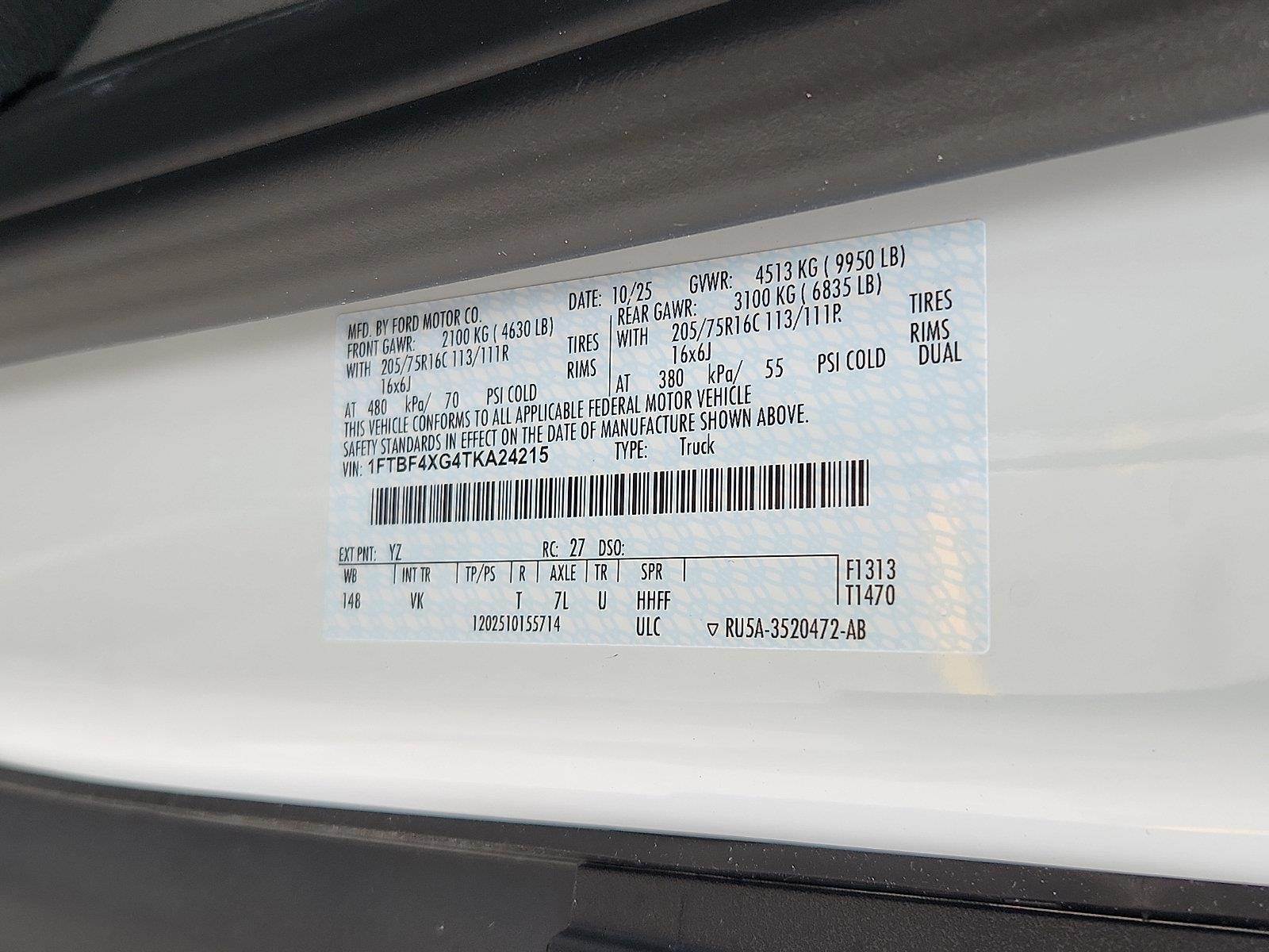 Check out all these great options on this vehicle: Ford Co-Pilot360 Assist 2.0 (Adaptive Cruise Control w/Lane Centering, Front Fog Lamps, Reverse Brake Assist, Side Parking Sensors, and SiriusXM with 360L), Ford Connectivity Package (1-Year Included), Heavy-Duty Trailer Tow Package (Frame Mounted Hitch Receiver and Tow/Haul Mode with Trailering Wiring Provisions), Load Area Protection Package (Front and Rear Vinyl Floor Covering), Order Code 101A (AM/FM Stereo, Dark Palazzo Gray Vinyl Bucket Seats, SYNC 4, Vinyl Front Bucket Seats, and Wheels: 16" Heavy Duty Silver Steel), 2 Additional Keys (4 Total), 4 Speakers, 4-Wheel Disc Brakes, ABS brakes, Air Conditioning, AM/FM radio, Apple CarPlay/Android Auto, Auto High-beam Headlights, Brake assist, Dark Palazzo Gray Vinyl Bucket Seats with Armrests, Delay-off headlights, Driver door bin, Driver's Seat Mounted Armrest, Dual AGM Batteries (70 Amp-Hr Each), Dual front impact airbags, Dual front side impact airbags, Dual rear wheels, Electronic Stability Control, Emergency communication system: 911 Assist, Exterior Parking Camera Rear, Front All-Weather Floor Mats, Front anti-roll bar, Front Bucket Seats, Front License Plate Bracket, Front reading lights, Front wheel independent suspension, Full Rear Compartment Lighting, Fully automatic headlights, Illuminated entry, Keyless Entry Keypad, Large Center Console, Low tire pressure warning, Midship Extended Range Fuel Tank (31 Gallons), Navigation system: Connected Navigation, Occupant sensing airbag, Overhead airbag, Panic alarm, Passenger cancellable airbag, Passenger door bin, Power door mirrors, Power steering, Power windows, Rain sensing wipers, Remote keyless entry, Speed control, Steering wheel mounted audio controls, Tachometer, Telescoping steering wheel, Tilt steering wheel, Traction control, Trailer Brake Controller, and Variably intermittent wipers.
