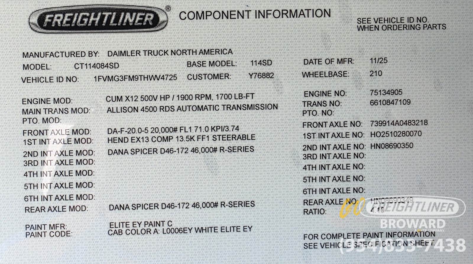 *2026 Freightliner 114SD Tri Axle Chassis to Fit 17' Dump -- Cummins X12 Diesel -- Allison Automatic** Cummins X12 Diesel -- 500 HP / 660 lb-ft torque* Allison 4500 RDS Automatic Transmission* 70-Gallon Fuel Tank* 20,000 lb Front / 46,000 lb Rear Axle -- 4.10 Ratio -- Tandem Rear Axle* 13,300 lb Lift Axle Dump*Exterior/Interior** White Exterior* Rugged Black Cloth & Gray/Carbon Vinyl Interior* Elite Heated, Vented, High-Back Air Suspension Driver Seat* Power Windows, Heated Power Mirrors, HVAC* AM/FM/WB Radio, Bluetooth, USB/AUX, iPod Interface, Digital Dash*Additional Features** 10 Polished Aluminum Wheels* Wabco 4S/4M ABS with Traction Control* Locking Differential, Rear Axles* PTO Provision* Front and Rear Haldex Automatic Slack Adjusters* Wiring for Backup Camera* Fuel Sense 2.0 Plus