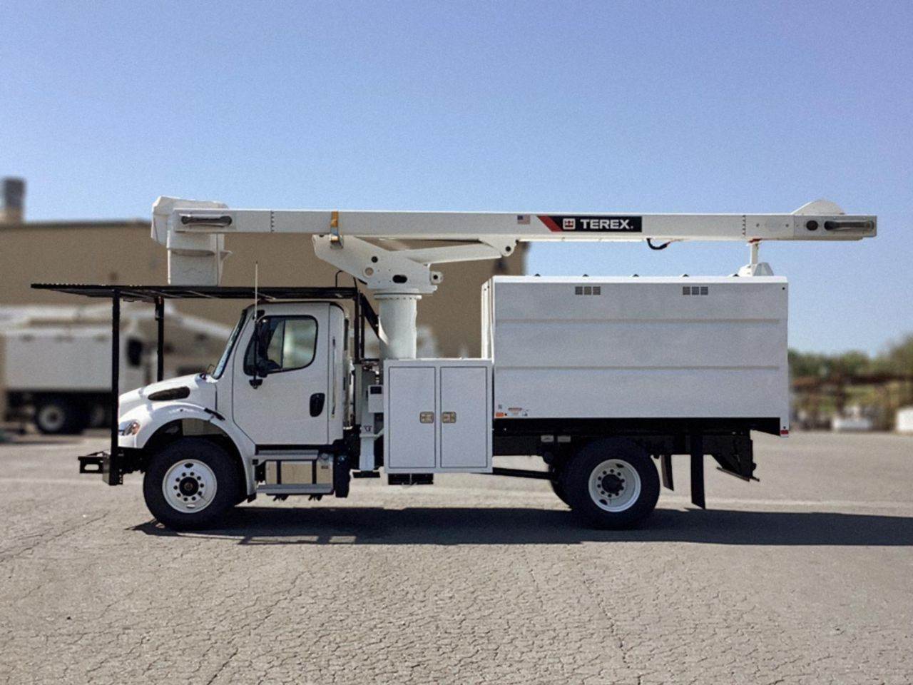 FOR SALE! A brand new Freightliner M2106 4x2 upfitted with a Terex XT PRO 56-BOC-F-PC forestry bucket. This vehicle is powered by a 220 hp Cummins 6.7L diesel motor, and gears are shifted via a 6-speed automatic transmission. The FAWR is 12k lbs and the rear is rated at 21k lbs. The upfitted XT PRO 56-BOC-F-PC offers a max working height of 61 ft, and the 24" x 24" x 40" platform is rated at 400 lbs. Also features a chipper body. Contact for more information! Vehicle located in Lynchburg, VA. FET included in price.