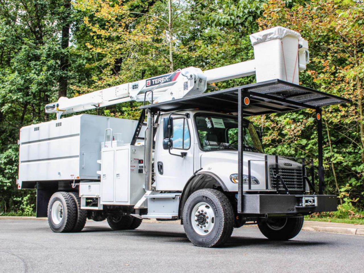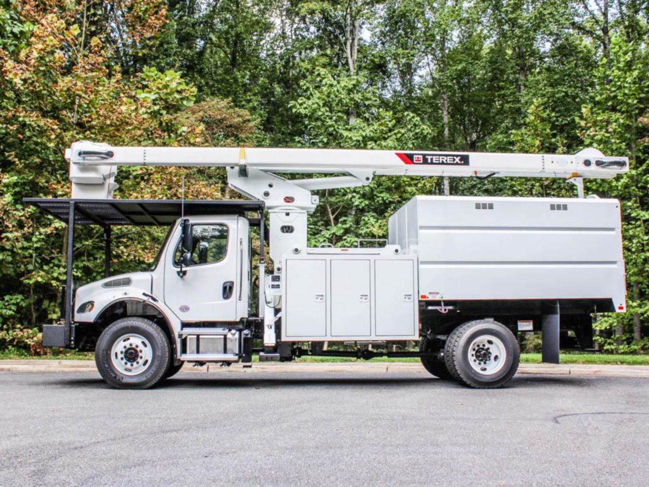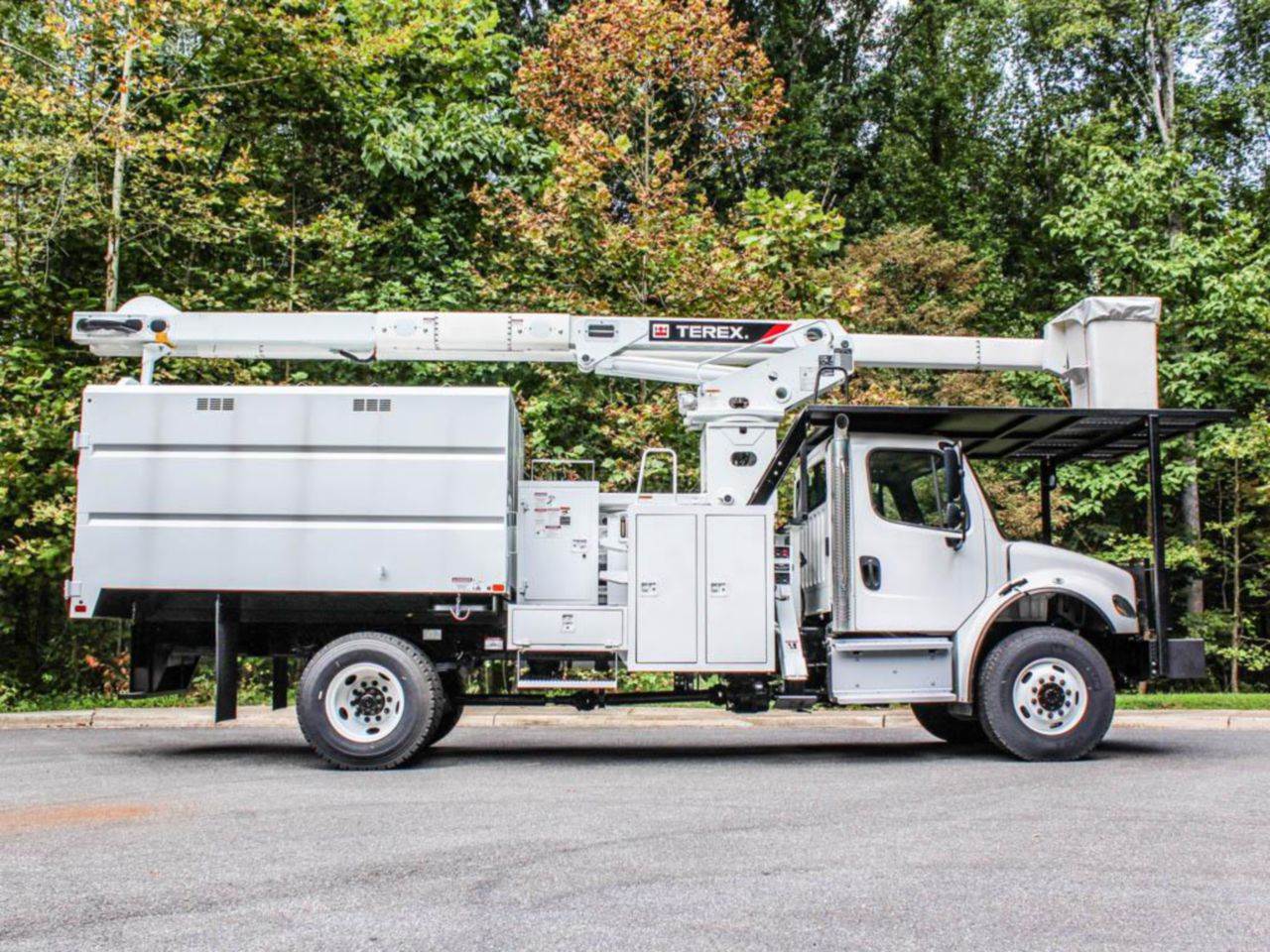FOR SALE! A brand new Freightliner M2106 4x4 forestry bucket truck upfitted with a Terex XT PRO 60/70-BOC-F-PC. This vehicle is powered by a 250 hp Cummins 6.7L diesel motor, and gears are shifted via a 6-speed automatic transmission. The FAWR is 16k lbs and the rear is rated at 21k lbs. The upfitted Terex XT PRO 60/70-BOC-F-PC offers a max working height of 75 ft and a side reach of 49.9 ft. Also features a chipper body. Contact for more information!