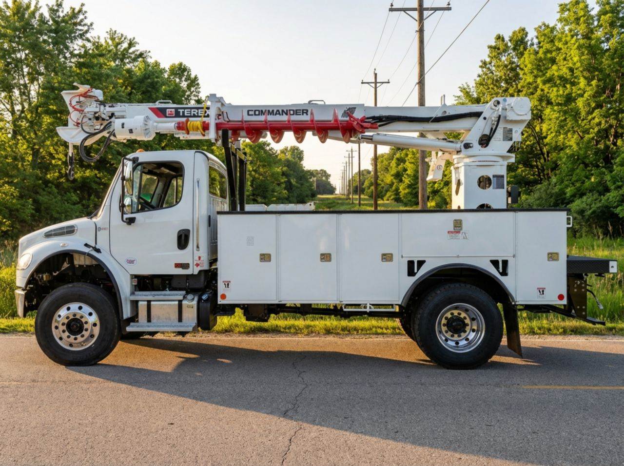 FOR SALE! A brand new Freightliner M2106 4x4 upfitted with a Terex Commander 4047 digger derrick. This vehicle is powered by a 300 hp Cummins L9 diesel motor, and gears are shifted via an Allison automatic transmission. The FAWR is 14k lbs and the rear is rated at 21k lbs. The upfitted Terex Commander 4047 digger derrick offers a max sheave height of 47.4 ft and a max horizontal reach of 37.5 ft. The max capacity is 24,750 lbs. Contact for more information! FET included in price.