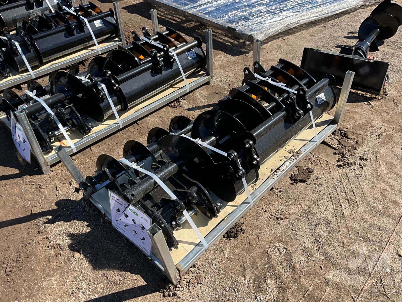 UNUSED QTY OF (8) VARIOUS MINI EXCAVATOR ATTACHMENTS, 25MM MM PIN, RAKE, RIPPER, GRABBER,12" AUGER, 16" AUGER,8" BUCKET, 24" BUCKET, 32" BUCKET