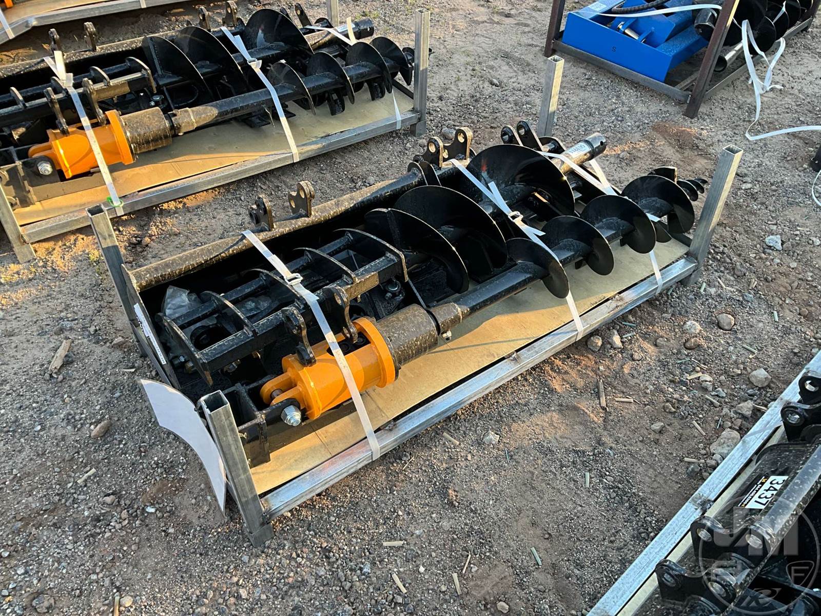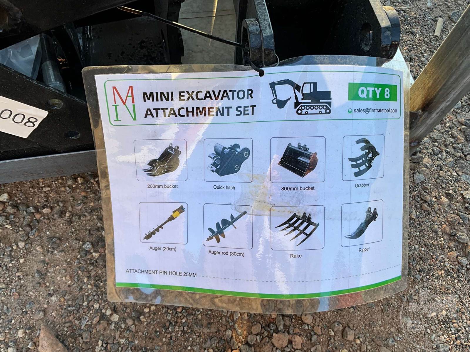UNUSED QTY OF (8) MINI EXCAVATOR ATTACHMENTS, 25 MM PIN, INCLUDES A 19" RAKE, 31" BUCKET, 7" BUCKET, 8" HYDRAULIC AUGER, 12" AUGER ROD, 15" GRABBER, QUICK COUPLER, & RIPPER