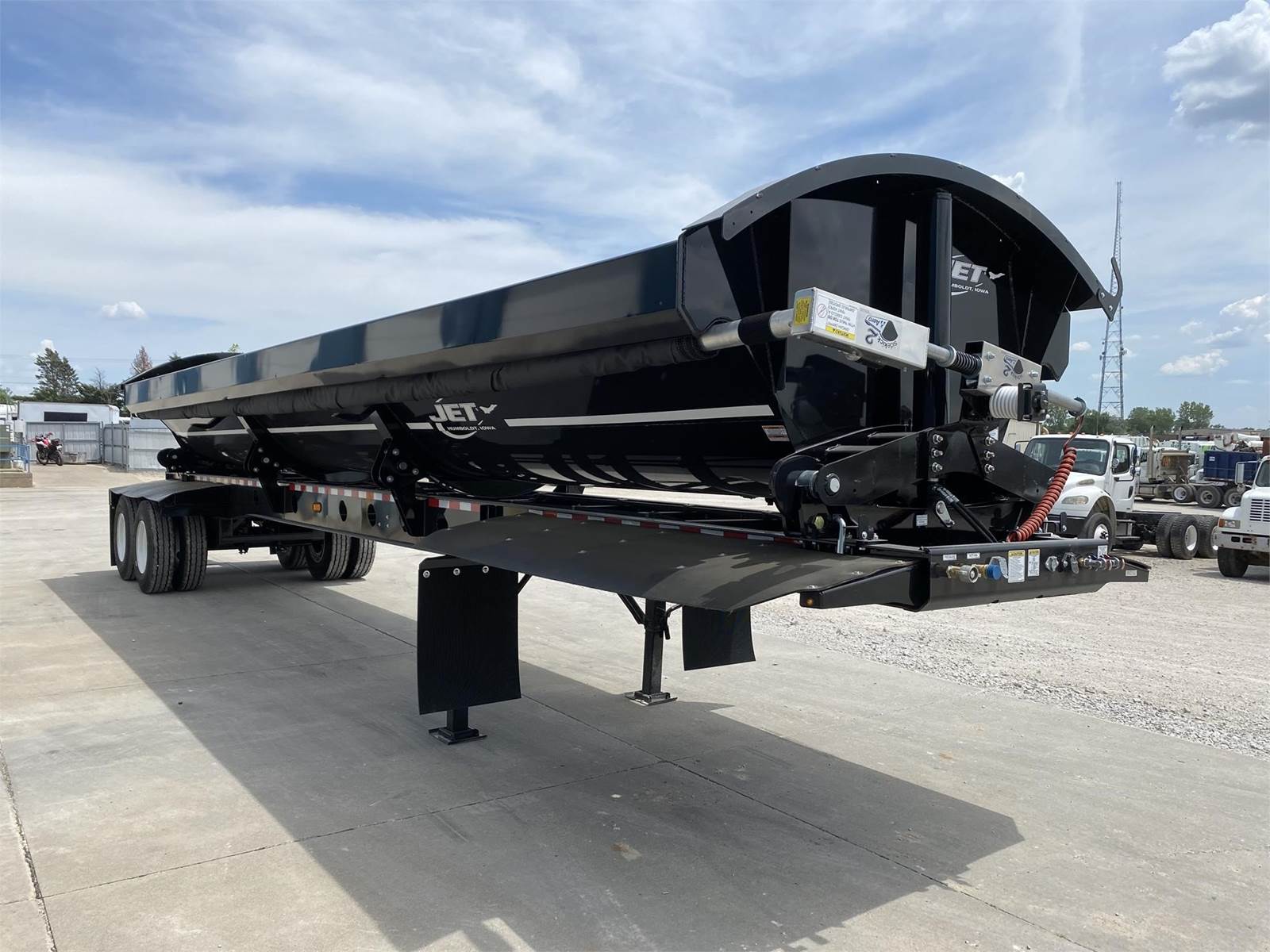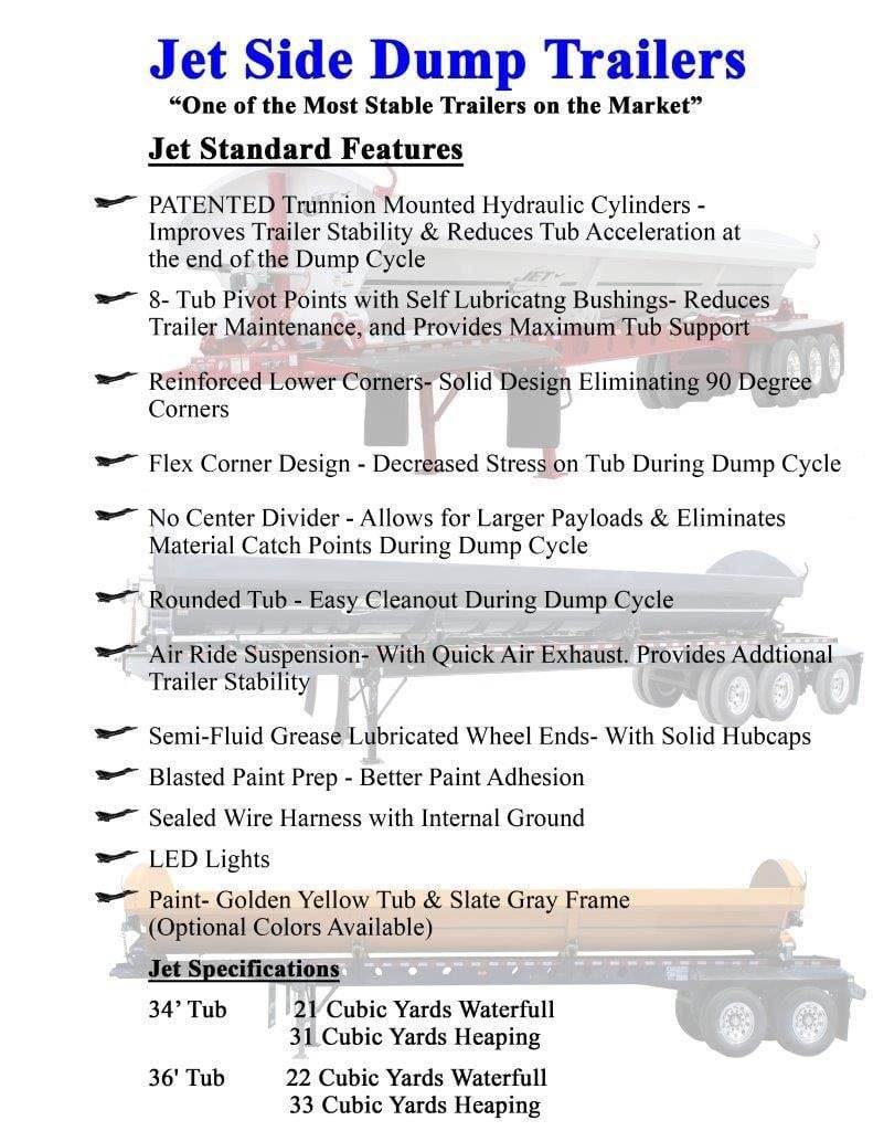 (FET INCLUDED AND PRICE IS FOB THE FACTORY) Coming Soon! 2026 Jet 40'x102" Tandem Axle Side Dump, 34' Round Bottom Tub, Air Ride Suspension, 18" King Pin, Front & Rear Fenders, Black Chassis & Tub, 11R22.5 Tires, Aluminum Outer Wheels, Electric Tarp, Electric Hydraulic Valve, Remote Grease Line Kit, 21 cu. yd. Capacity Waterfull, 31 cu yd Capacity Heaping