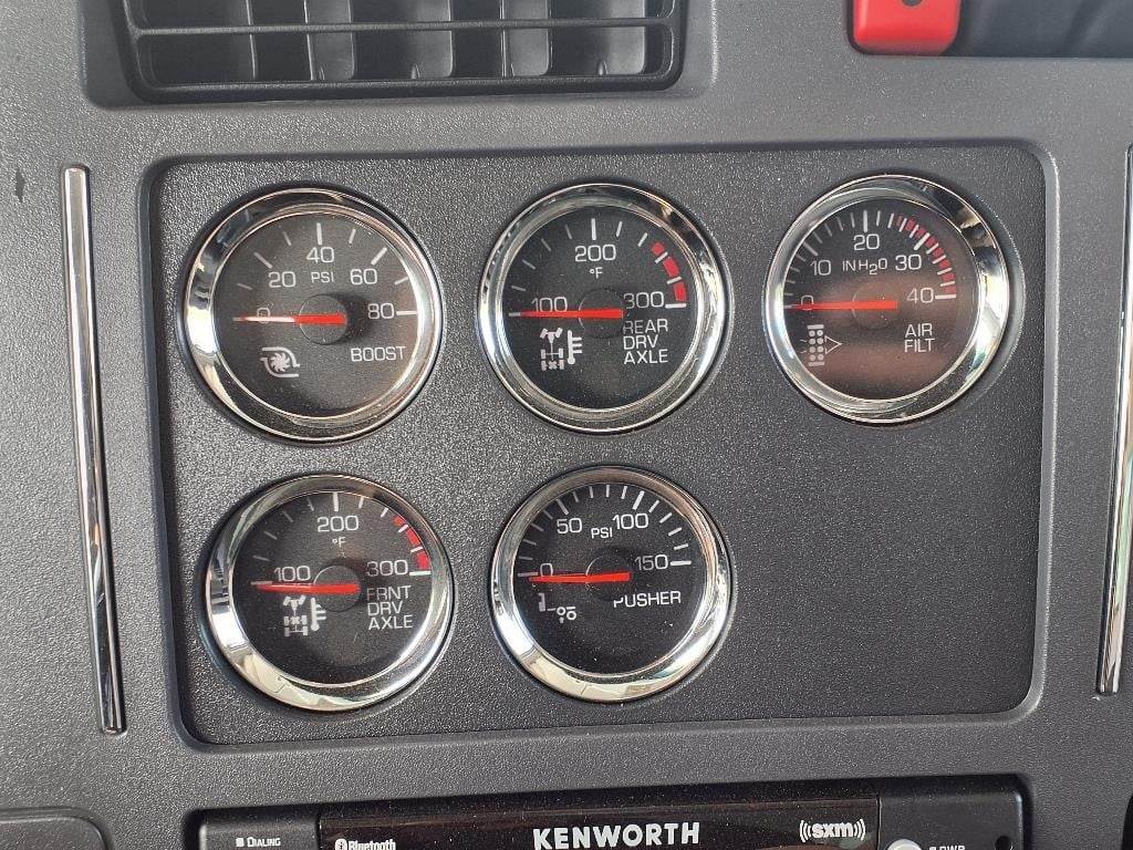 Kenworth Smart Wheel, power door locks, power windows, tilt/telescoping steering wheel, heated power mirrors, air conditioning with auto temperature control, AM/FM/WB/USB radio with Bluetooth, CB installation kit, air horn, exterior stainless steel sunvisor, polished aluminum bumper, dual LED floodlights, TruckTech+ remote diagnostics, 15" digital display main instrument package.