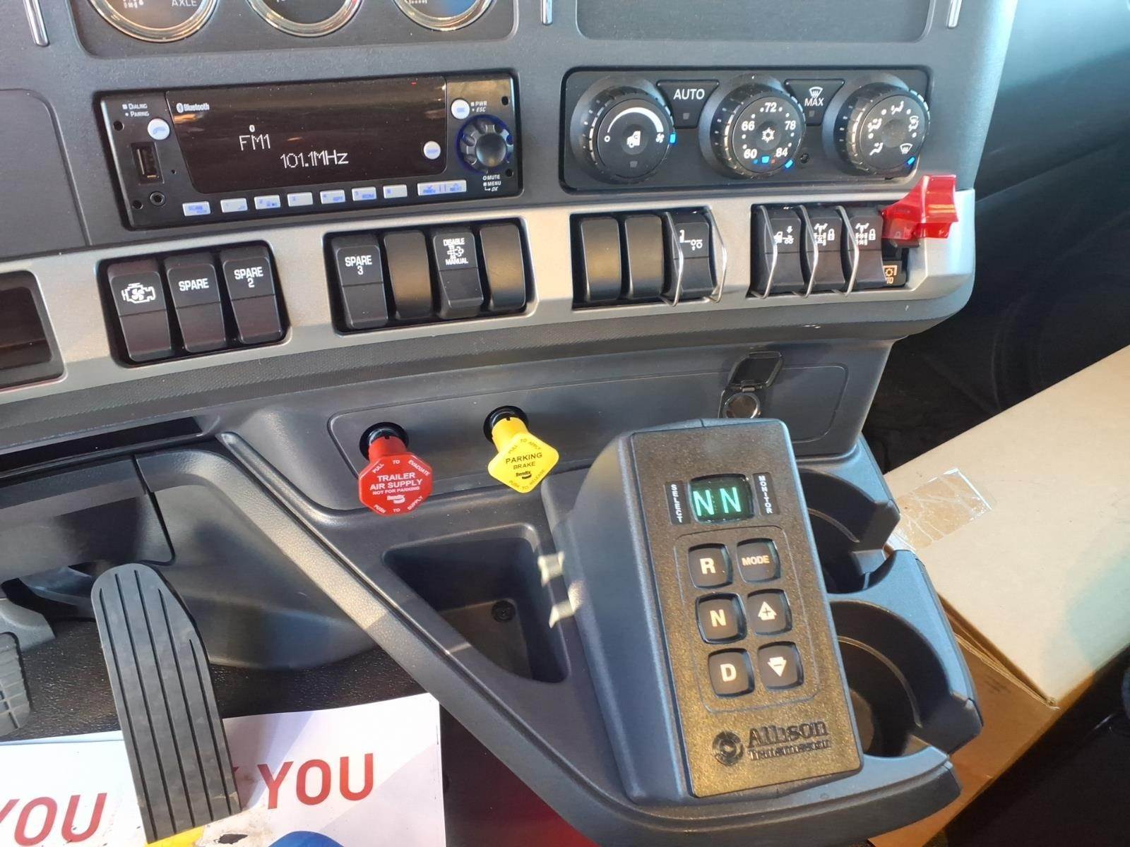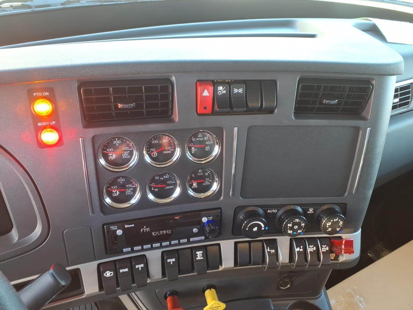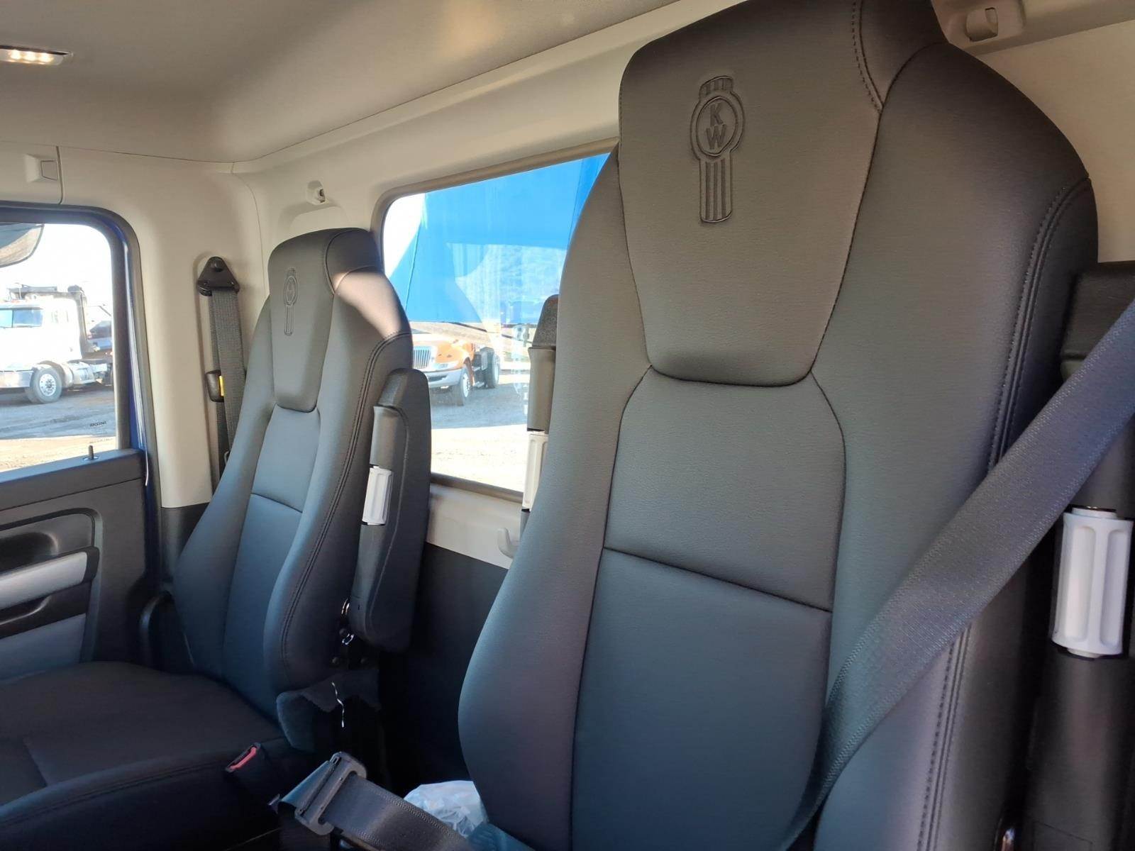 Power windows, power door locks, tilt/telescoping steering wheel, Kenworth Smart Wheel with integrated radio and cruise controls, heated power mirrors, air conditioning with auto temperature control, 15" digital display main instrument package, Kenworth radio DEA710 AM/FM/WB/USB with Bluetooth, CB installation kit, dual air horns, exterior stainless steel sun visor, polished aluminum tapered channel front bumper, dual chrome exhaust elbows