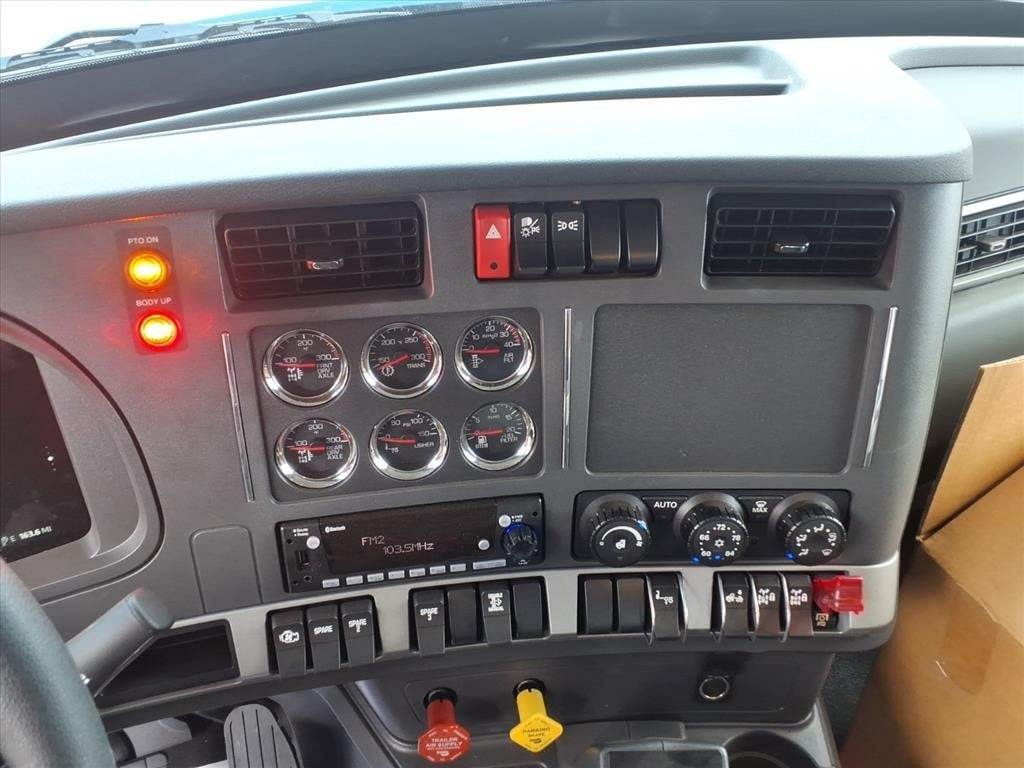 Power windows, power door locks, tilt/telescoping steering wheel, Kenworth Smart Wheel with integrated radio and cruise controls, heated power mirrors, air conditioning with auto temperature control, 15" digital display main instrument package, Kenworth radio DEA710 AM/FM/WB/USB with Bluetooth, CB installation kit, dual air horns, exterior stainless steel sun visor, polished aluminum tapered channel front bumper, dual chrome exhaust elbows