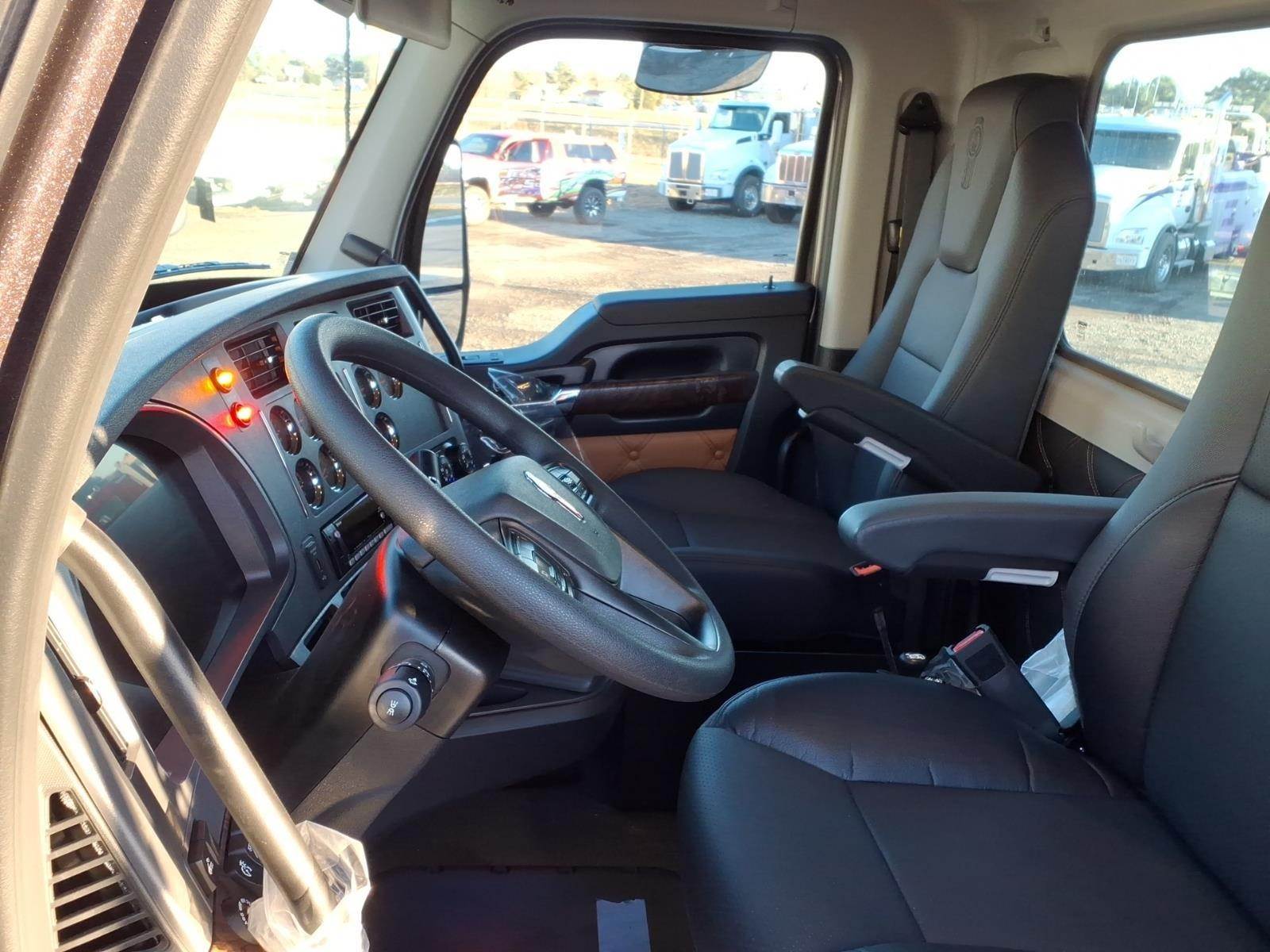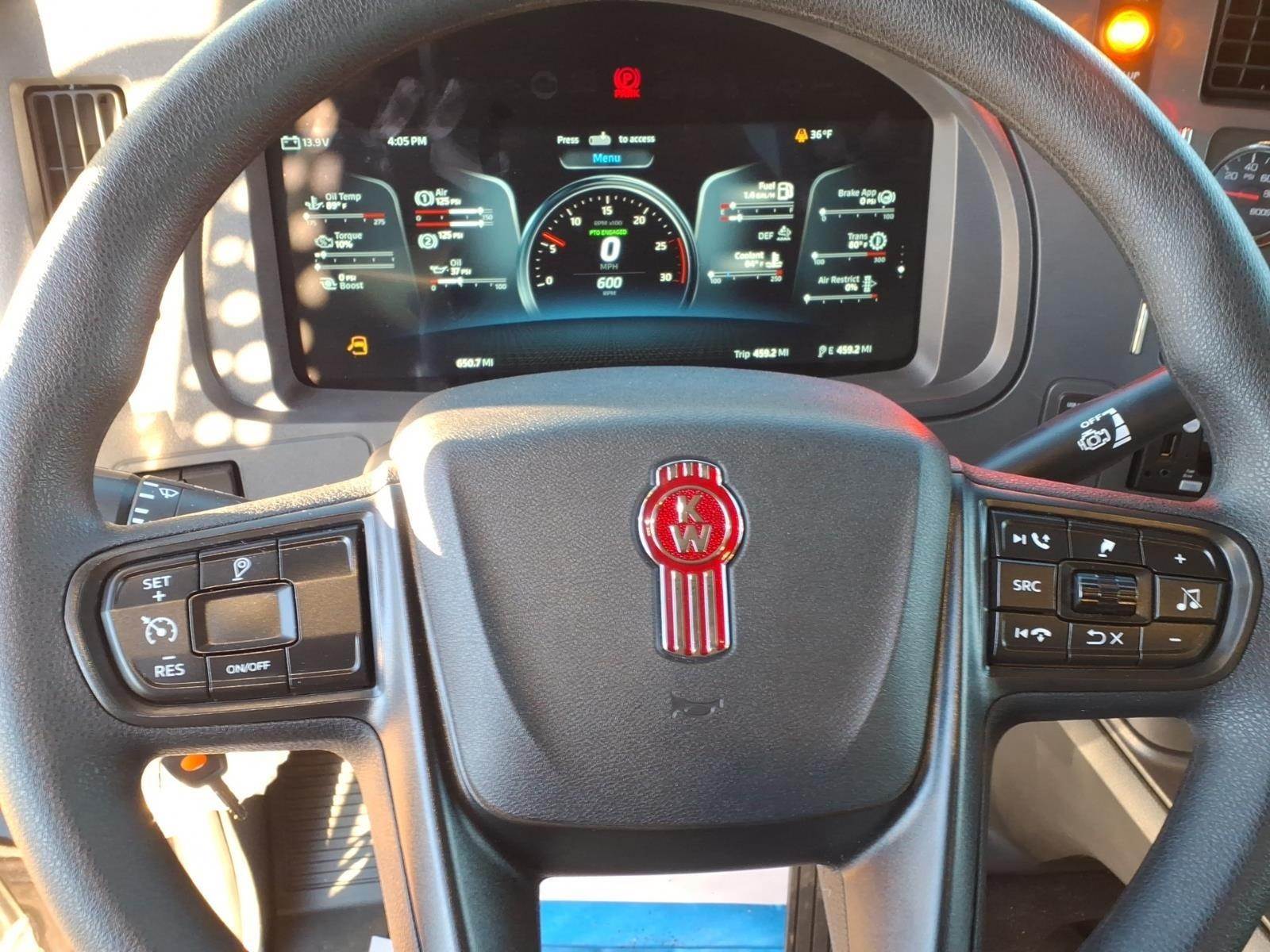 Power windows, power door locks, tilt/telescoping steering wheel, Kenworth Smart Wheel with integrated radio and cruise controls, heated power mirrors, air conditioning with auto temperature control, 15" digital display main instrument package, Kenworth radio DEA710 AM/FM/WB/USB with Bluetooth, CB installation kit, dual air horns, exterior stainless steel sun visor, polished aluminum tapered channel front bumper, dual chrome exhaust elbows