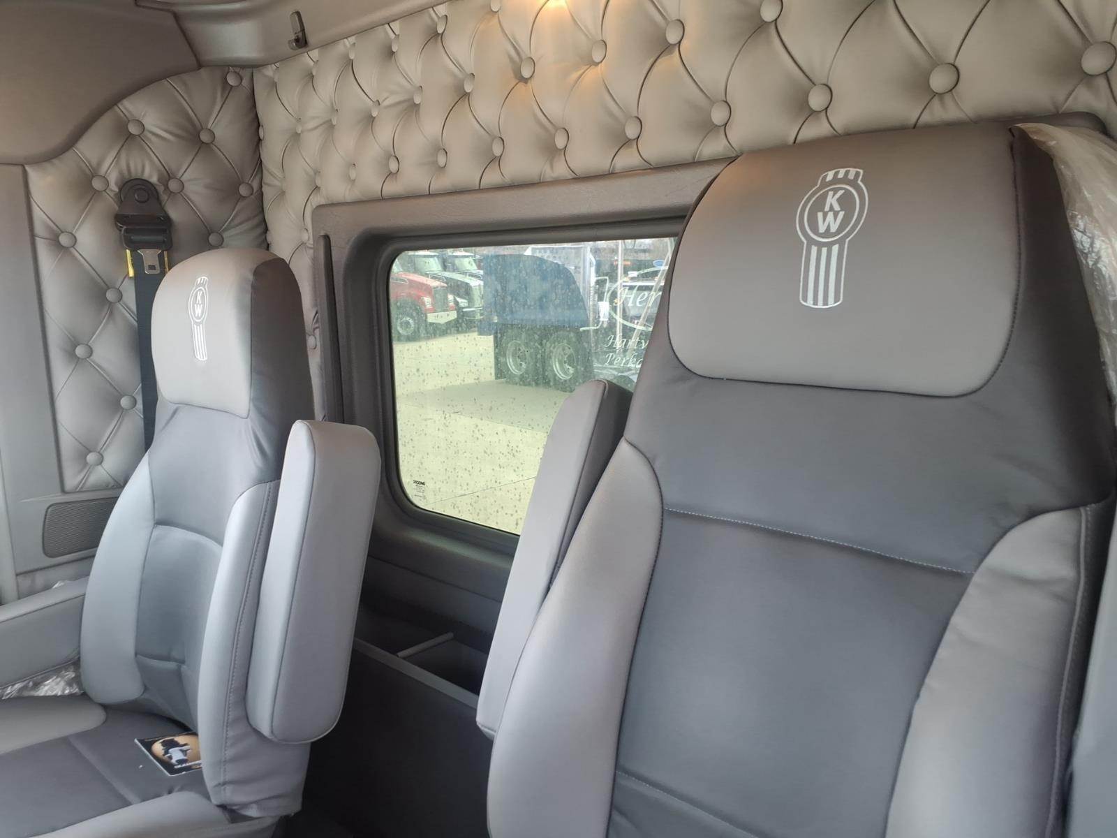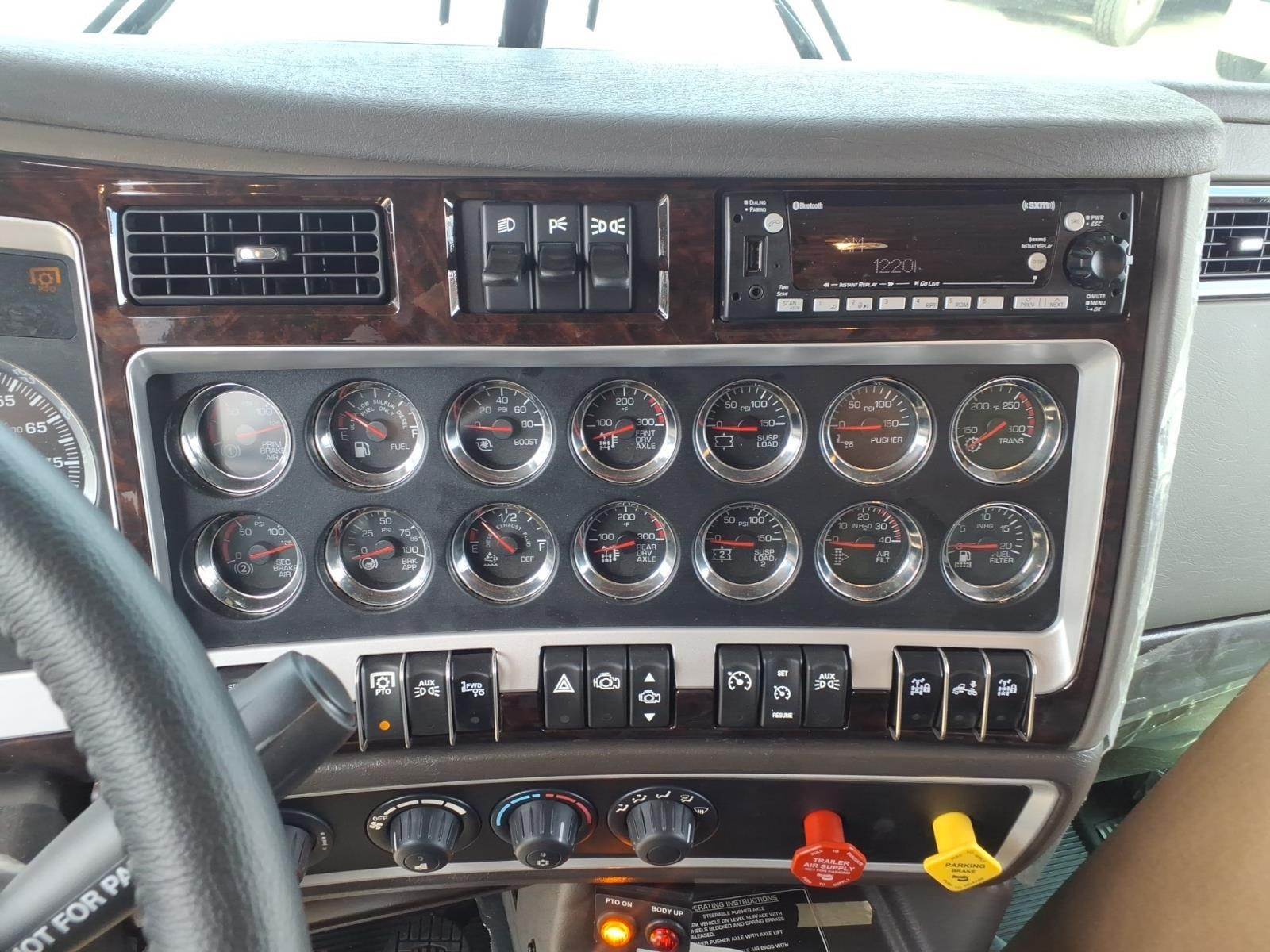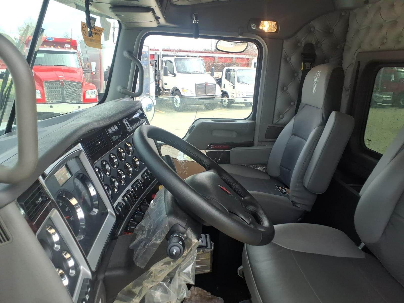 Options & Features: Power windows, power door locks, tilt/telescoping steering wheel, CB radio installation kit, heated driver seat, leather-wrapped Smart Wheel, Kenworth Driver Information Center, Kenworth TruckTech+, AM/FM/WB/USB Radio with Sirius-XM and Bluetooth, electric door locks, dual roof-mounted air horns, back-up lights, LED marker lights, fender-mounted LED turn signals