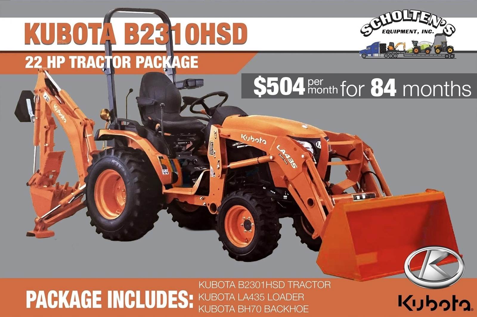 2026 KUBOTA B2301HSD 22 HP Tractor Package - package includes Kubota B2301HSD with a BH70 backhoe.