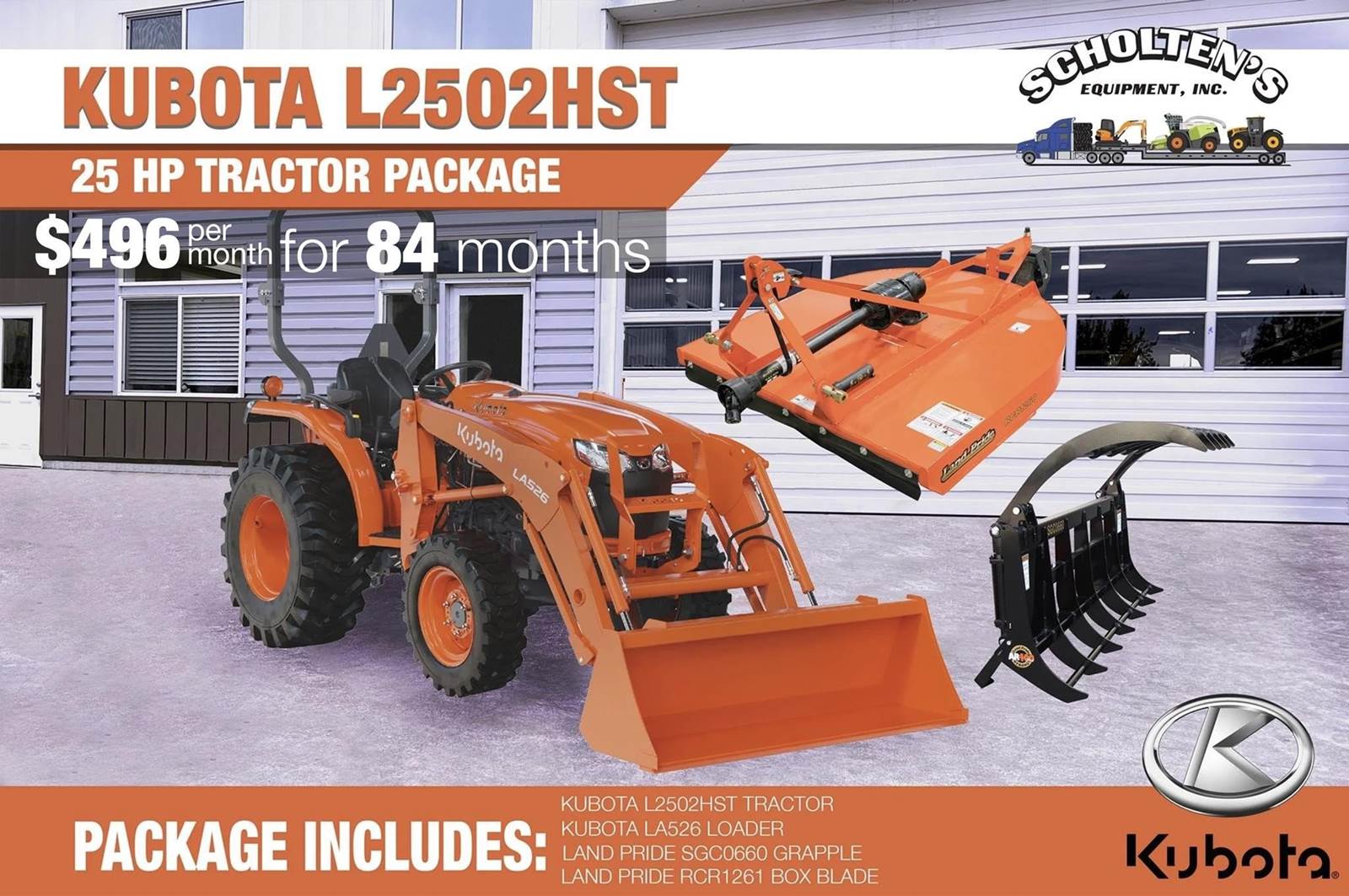 2026 KUBOTA L2502HST 25HP Tractor Package - package includes Kubota LX2502HST tractor, Kubota LA526 loader and bucket, Land Pride RCR1260...