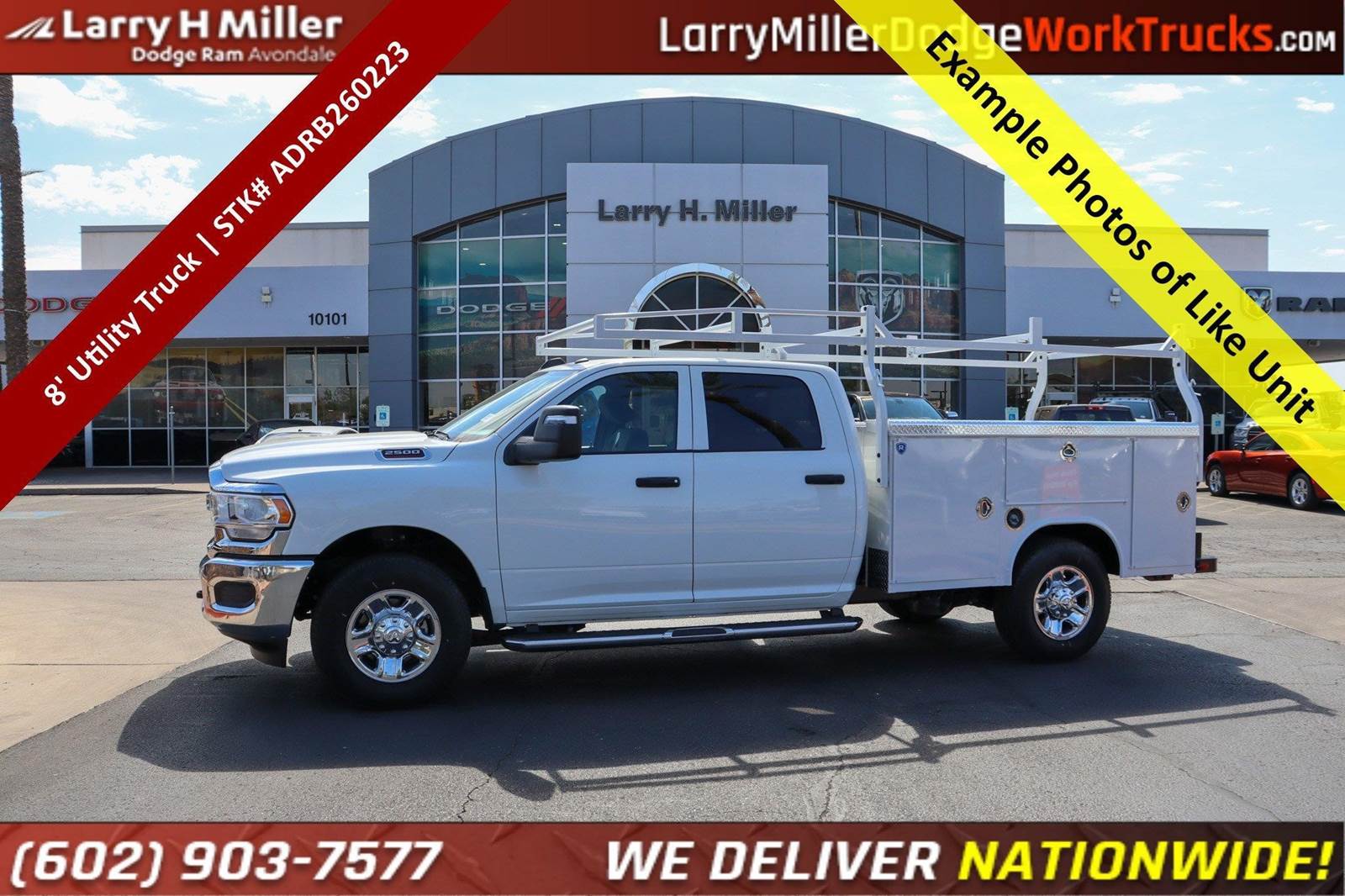 New 2026 Ram 2500 Crew Cab 4x2 Gas with an 8' Royal Service Body Work Truck for Sale.Bright White Clearcoat 2026 Ram 2500 Tradesman RWD 8-Speed Automatic 6.4L V8 115V Auxiliary Front Power Outlet, 2 Way Rear Headrest Seat, 3.73 Axle Ratio, 4 Way Front Headrests, 4-Wheel Disc Brakes, 40/20/40 Split Bench Seat, 400W Inverter, 4G LTE Wi-Fi Hot Spot, 6 Speakers, ABS brakes, Air Conditioning, AM/FM radio: SiriusXM, Apple CarPlay, Apple CarPlay/Android Auto, Black Exterior Mirrors, Black Wheel Center Hub, Brake assist, Bright Front Bumper, Bright Rear Bumper, Bulb Out Detection Defeat for LED, Center Hub, Chrome Appearance Group, Chrome Grille Surround, Compass, Connectivity - US/Canada, Dash Pass Thru Wire Circuits, Delay-off headlights, Delete Pickup Box, Driver door bin, Dual front impact airbags, Dual front side impact airbags, Electronic Stability Control, Exterior 115V AC Outlet, Exterior Mirrors Courtesy Lamps, Exterior Mirrors w/Heating Element, Exterior Mirrors w/Supplemental Signals, For Details, Visit , For More Info, Call , Front anti-roll bar, Front Armrest w/Cupholders, Front Center Armrest w/Storage, Front fog lights, Front License Plate Bracket, Front reading lights, Fully automatic headlights, Global Telematics Box Module (TBM), Google Android Auto, GPS Antenna Input, Heavy Duty Vinyl 40/20/40 Split Bench Seat, I/P Mounted Auxiliary Switches, Illuminated entry, Integrated Voice Command w/Bluetooth, Low tire pressure warning, Manual Adjust 4-Way Driver Seat, Manual Adjust 4-Way Front Passenger Seat, Manual Folding Exterior Mirrors, Manual Telescoping Mirrors, Manufacturer's Statement of Origin, Matte Black Mesh Grille w/Chrome, Mirror Running Lights, MOPAR Front & Rear Rubber Floor Mats, Occupant sensing airbag, Outside temperature display, Overhead airbag, Overhead console, Panic alarm, ParkView Rear Back-Up Camera, Passenger door bin, Passenger vanity mirror, Power Adjust Mirrors, Power Heated Folding Telescope Mirrors, Power steering, Power windows, Power-Adjustable Convex Aux Mirrors, Quick Order Package 2UA Tradesman, Radio data system, Radio: Uconnect 5 w/8.4 Display, Rear anti-roll bar, Rear Folding Seat, Rear step bumper, Rear window defroster, Remote keyless entry, Remote USB Port - Charge Only, Selectable Tire Fill Alert, SiriusXM Radio Service, Speed control, Storage Tray, Tachometer, Tilt steering wheel, Traction control, Tradesman Power Equipment Group, Variably intermittent wipers, Voltmeter, Wheels: 17 x 7.5 Black Steel Styled, Wheels: 18 x 8.0 Black Painted Steel, Wheels: 18 x 8.0 Steel Chrome Clad.At Larry H Miller Dodge Ram Avondale, we believe in providing our guests with a quality experience. With one of the widest used-car inventory selections in the valley, our seasoned sales professionals will ensure that your needs and wants are satisfied during the purchase of your next vehicle. Feel free to browse our online listings, and please reach out with any additional questions or requests. We are always happy to assist and ensure that your purchase is easy and enjoyable.Chrome Appearance Group (115V Auxiliary Front Power Outlet, 400W Inverter, Bright Front Bumper, Bright Rear Bumper, Center Hub, Chrome Grille Surround, Exterior 115V AC Outlet, Matte Black Mesh Grille w/Chrome, and Wheels: 18 x 8.0 Steel Chrome Clad), Quick Order Package 2UA Tradesman, Tradesman Power Equipment Group (Black Exterior Mirrors, Exterior Mirrors Courtesy Lamps, Exterior Mirrors w/Heating Element, Exterior Mirrors w/Supplemental Signals, Manual Folding Exterior Mirrors, Manual Telescoping Mirrors, Mirror Running Lights, Power Adjust Mirrors, Power Heated Folding Telescope Mirrors, and Power-Adjustable Convex Aux Mirrors), 2 Way Rear Headrest Seat, 3.73 Axle Ratio, 4 Way Front Headrests, 4-Wheel Disc Brakes, 40/20/40 Split Bench Seat, 4G LTE Wi-Fi Hot Spot, 6 Speakers, ABS brakes, Air Conditioning, AM/FM radio: SiriusXM, Apple CarPlay, Apple CarPlay/Android Auto, Black Wheel Center Hub, Brake assist, Bulb Out Detecti Price includes $699 dealer adde