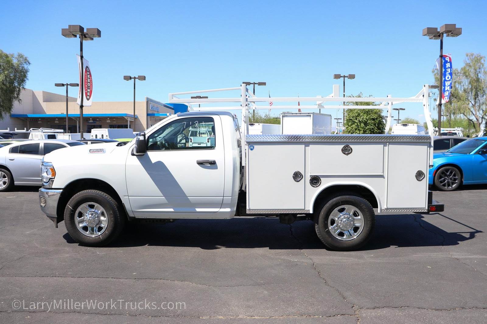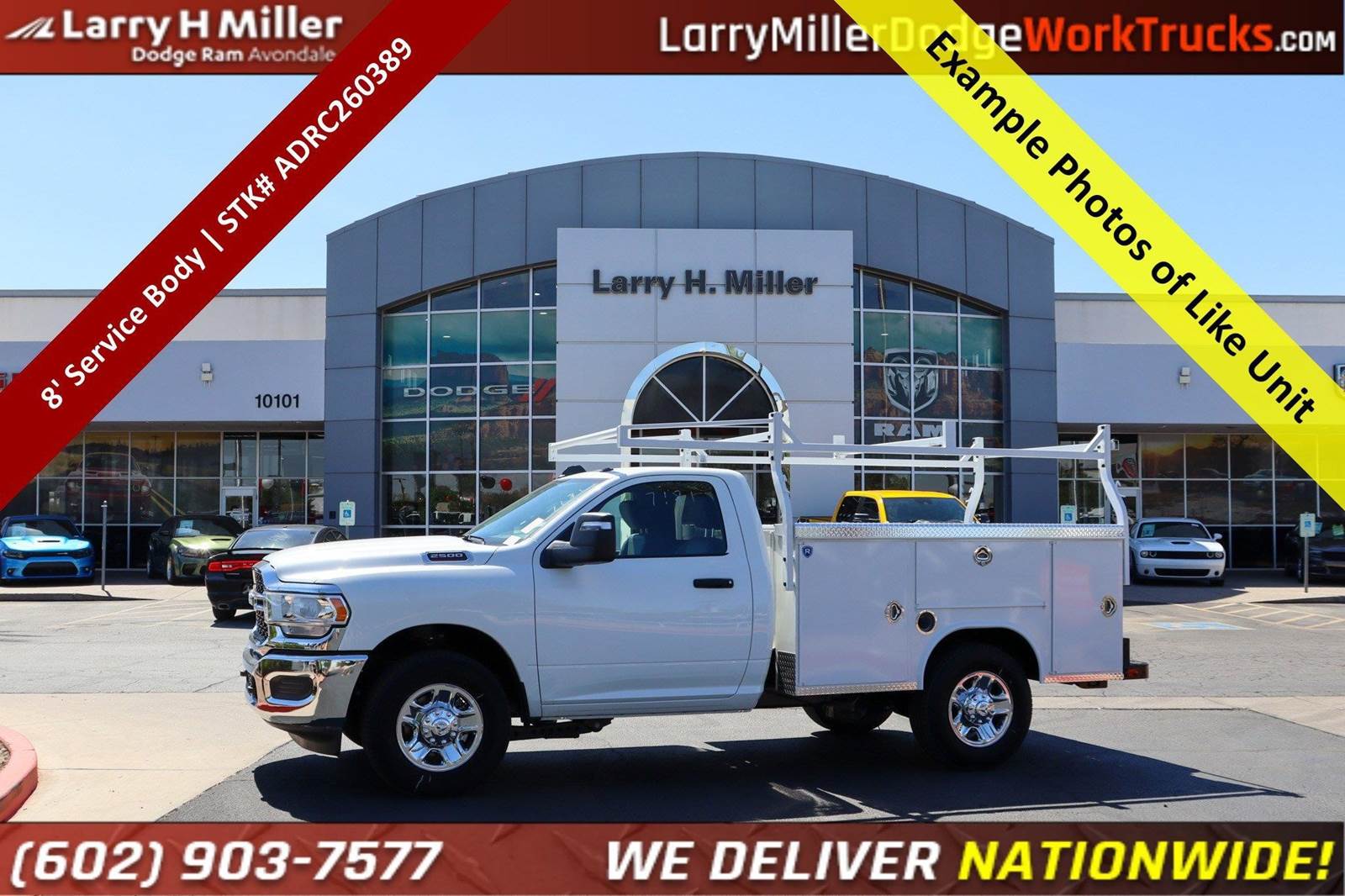 New 2026 Ram 2500 Reg Cab 4x2 Gas with an 8' Royal Service Body work truck for sale. The sale price includes the utility truck body and the ladder rack. Stock# ADRC260389.Bright White Clearcoat 2026 Ram 2500 Tradesman RWD 8-Speed Automatic 6.4L V8 115-Volt Auxiliary Front Power Outlet, 3.73 Axle Ratio, 4 Speakers, 4-Wheel Disc Brakes, 40/20/40 Split Bench Seat, 400W Inverter, 4G LTE Wi-Fi Hot Spot, ABS brakes, Air Conditioning, AM/FM radio: SiriusXM, Apple CarPlay, Apple CarPlay/Android Auto, Black Exterior Mirrors, Black Wheel Center Hub, Brake assist, Bright Front Bumper, Bright Rear Bumper, Center Hub, Chrome Appearance Group, Chrome Grille Surround, Compass, Connectivity - US/Canada, Dash Pass Thru Wire Circuits, Delay-off headlights, Driver door bin, Dual front impact airbags, Dual front side impact airbags, Electronic Stability Control, Exterior 115V AC Outlet, Exterior Mirrors Courtesy Lamps, Exterior Mirrors with Heating Element, Exterior Mirrors with Supplemental Signals, For Details Visit , For More Info Call , Front 1-Touch Down Power Windows, Front anti-roll bar, Front Armrest with Cupholders, Front Center Armrest w/Storage, Front fog lights, Front License Plate Bracket, Front reading lights, Fully automatic headlights, Global Telematics Box Module, Google Android Auto, GPS Antenna Input, Heavy Duty Vinyl 40/20/40 Split Bench Seat, Illuminated entry, Instrument Panel Mounted Auxiliary Switches, Integrated Voice Command with Bluetooth, Low tire pressure warning, Manual Adjust 4-Way Driver Seat, Manual Adjust 4-Way Front Passenger Seat, Manual Folding Exterior Mirrors, Manuarl Telescoping Mirrors, Manufacturer's Statement of Origin, Matte Black Mesh with Chrome Grille, Mirror Running Lights, MOPAR Front Rubber Floor Mats, Occupant sensing airbag, Outside temperature display, Overhead airbag, Overhead console, ParkView Rear Back-Up Camera, Passenger door bin, Passenger vanity mirror, Power Adjust Mirrors, Power Heated Folding Telescopic Mirrors, Power steering, Power-Adjustable Convex Aux Mirrors, Quick Order Package 2UA Tradesman, Radio data system, Radio: Uconnect 5 with 8.4 Display, Rear anti-roll bar, Rear step bumper, Remote Keyless Entry, Remote USB Port - Charge Only, Selectable Tire Fill Alert, SiriusXM Radio Service, Speed control, Speed Sensitive Power Locks, Tachometer, Tilt steering wheel, Traction control, Tradesman Power Equipment Group, Upgraded Door Trim Panel, Variably intermittent wipers, Voltmeter, Wheels: 17 x 7.5 Black Steel Styled, Wheels: 18 x 8.0 Steel Chrome Clad.At Larry H Miller Dodge Ram Avondale, we believe in providing our guests with a quality experience. With one of the widest used-car inventory selections in the valley, our seasoned sales professionals will ensure that your needs and wants are satisfied during the purchase of your next vehicle. Feel free to browse our online listings, and please reach out with any additional questions or requests. We are always happy to assist and ensure that your purchase is easy and enjoyable. Recent Arrival!Chrome Appearance Group (115-Volt Auxiliary Front Power Outlet, 400W Inverter, Bright Front Bumper, Bright Rear Bumper, Center Hub, Chrome Grille Surround, Exterior 115V AC Outlet, Matte Black Mesh with Chrome Grille, and Wheels: 18 x 8.0 Steel Chrome Clad), Quick Order Package 2UA Tradesman, Tradesman Power Equipment Group (Black Exterior Mirrors, Exterior Mirrors Courtesy Lamps, Exterior Mirrors with Heating Element, Exterior Mirrors with Supplemental Signals, Front 1-Touch Down Power Windows, Manual Folding Exterior Mirrors, Manuarl Telescoping Mirrors, Mirror Running Lights, Power Adjust Mirrors, Power Heated Folding Telescopic Mirrors, Power-Adjustable Convex Aux Mirrors, Remote Keyless Entry, Speed Sensitive Power Locks, and Upgraded Door Trim Panel), 3.73 Axle Ratio, 4 Speakers, 4-Wheel Disc Brakes, 40/20/40 Split Bench Seat, 4G LTE Wi-Fi Hot Spot, ABS brakes, Air Conditioning, AM/FM radio: SiriusXM, Apple CarPlay, Apple CarPlay/Android Auto, Black Wheel Center Hub, Brake assist, Compass, Connectivity - US/Canada, Dash Price includes $699 dealer adde