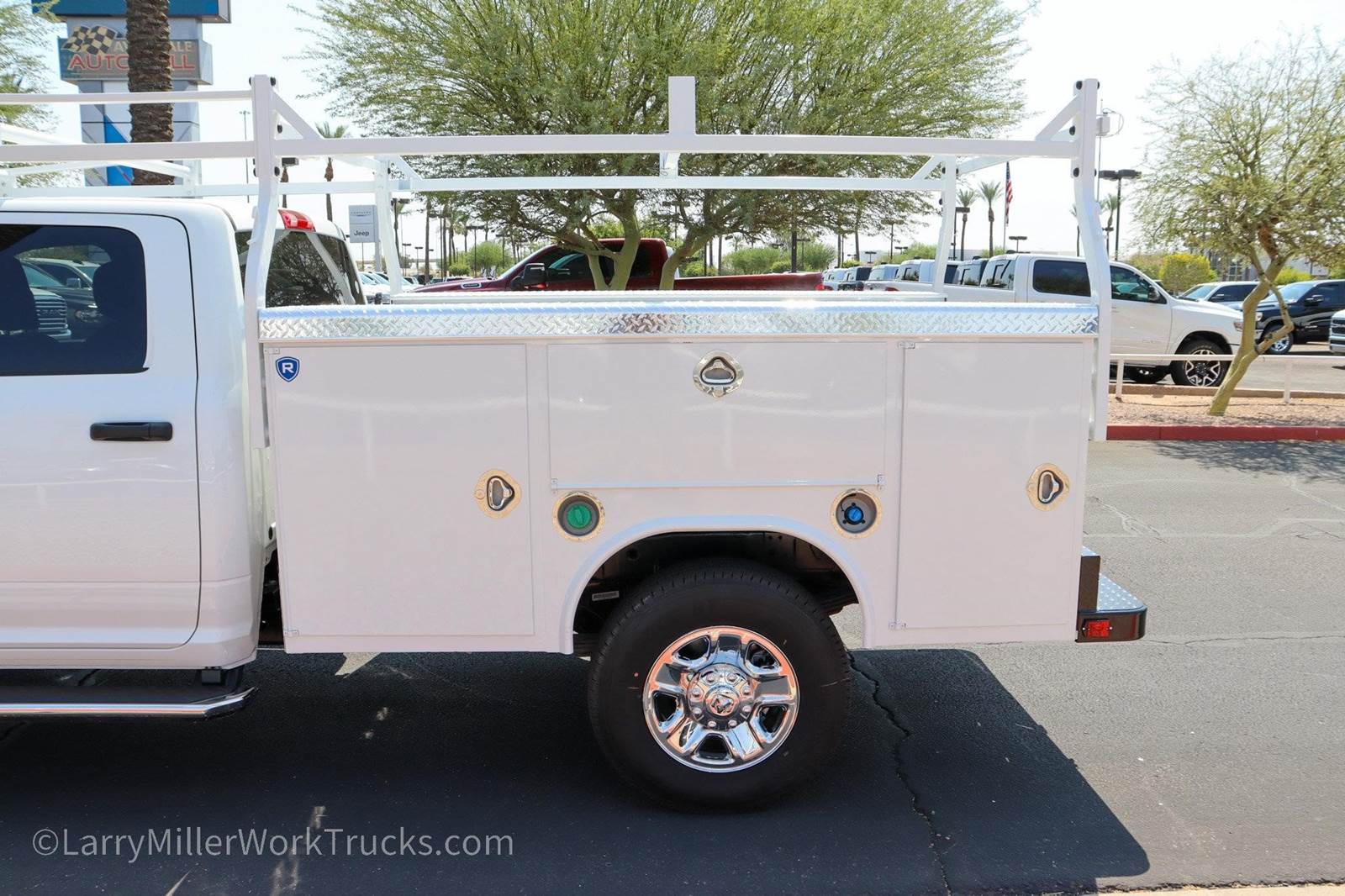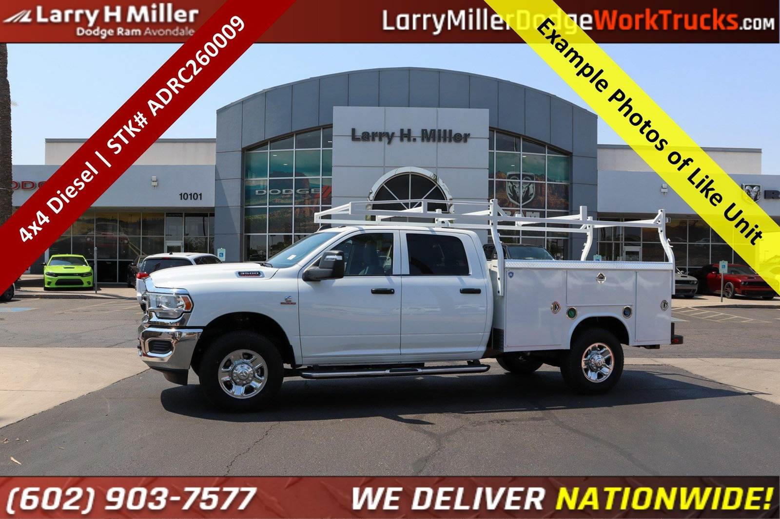 New 2026 Ram 3500 Crew Cab 4x4 Diesel with an 8' Royal Service Body work truck for sale. The sale price includes the utility truck body and the ladder rack. Stock# ADRC260009.Bright White Clearcoat 2026 Ram 3500 Tradesman 4WD 8-Speed Automatic 6.7L I6 115-Volt Auxiliary Front Power Outlet, 12 Touchscreen Display, 2 Way Rear Headrest Seat, 4 Way Front Headrests, 4-Wheel Disc Brakes, 40/20/40 Split Bench Seat, 400W Inverter, 4G LTE Wi-Fi Hot Spot, 50 Gallon Fuel Tank, 6 Speakers, ABS brakes, Air Conditioning, Air Conditioning ATC with Dual Zone Control, Alexa Built-in, AM/FM radio: SiriusXM, Apple CarPlay, Apple CarPlay/Android Auto, Auto-Dimming Rear-View Mirror, Black Exterior Mirrors, Black Wheel Center Hub, Brake assist, Bright Front Bumper, Bright Rear Bumper, Carpet Floor Covering, Center Hub, Chrome Grille Surround, Cloth 40/20/40 Bench Seat, Compass, Connected Travel and Traffic Services, Connectivity - US/Canada, Convenience Group, Dash Pass Thru Wire Circuits, Delay-off headlights, Disassociated Touchscreen Display, Driver door bin, Dual front impact airbags, Dual front side impact airbags, Electronic Stability Control, Emergency Vehicle Alert System (EVAS), Engine Block Heater, Exterior 115V AC Outlet, Exterior Mirrors Courtesy Lamps, Exterior Mirrors with Heating Element, Exterior Mirrors with Supplemental Signals, For Details Visit , For More Info, Call , Front and Rear Floor Mats, Front anti-roll bar, Front Armrest with Cupholders, Front Center Armrest w/Storage, Front fog lights, Front License Plate Bracket, Front reading lights, Fully automatic headlights, Global Telematics Box Module, Google Android Auto, GPS Antenna Input, GPS Navigation, HD Radio, Illuminated entry, Instrument Panel Mounted Auxiliary Switches, Integrated Voice Command with Bluetooth, Low tire pressure warning, Manual Adjust 4-Way Driver Seat, Manual Adjust 4-Way Front Passenger Seat, Manual Folding Exterior Mirrors, Manuarl Telescoping Mirrors, Manufacturer's Statement of Origin, Matte Black Mesh with Chrome Grille, Mirror Running Lights, Mopar Black Tubular Side Steps, MOPAR Front and Rear Rubber Floor Mats, Occupant sensing airbag, Off-Road Information Pages, Outside temperature display, Overhead airbag, Overhead console, Panic alarm, ParkSense Front/Rear Park Assist System, ParkView Rear Back-Up Camera, Passenger door bin, Passenger vanity mirror, Power Adjust Mirrors, Power Heat Fold Telescopic Mirrors, Power steering, Power windows, Power-Adjustable Convex Aux Mirrors, Quick Order Package 24A Tradesman, Radio data system, Radio: Uconnect 5 Navigation with 12.0 Display, Radio: Uconnect 5 with 8.4 Display, Rear Folding Seat, Rear Power Sliding Window, Rear step bumper, Rear window defroster, Remote keyless entry, Remote USB Port - Charge Only, Selectable Tire Fill Alert, SiriusXM Radio Service, SiriusXM with 360L, Speed control, Storage Tray, Tachometer, Tilt steering wheel, Tinted Acoustic Windshield Glass, Traction control, Tradesman Level 2 Equipment Group, Trailer Tow Pages, Variably intermittent wipers, Voltmeter, Wheels: 18 x 8.0 Black Painted Steel, Wheels: 18 x 8.0 Steel Chrome Clad.At Larry H Miller Dodge Ram Avondale, we believe in providing our guests with a quality experience. With one of the widest used-car inventory selections in the valley, our seasoned sales professionals will ensure that your needs and wants are satisfied during the purchase of your next vehicle. Feel free to browse our online listings, and please reach out with any additional questions or requests. We are always happy to assist and ensure that your purchase is easy and enjoyable.Quick Order Package 24A Tradesman, Tradesman Level 2 Equipment Group (115-Volt Auxiliary Front Power Outlet, 12 Touchscreen Display, 2 Way Rear Headrest Seat, 4 Way Front Headrests, 40/20/40 Split Bench Seat, 400W Inverter, 4G LTE Wi-Fi Hot Spot, Air Conditioning ATC with Dual Zone Control, Alexa Built-in, Apple CarPlay, Auto-Dimming Rear-View Mirror, Black Exterior Mirrors, Bright Front Bumper, Bright Rear Bumper, Carpet Floor Covering, Center Hub, Chrome Grille Price includes $699 dealer adde