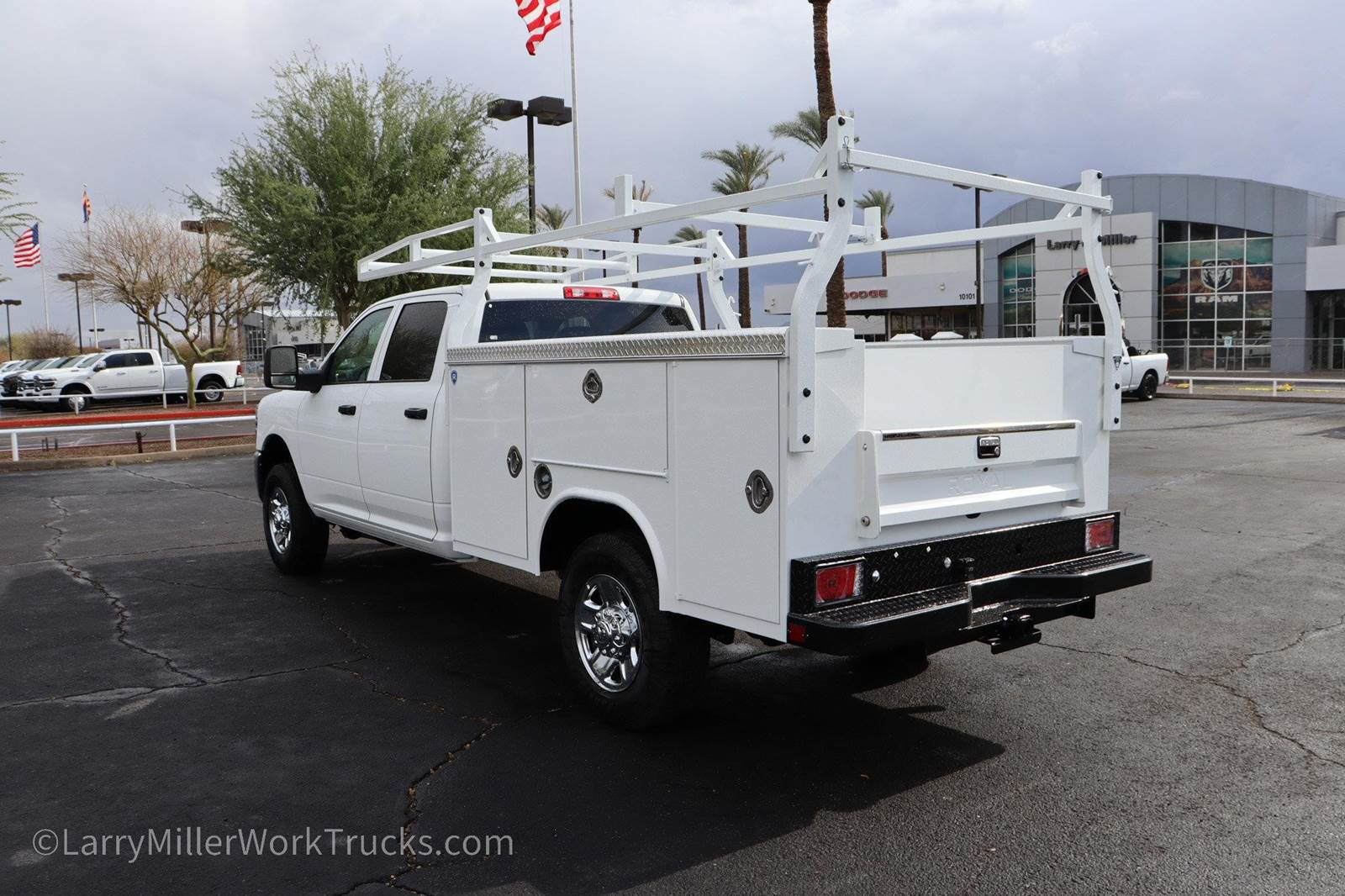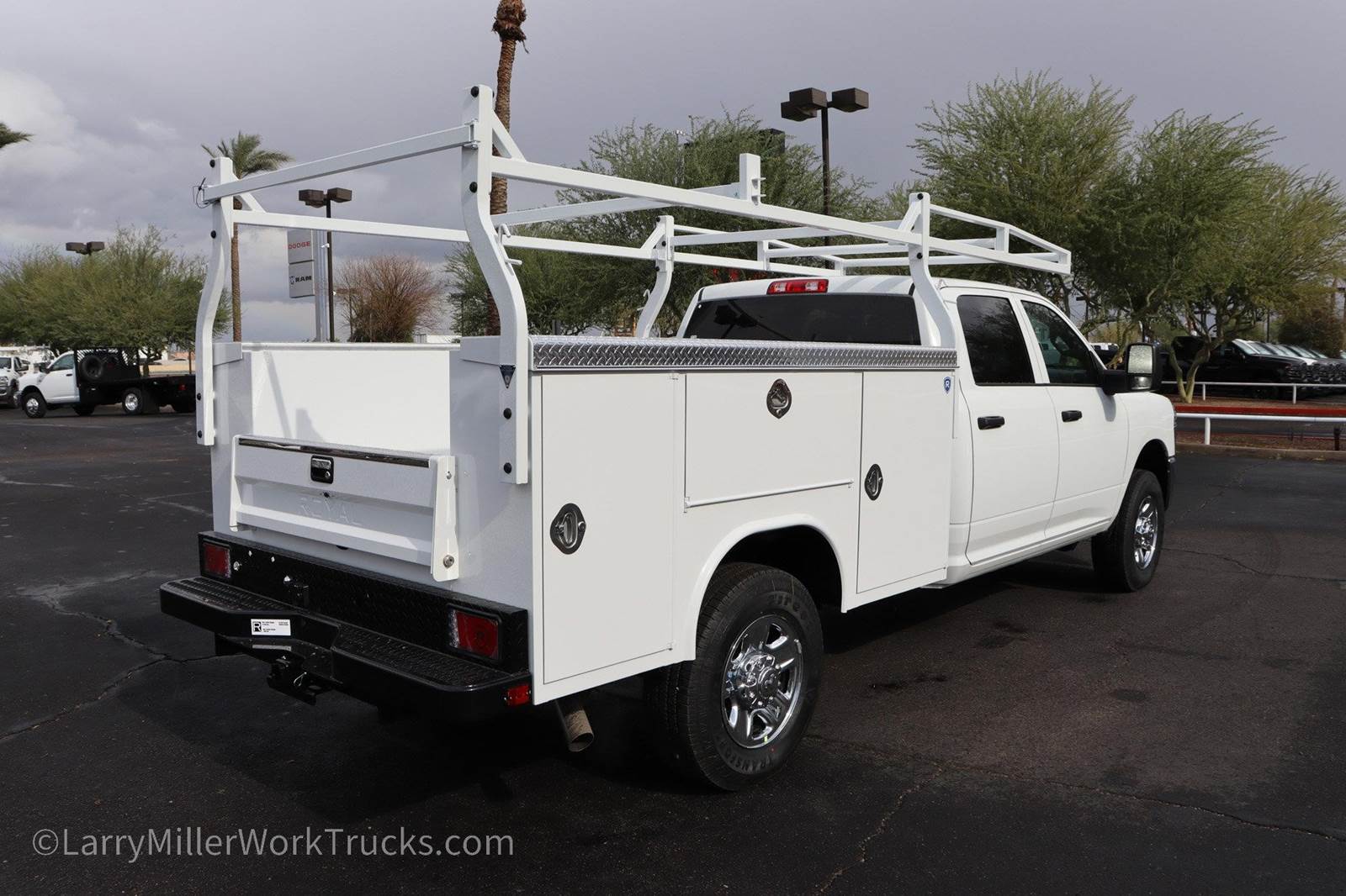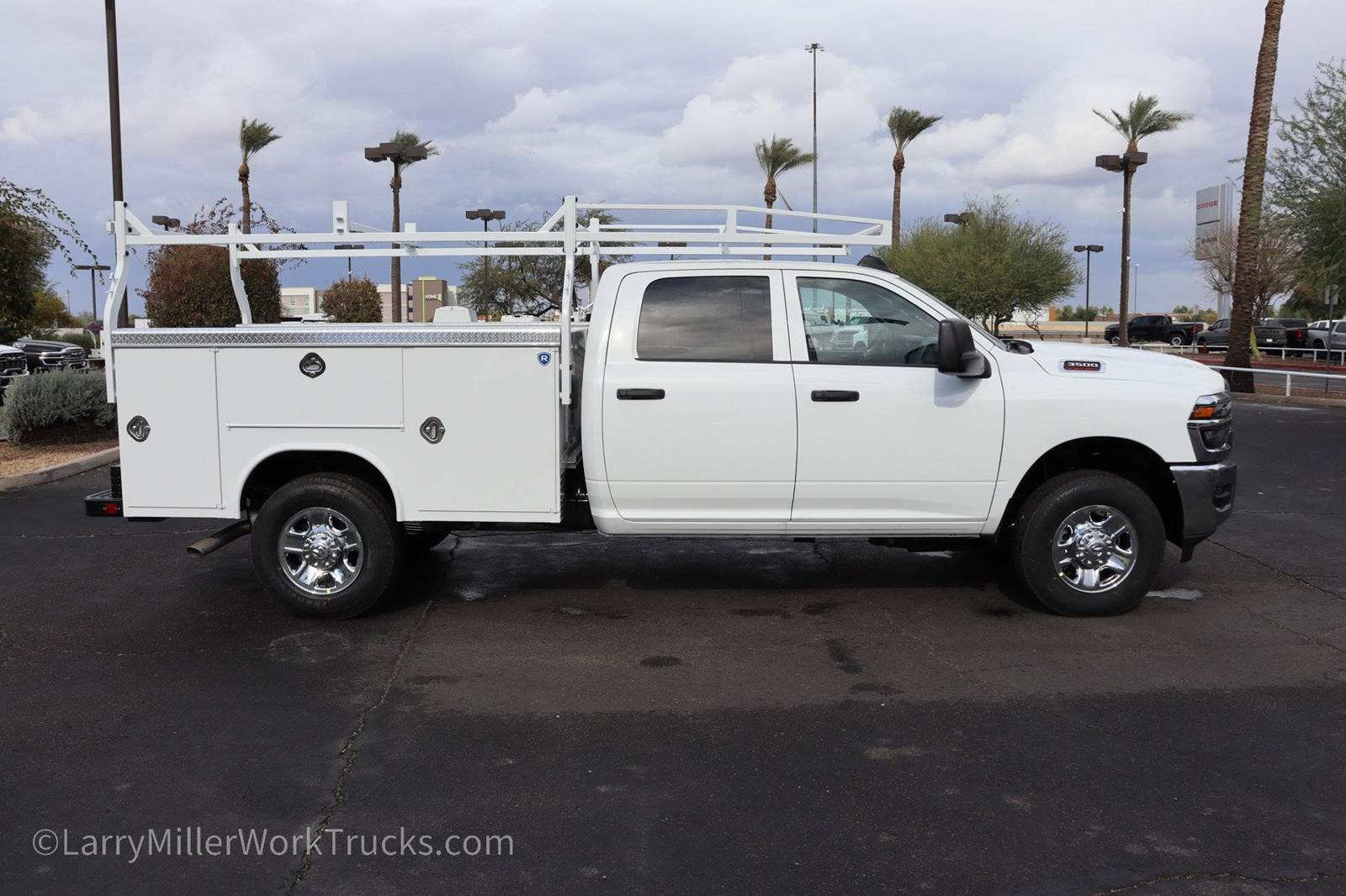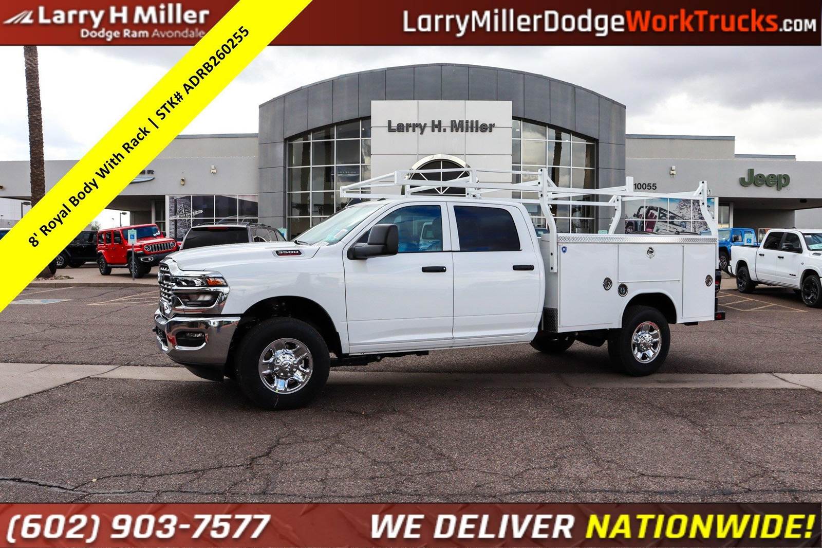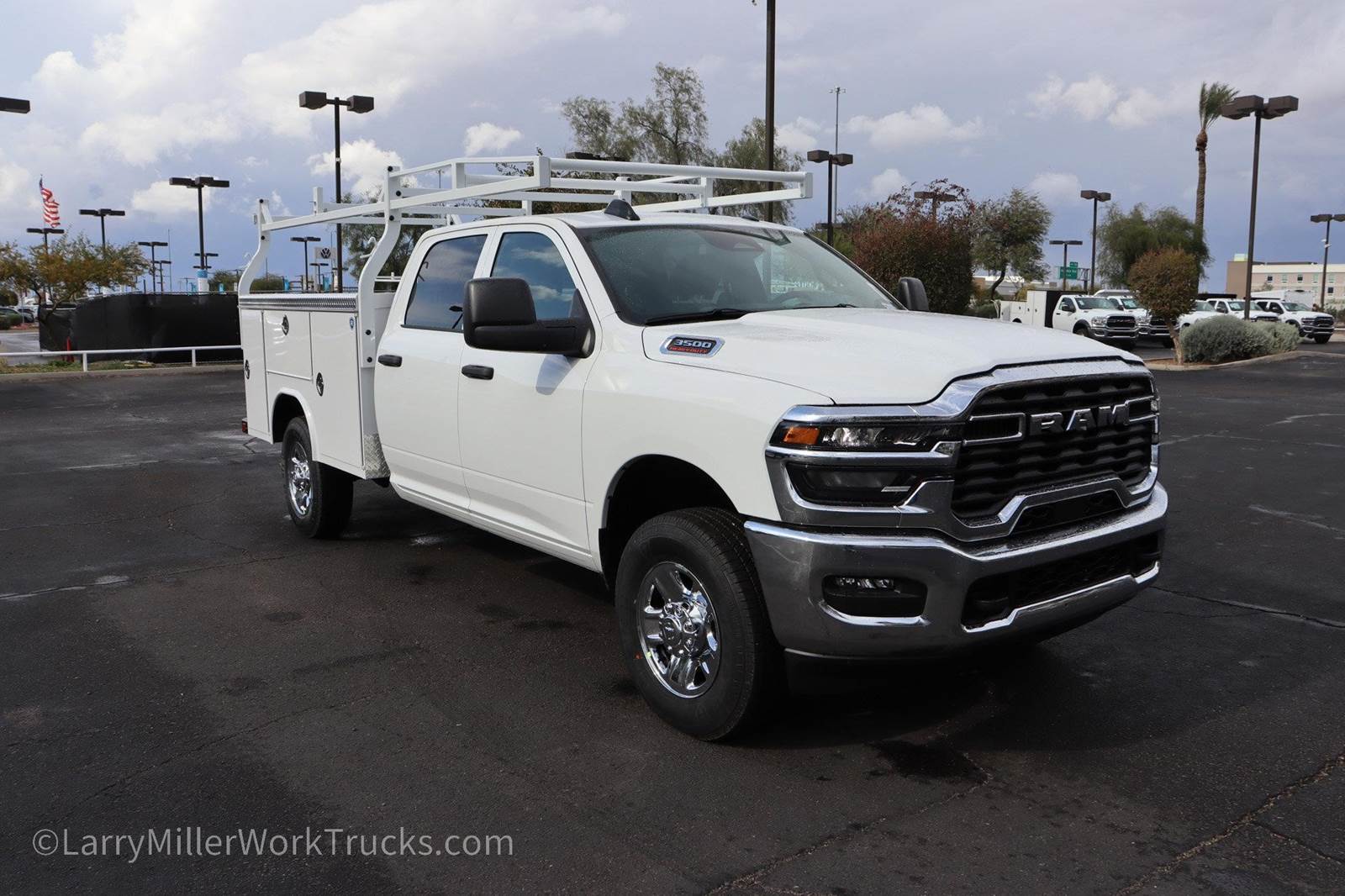 New 2026 Ram 3500 Crew Crew 4x4 8' Royal Service Body work truck for sale. The sale price includes the utility truck body and the ladder rack. Stock# ADRB260255.This Ram 3500 delivers a Regular Unleaded V-8 6.4 L/392 engine powering this Automatic transmission. WHEELS: 18 X 8.0 STEEL CHROME CLAD, TRANSMISSION: 8-SPEED AUTO (8HP75-LCV) (STD), TRANSFER CASE SKID PLATE SHIELD.*This Ram 3500 Comes Equipped with These Options *QUICK ORDER PACKAGE 2UA TRADESMAN -inc: Engine: 6.4L V8 HEMI HD, Transmission: 8-Speed Auto (8HP75-LCV) , TIRES: LT275/70R18E BSW ALL SEASON (STD), MANUFACTURER'S STATEMENT OF ORIGIN, I/P MOUNTED AUXILIARY SWITCHES -inc: Dash Pass Thru Wire Circuits, GVWR: 11,440 LB (STD), FRONT LICENSE PLATE BRACKET, ENGINE: 6.4L V8 HEMI HD (STD), ENGINE BLOCK HEATER, DIESEL GRAY/BLACK, HD VINYL 40/20/40 SPLIT BENCH SEAT, DELETE PICKUP BOX -inc: Bulb Out Detection Defeat for LED, Delete Spare Tire.*Stop By Today *Come in for a quick visit at Larry H Miller Dodge Ram Avondale, 10101 W Papago Fwy, Avondale, AZ 85323 to claim your Ram 3500!* is Arizona's favorite.*.