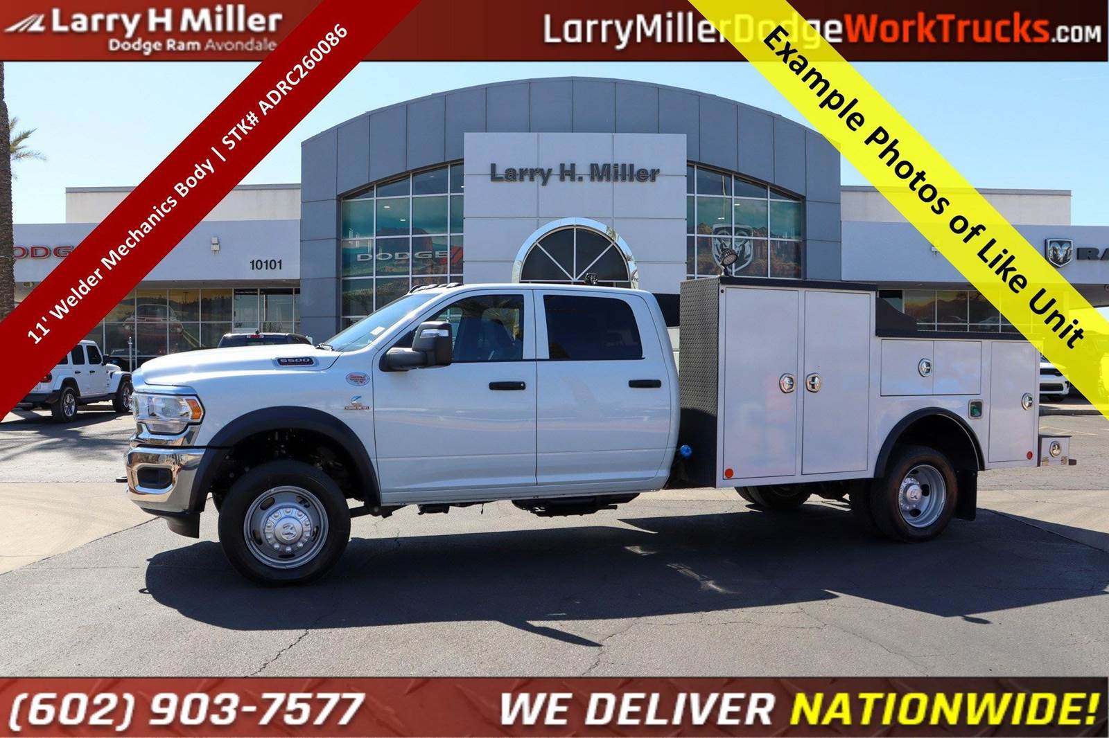 Bright White Clearcoat 2026 Ram 5500HD Tradesman 4WD 8-Speed Automatic Cummins 6.7L I6 Turbodiesel 19.5 x 6.0 Steel Wheels, 4-Wheel Disc Brakes, 4.44 Axle Ratio, 40/20/40 Split Bench Seat, 4G LTE Wi-Fi Hot Spot, 6 Speakers, ABS brakes, Air Conditioning, AM/FM radio: SiriusXM, Apple CarPlay, Apple CarPlay/Android Auto, Black Exterior Mirrors, Black Power Heated Fold Telescope Mirrors, Bright Front Bumper, Center Hub, Chrome Appearance Group, Chrome Grille Surround, Cold Weather Group, Compass, Connectivity - US/Canada, Delay-off headlights, Driver door bin, Dual front impact airbags, Dual rear wheels, Electronic Stability Control, Emergency communication system: RAM Connect, Engine Block Heater, Exterior Mirrors Courtesy Lamps, Exterior Mirrors with Heating Element, Exterior Mirrors with Supplemental Signals, For Details, Visit , Front anti-roll bar, Front Armrest with Cupholders, Front Center Armrest w/Storage, Front fog lights, Front License Plate Bracket, Front reading lights, Fully automatic headlights, Global Telematics Box Module, Google Android Auto, GPS Antenna Input, Integrated Voice Command with Bluetooth, Manual Adjust 4-Way Driver Seat, Manual Adjust 4-Way Front Passenger Seat, Manual Folding Exterior Mirrors, Manual Telescoping Mirrors, Manufacturer's Statement of Origin, Matte Black Mesh with Chrome Grille, Max Tow Package, Mirror Running Lights, MOPAR Winter Front Grille Cover, Occupant sensing airbag, Outside temperature display, Overhead console, Panic alarm, ParkView Rear Back-Up Camera, Passenger door bin, Passenger vanity mirror, Power Adjust Mirrors, Power steering, Power Take-Off Right/Left, Power windows, Power-Adjustable Convex Aux Mirrors, Quick Order Package 25A Tradesman, Radio data system, Radio: Uconnect 5 with 8.4 Display, Rear anti-roll bar, Rear Folding Seat, Rear reading lights, Rear Window Defroster, Remote keyless entry, Remote USB Port - Charge Only, Speed control, Tachometer, Temperature and Compass Gauge, Tilt steering wheel, Traction control, Tradesman Level 1 Equipment Group, Trailer Brake Control, Trailer Light Check, Variably intermittent wipers, Voltmeter, Wheels: 19.5 x 6.0 Black Painted Steel.At Larry H Miller Dodge Ram Avondale, we believe in providing our guests with a quality experience. With one of the widest used-car inventory selections in the valley, our seasoned sales professionals will ensure that your needs and wants are satisfied during the purchase of your next vehicle. Feel free to browse our online listings, and please reach out with any additional questions or requests. We are always happy to assist and ensure that your purchase is easy and enjoyable.Chrome Appearance Group (19.5 x 6.0 Steel Wheels, Bright Front Bumper, Center Hub, Chrome Grille Surround, and Matte Black Mesh with Chrome Grille), Cold Weather Group (Engine Block Heater and MOPAR Winter Front Grille Cover), Max Tow Package (Trailer Brake Control and Trailer Light Check), Quick Order Package 25A Tradesman, Tradesman Level 1 Equipment Group (Black Exterior Mirrors, Black Power Heated Fold Telescope Mirrors, Exterior Mirrors Courtesy Lamps, Exterior Mirrors with Heating Element, Exterior Mirrors with Supplemental Signals, Manual Folding Exterior Mirrors, Manual Telescoping Mirrors, Mirror Running Lights, Power Adjust Mirrors, Power-Adjustable Convex Aux Mirrors, and Rear Window Defroster), 4-Wheel Disc Brakes, 4.44 Axle Ratio, 40/20/40 Split Bench Seat, 4G LTE Wi-Fi Hot Spot, 6 Speakers, ABS brakes, Air Conditioning, AM/FM radio: SiriusXM, Apple CarPlay, Apple CarPlay/Android Auto, Compass, Connectivity - US/Canada, Delay-off headlights, Driver door bin, Dual front impact airbags, Dual rear wheels, Electronic Stability Control, Emergency communication system: RAM Connect, For Details, Visit , Front anti-roll bar, Front Armrest with Cupholders, Front Center Armrest w/Storage, Front fog lights, Price includes: $2500 - 2026 National Bonus Cash . Exp