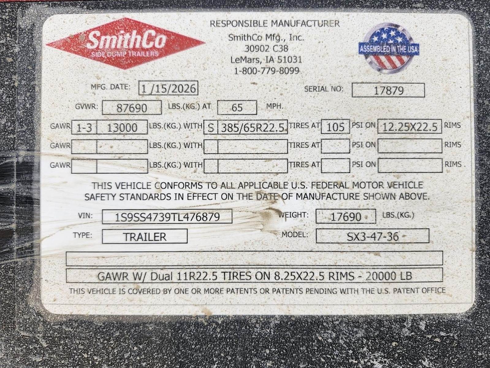 2026 SmithCo SX3-47-36 Side Dump Trailer