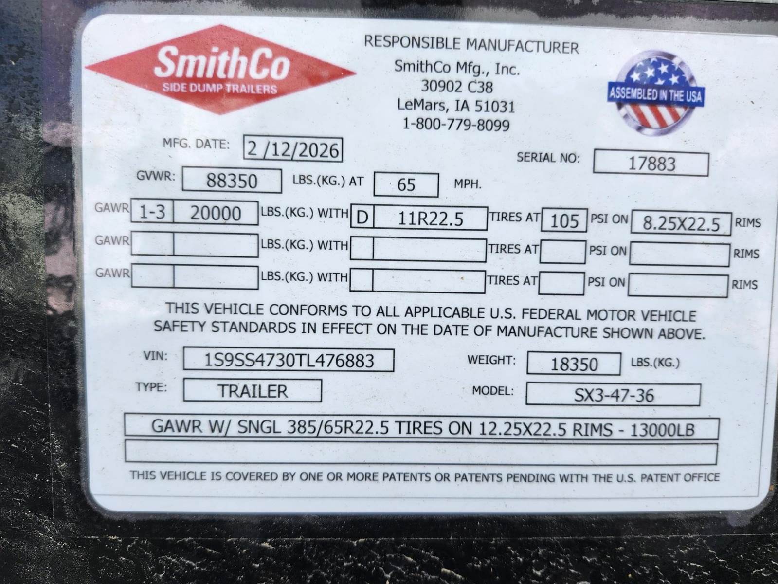2026 SmithCo SX3-47-36 Side Dump Trailer