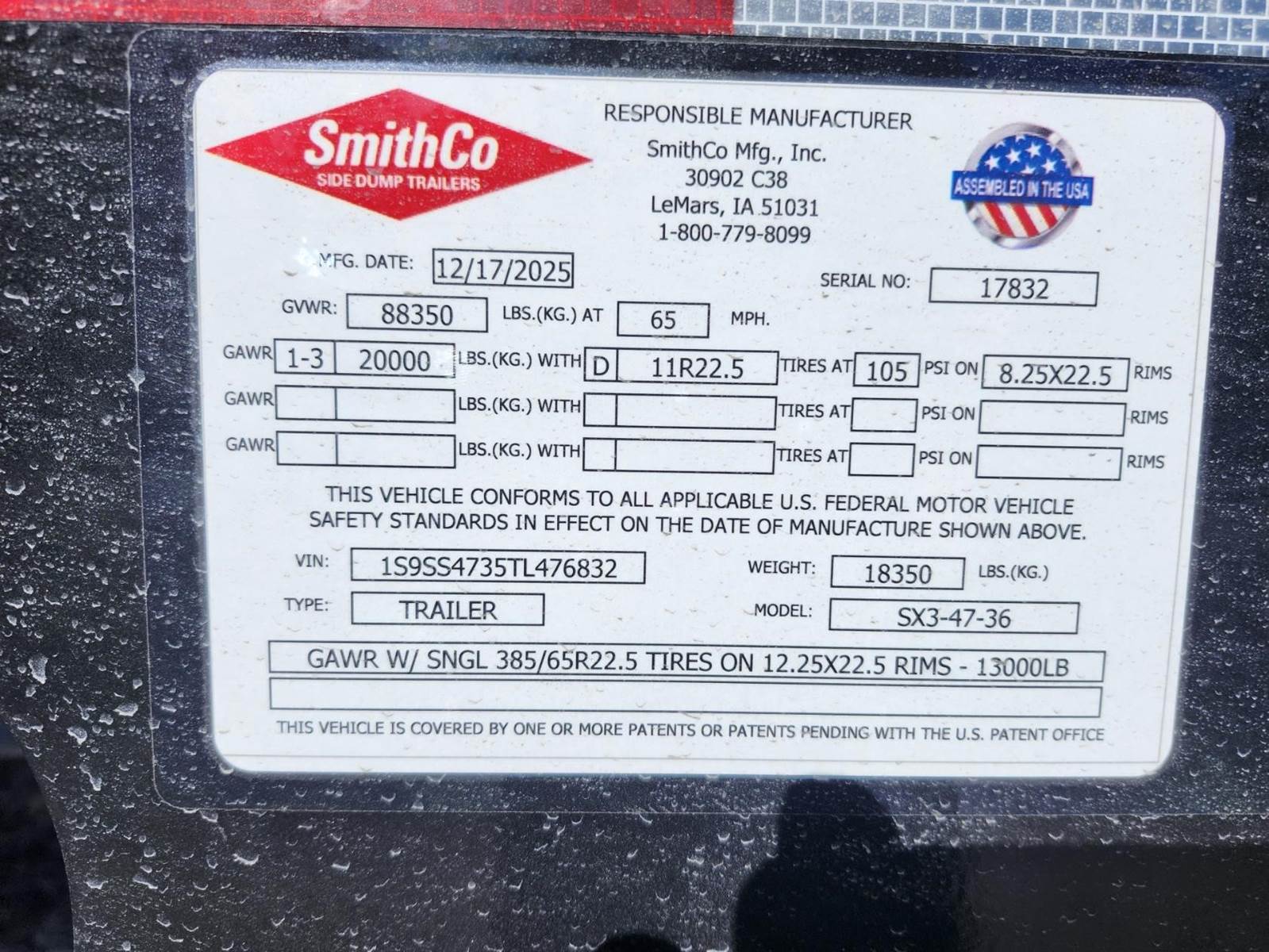 Made in the USA!! 47' trailer with 36' tub, 32 cubic yard capacity, 79" 3rd axle spacing, 18" Kingpin setting, 25K Axles, 2 speed landing gear, Electric roll over tarp, 1/4" AR450 hardened steel tub, Tarp lock-out switch, Push block, Hydraulic valve on trailer, 11R22.5 tires, Non-steerable 3rd lift axle with duals, Requires truck wet kit with minimum 10 gal hydraulic reservoir and 25-30 GPM hydraulic pump, FOR RENT ONLY!! ($200.00 additional for wireless remote system)