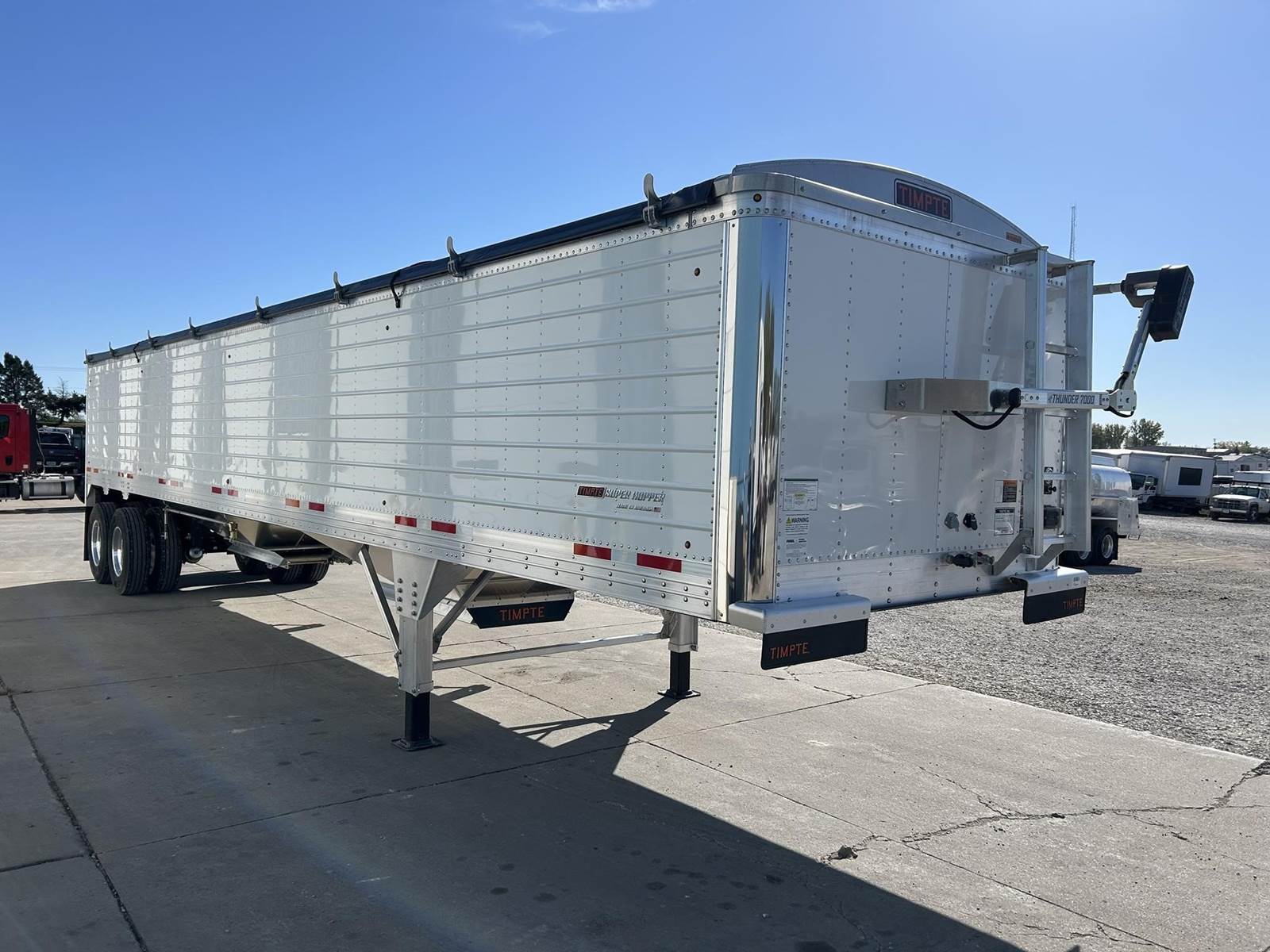 (FET INCLUDED-PRICE IS FOB THE FACTORY) 2026 TIMPTE 40'x96" Aluminum Hopper Trailer, 66" Side Height, Stainless Rear Panels and Front Corners, Tandem Air Ride Suspension, Aluminum Outer Wheels, 11R22.5 Tires, Thunderstone 7000 XR Electric Tarp, Vented Through Rear Frame Post, 2 Rows of 5 Bullet LED Lights, Front Splash Guards, Mudflaps, Front & Rear Ladders, Flip Step, (1) Pair Site Windows, Joist Aluminum Landing Legs, 25" Clearance, 24x27 Hopper Door, 20” Pin, 65,000 GVW, 1,439 sq ft Capacity (Heaped), 1,293 sq ft Capacity (Water Level)