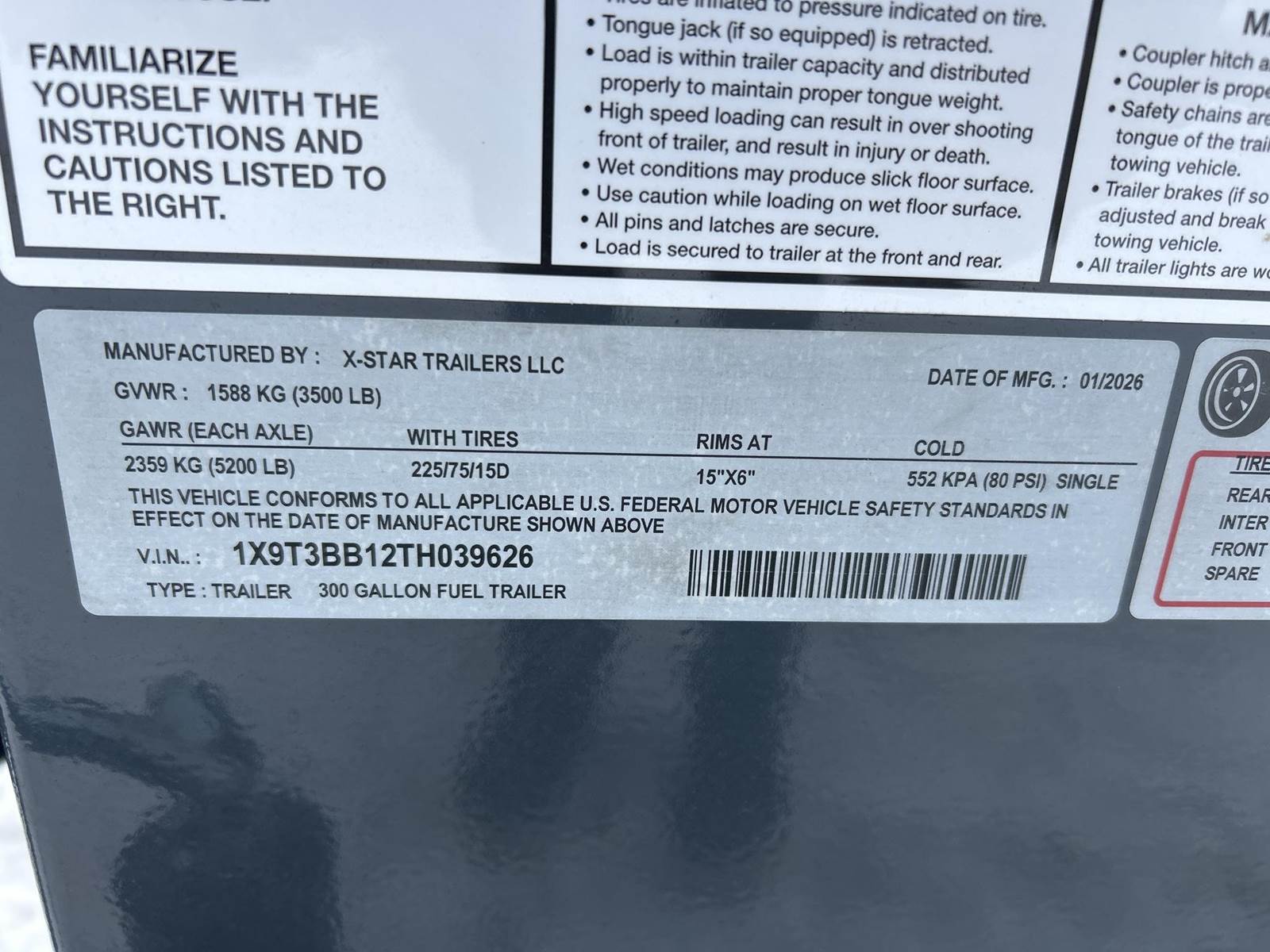 GVWR: 3500LB, Approx 6' Overall Width, Approx 10' Iverall Length, Spring Ride, Front Storage Box, 12V 20GPM Transfer Pump, 2" Coupler, 225/75R15 Tires