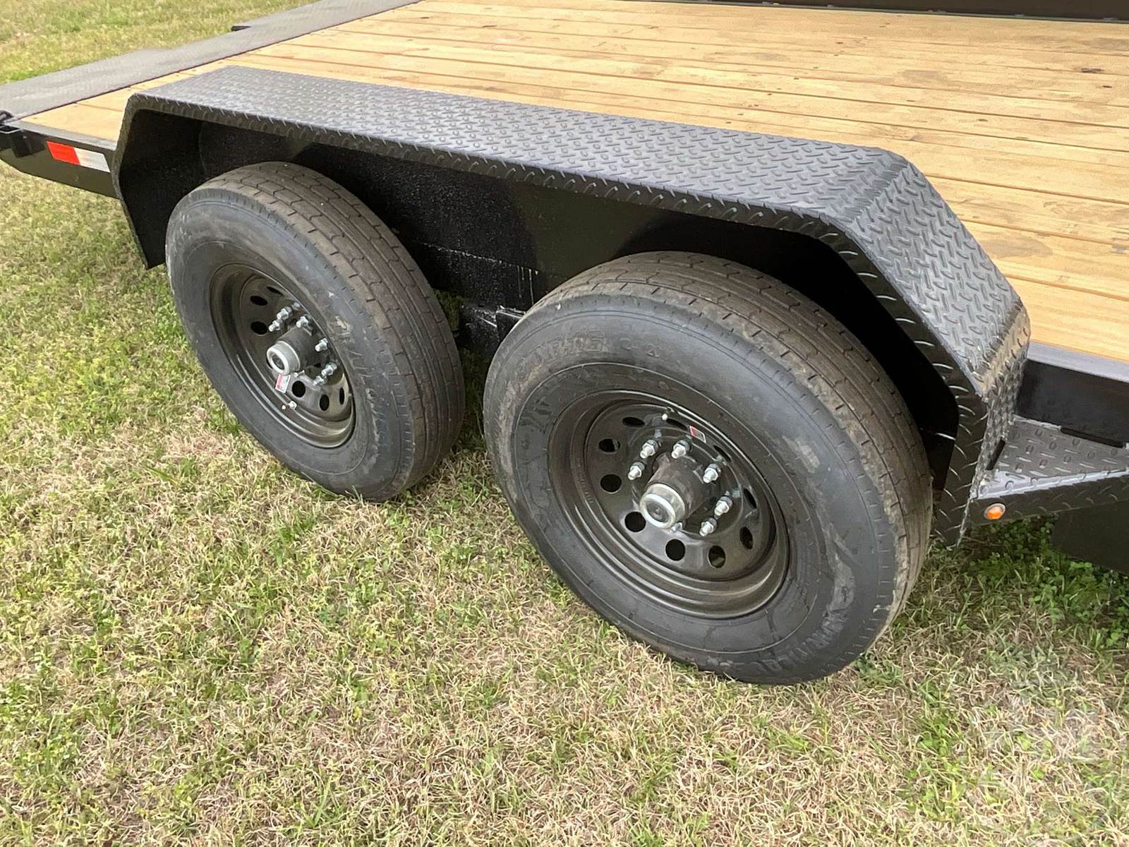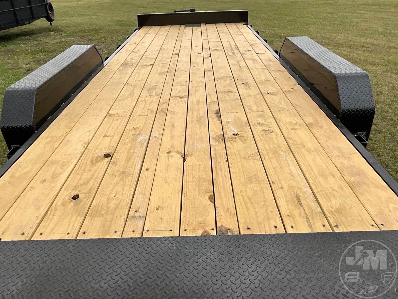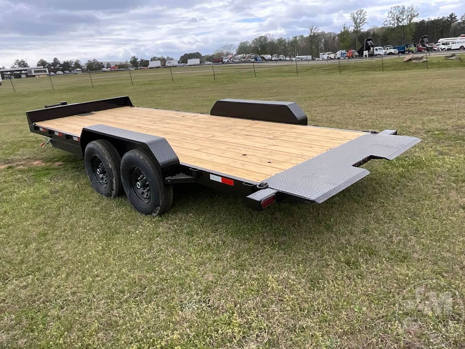 UNUSED TILT TRAILER 6'6"X20', 2 AXLE, WOOD DECKING, TOOL BOX, COVERED WHEELS, 2-5/16" BALL, 235/80R16 TIRES, 14000 LB GVWR, 6" CHANNEL FRAME, 3" CROSS MEMBERS, TREATED LUMBER DECKING, W/ BATTERY HYDRAULIC PUMP