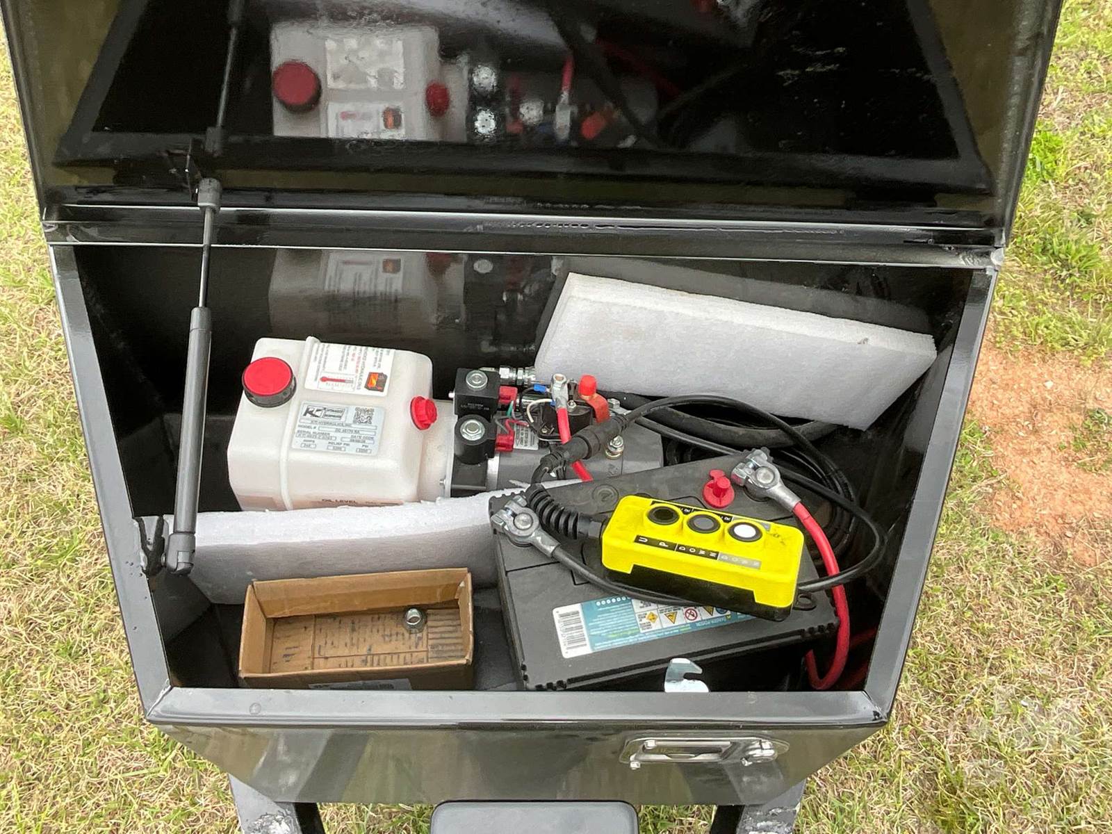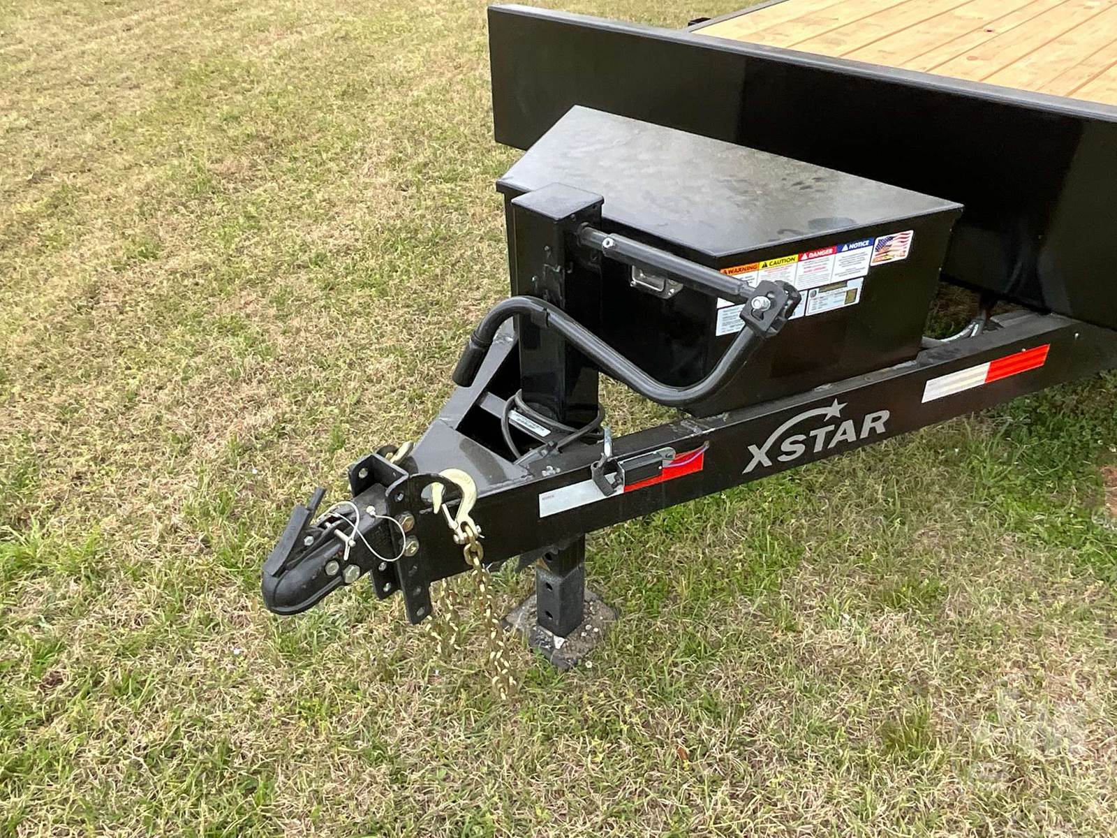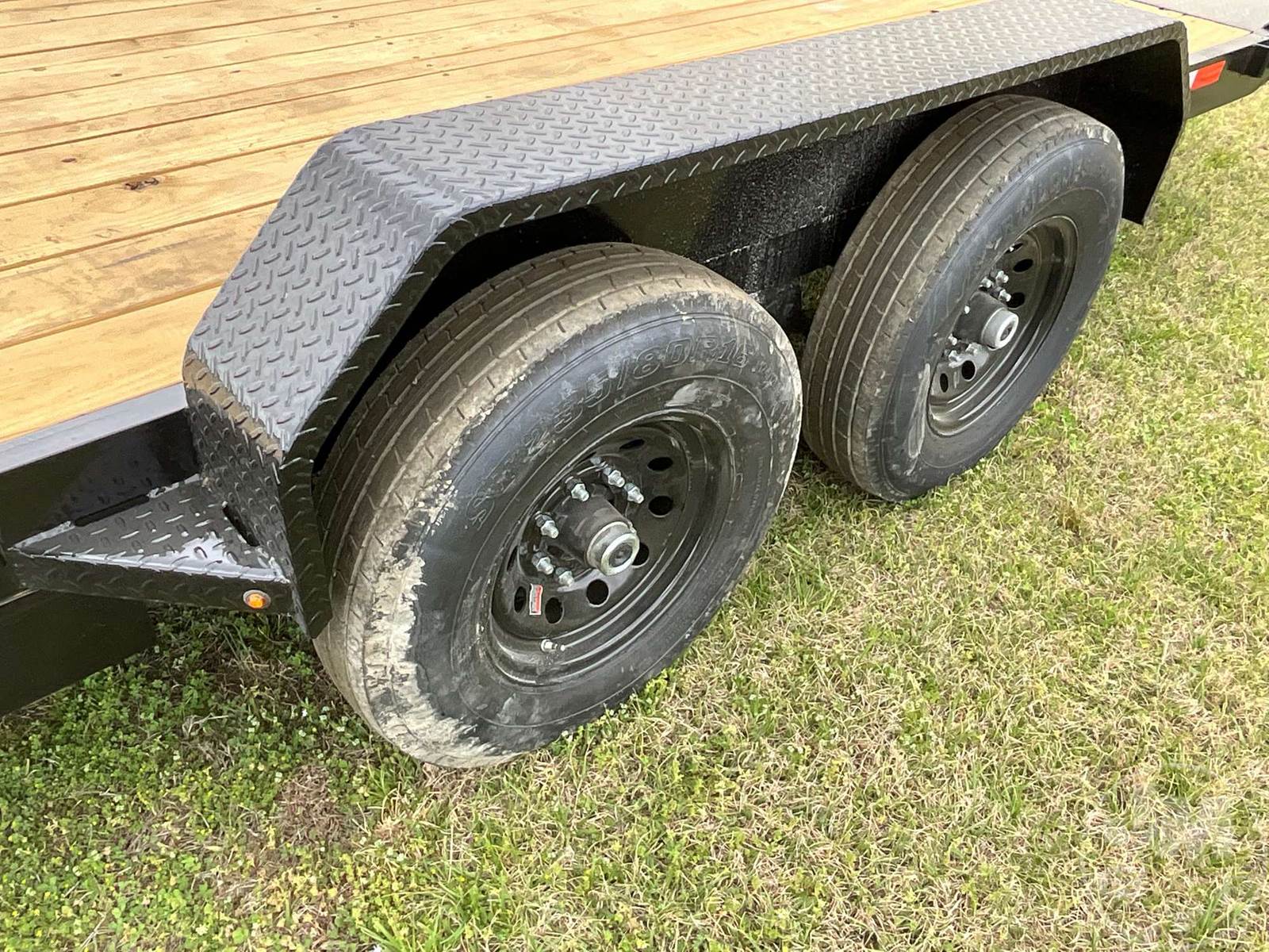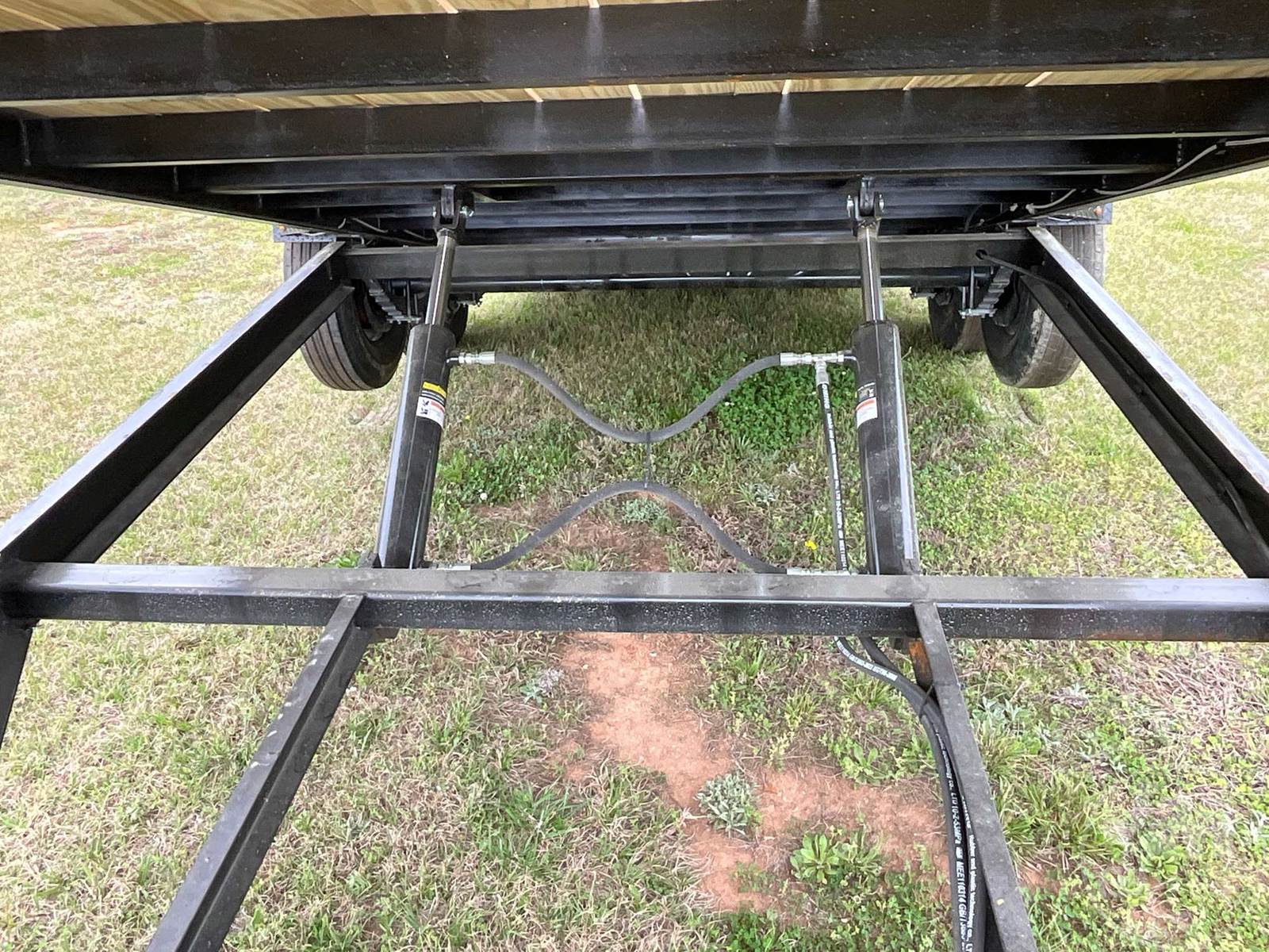 UNUSED TILT TRAILER 6'6"X20', 2 AXLE, WOOD DECKING, TOOL BOX, COVERED WHEELS, 2-5/16" BALL, 235/80R16 TIRES, 14000 LB GVWR, 6" CHANNEL FRAME, 3" CROSS MEMBERS, TREATED LUMBER DECKING, W/ BATTERY HYDRAULIC PUMP