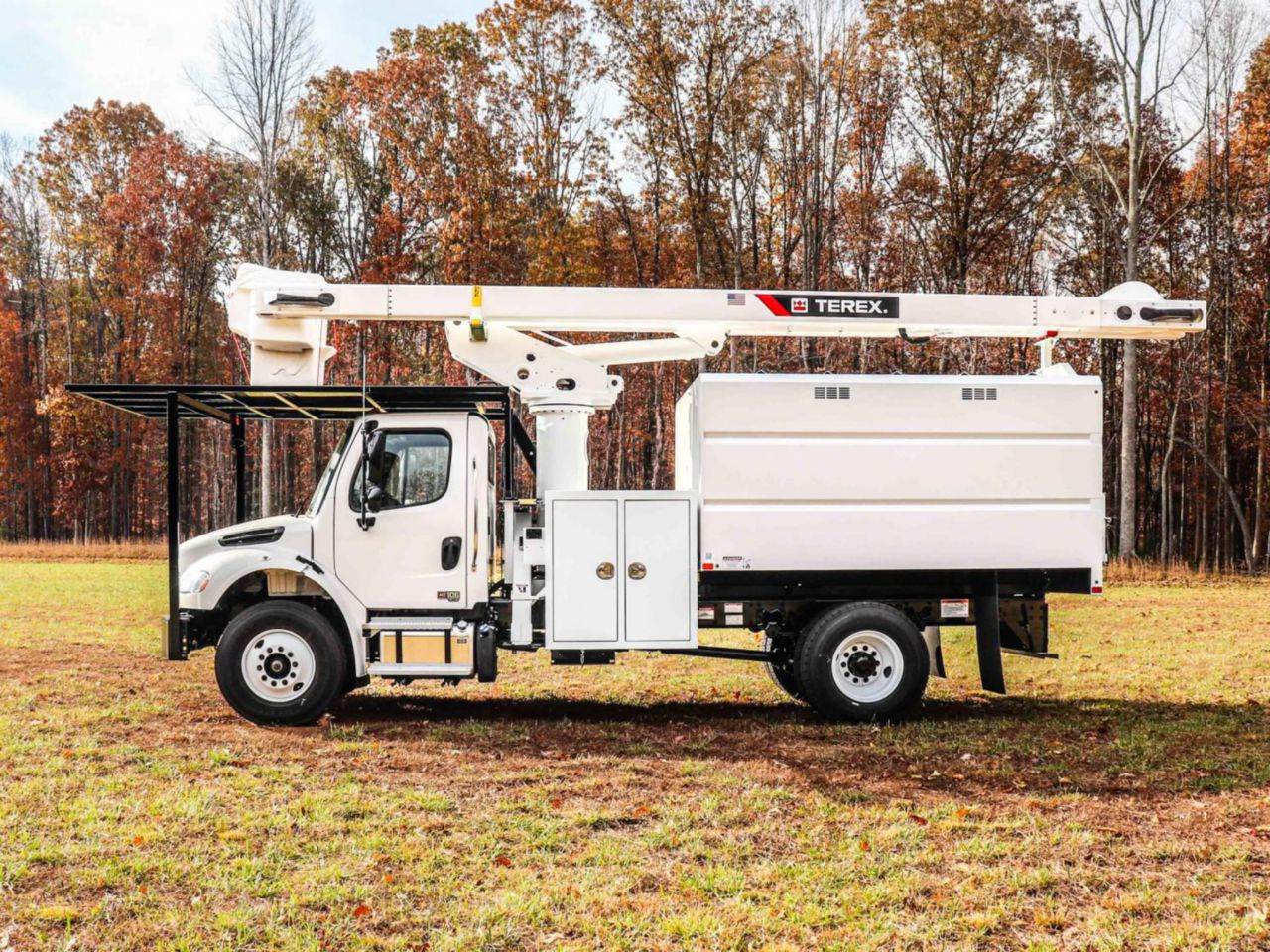 FOR SALE! A brand new Freightliner M2106 4x2 forestry bucket upfitted with a Terex XT PRO 56-BOC-F-PC. This vehicle is powered by a 270 hp Cummins 6.7L diesel motor, and gears are shifted via an Allison automatic transmission. The FAWR is 12k lbs and the rear is rated at 21k lbs. The upfitted XT PRO 56-BOC-F-PC offers a max working height of 61 ft, and the 24" x 24" x 40" platform is rated at 400 lbs. Also features a chipper body. Contact for more information!
