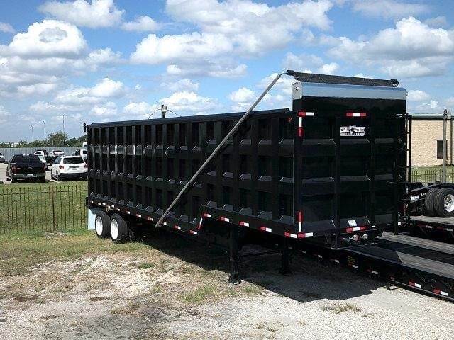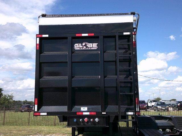 IN STOCK ROBSTOWN, TX NEW 2027 Globe 75 cu yd end dump, 30 ton rated, 36'x102"x12' tall, front inside wall height 78", rear inside wall height 96", rear barn door with manual lock, 1/4" floor, 4" crossmembers on 12" centers, ABS, single point spring suspension, 255/70R22.5 tires on steel wheels, 2 speed landing gear, electric flip tarp, black in color.