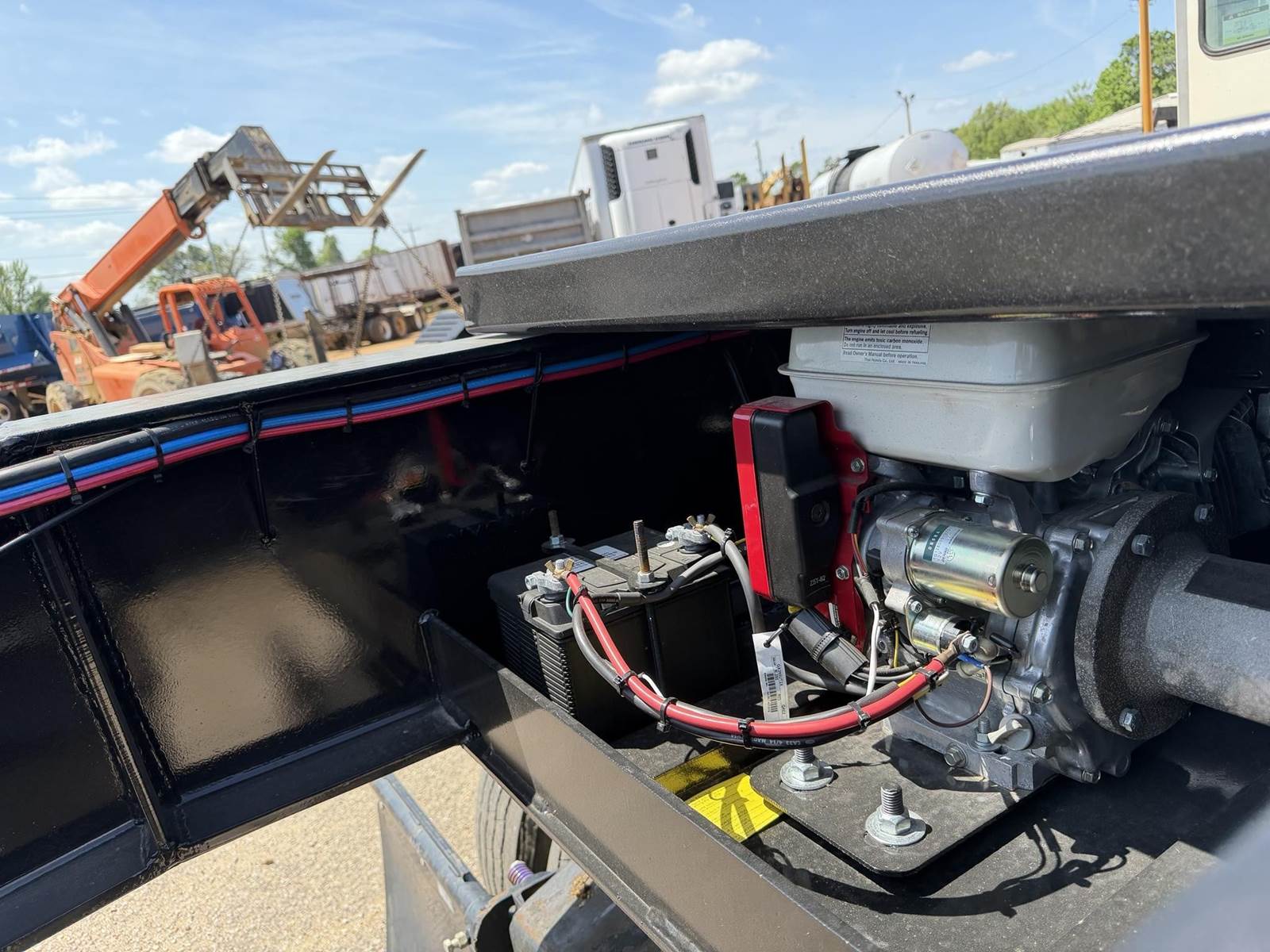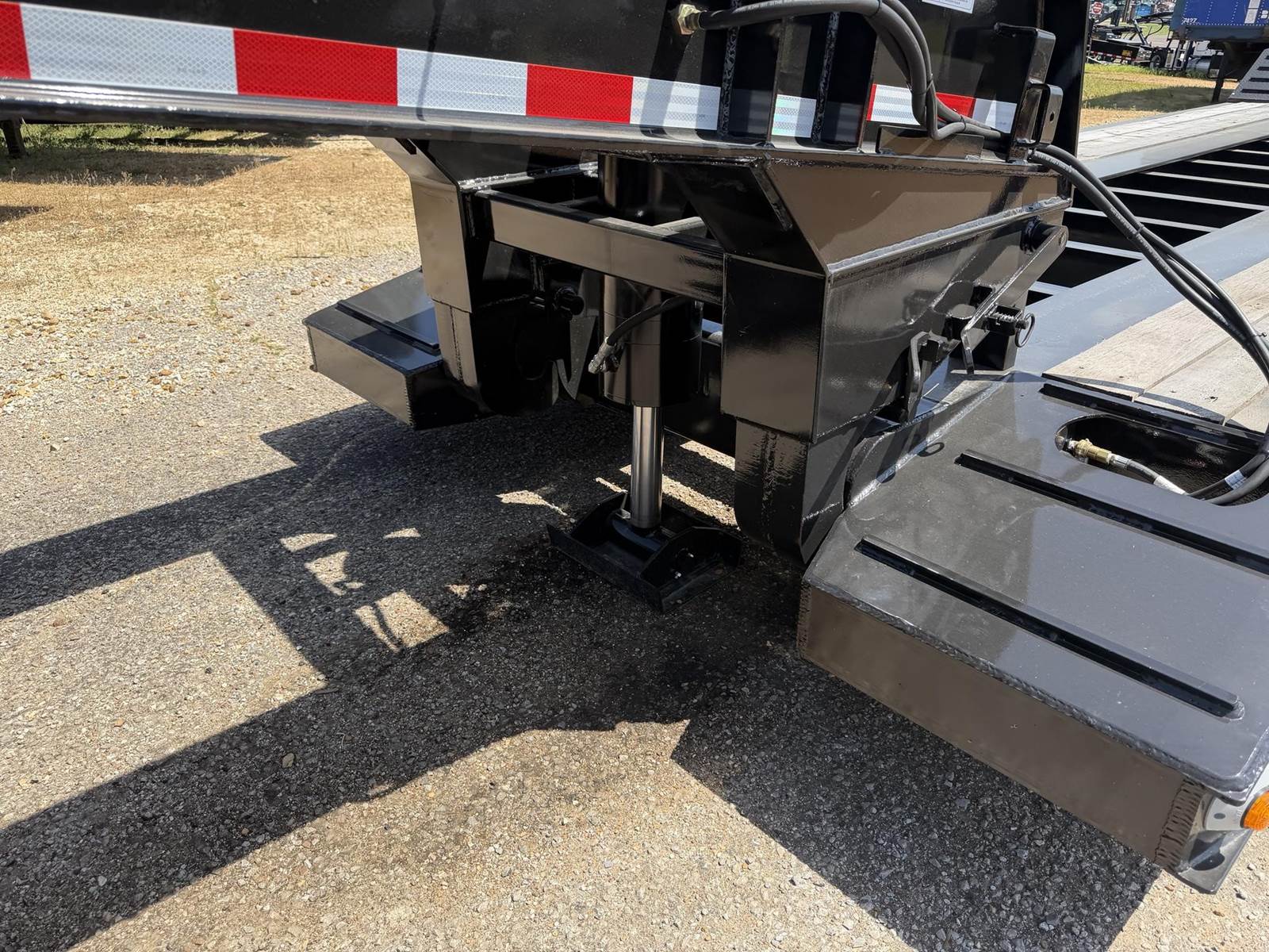 NEW 52 TON LOW BOY TRAILER, 24 FT WELL, DOVE TAIL WITH RAMPS, CHAIN TIE DOWNS, D-RINGS, HONDA PONY ENGINE, CHAIN/BINDER STORAGE, GROUND BEARING DETACH, FACTORY WARRANTY, PAD FOOT ON LIFT CYLNDER! WELL BUILT TRAILER/ GREAT FOR FAST LOADING AND UNLOADING! *POLISHED ALUMINUM WHEELS!!
