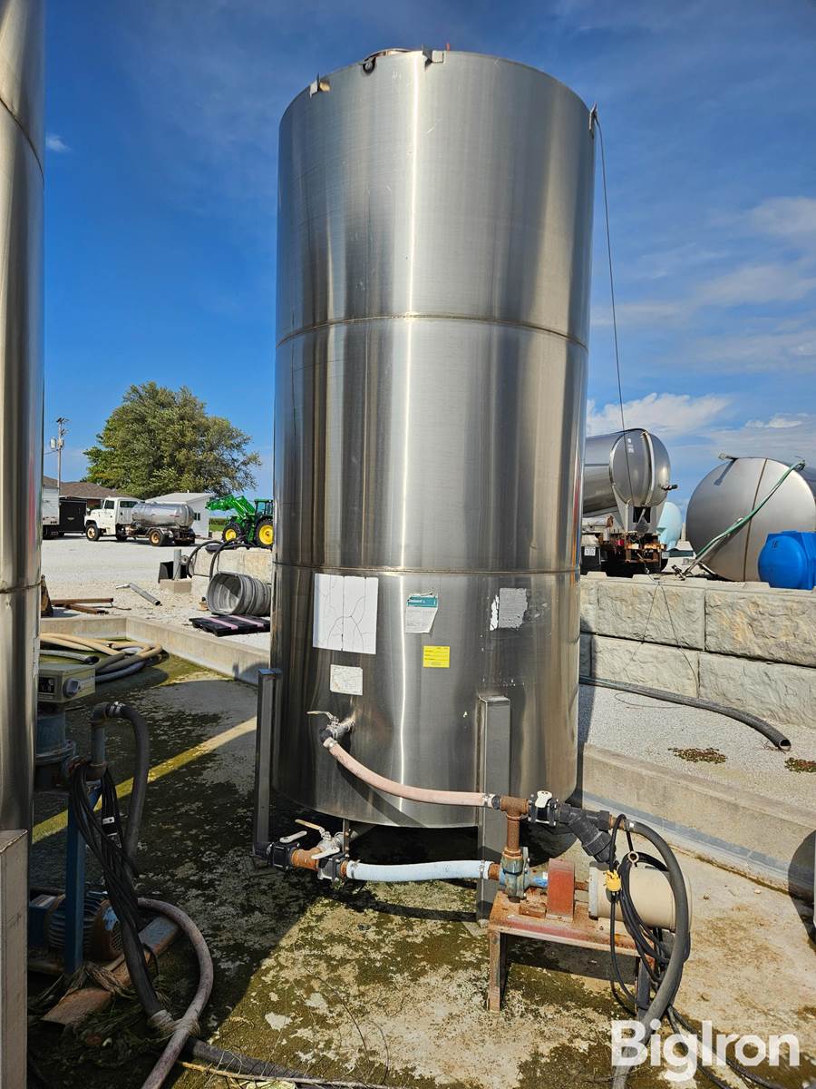 2400-Gal Stainless Steel Tank W/ Pump & Motor. 2" Plumbing. 3 Phase Electric Motor. Recirculation. Approx. 6' Wide. Tank Is Approx. 12' Tall Plus Sits 18" Off Of Ground. NOTE; Tank And Pump Will Be Disassembled Ready For Load Out