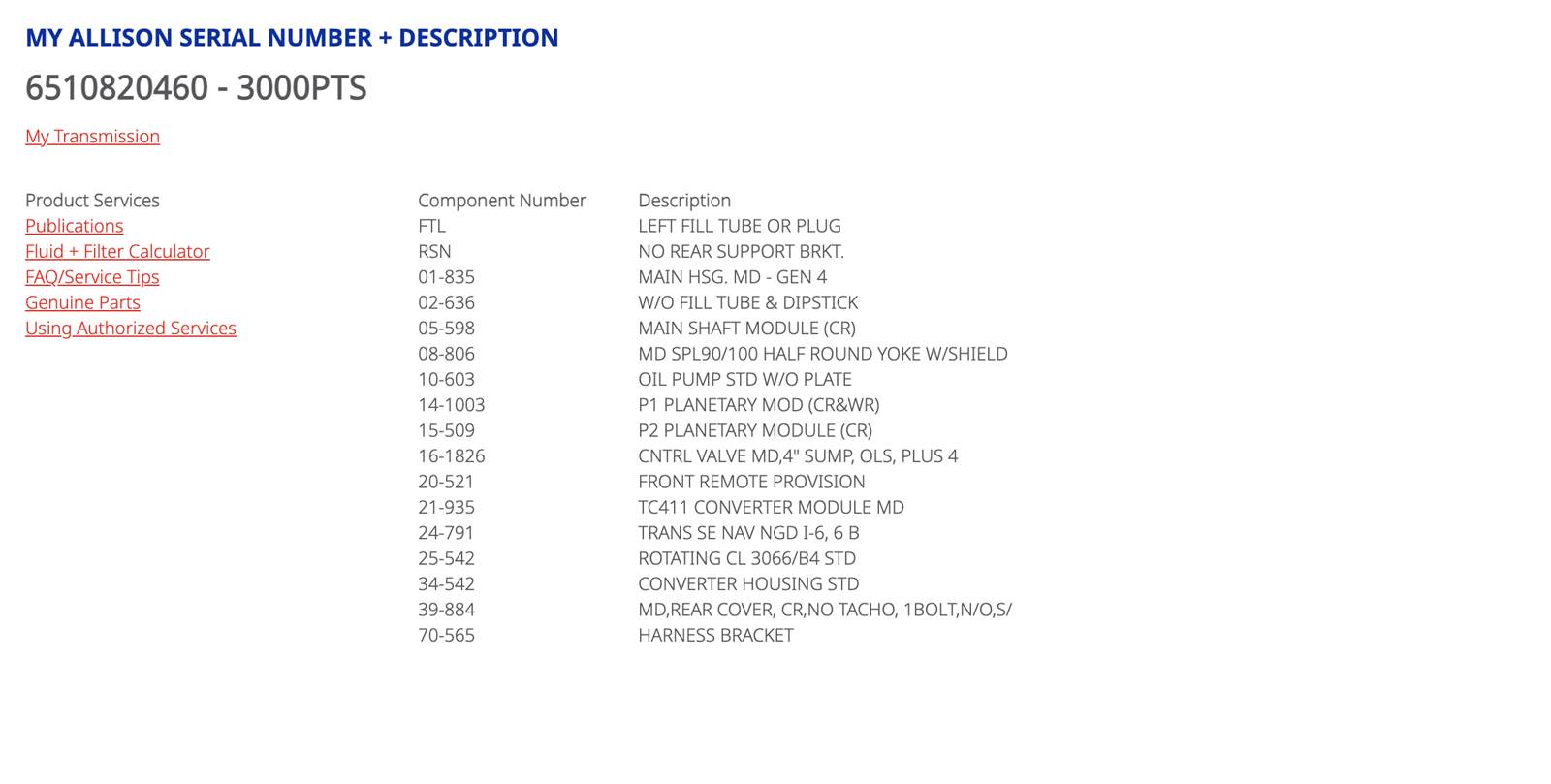 (GOOD USED w/ WARRANTY & NO CORE CHARGE) Allison 3000PTS Transmission For Sale, 3000 PTS, Part # 08F05, TIDA, Casting # 29544146, Torque Converter Part # 29535591, Allison 3000 PTS, E013115, Serial # 6510820460, Stock # 9605 Component Number Description FTL LEFT FILL TUBE OR PLUG RSN NO REAR SUPPORT BRKT. 01-835 MAIN HSG. MD - GEN 4 02-636 W/O FILL TUBE & DIPSTICK 05-598 MAIN SHAFT MODULE (CR) 08-806 MD SPL90/100 HALF ROUND YOKE W/SHIELD 10-603 OIL PUMP STD W/O PLATE 14-1003 P1 PLANETARY MOD (CR&WR) 15-509 P2 PLANETARY MODULE (CR) 16-1826 CNTRL VALVE MD,4" SUMP, OLS, PLUS 4 20-521 FRONT REMOTE PROVISION 21-935 TC411 CONVERTER MODULE MD 24-791 TRANS SE NAV NGD I-6, 6 B 25-542 ROTATING CL 3066/B4 STD 34-542 CONVERTER HOUSING STD 39-884 MD,REAR COVER, CR,NO TACHO, 1BOLT,N/O,S/ 70-565 HARNESS BRACKET | Tested & Inspected! Transmission is Tested & Inspected Internally. Warranty! Many Engines in Stock! Call CA Truck Parts for more information (305)688-1101