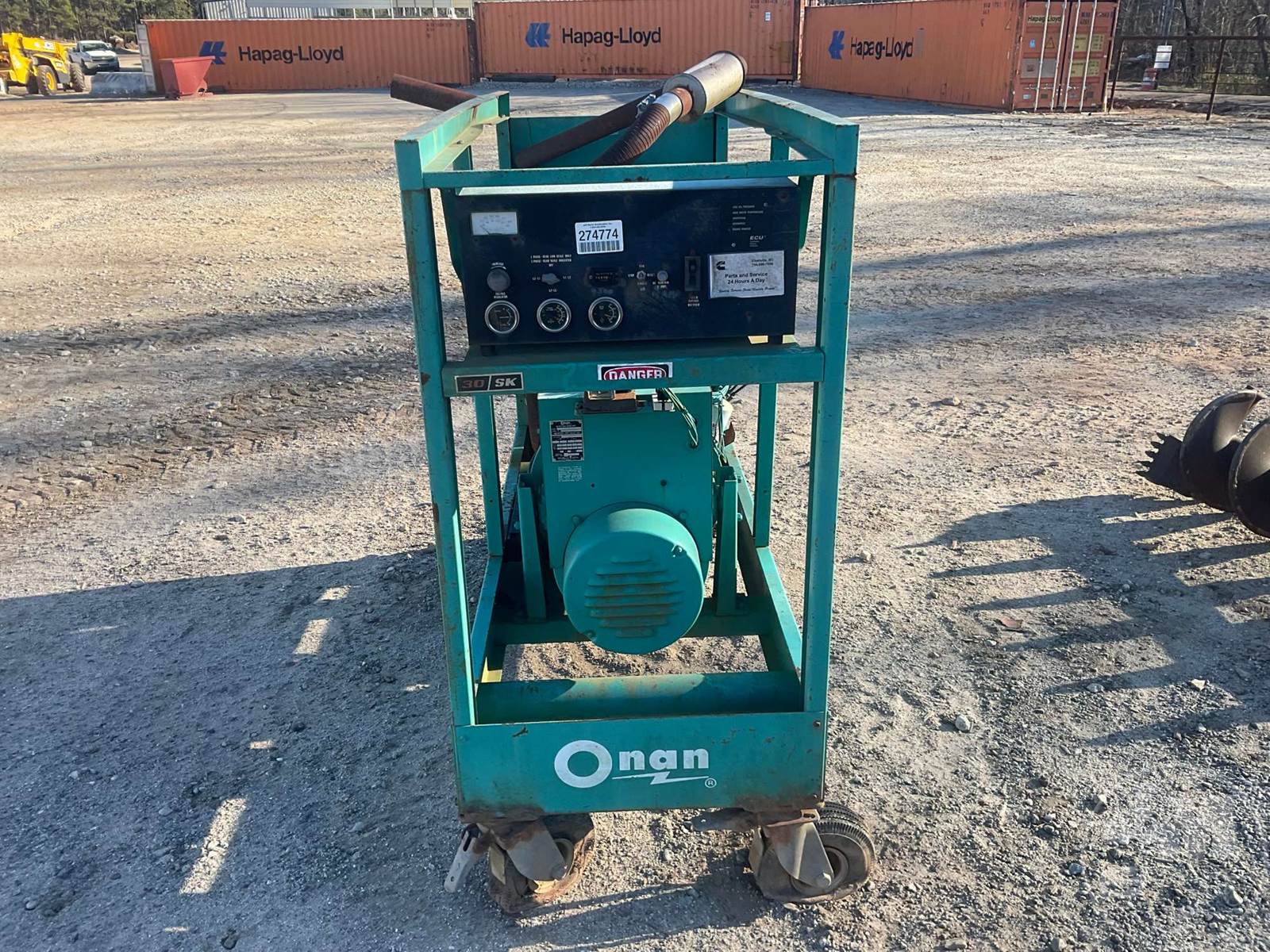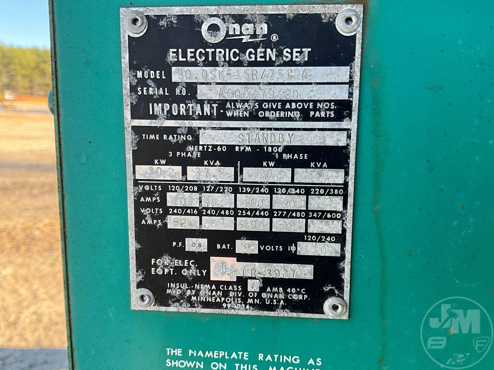 ONAN 30 KW SKID MOUNTED GENERATOR, 37.5, 3-PHASE, CUMMINS, H225, 8 CYL, DIESEL, VIN: E529284, HOUR METER READS: 589