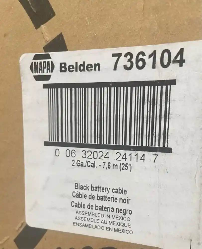 736104 Napa Belden 2 Ga Black Battery Cable , 25' desc1: 2 Ga. Black Battery Cable desc2: 25', Core Charge: 0.00