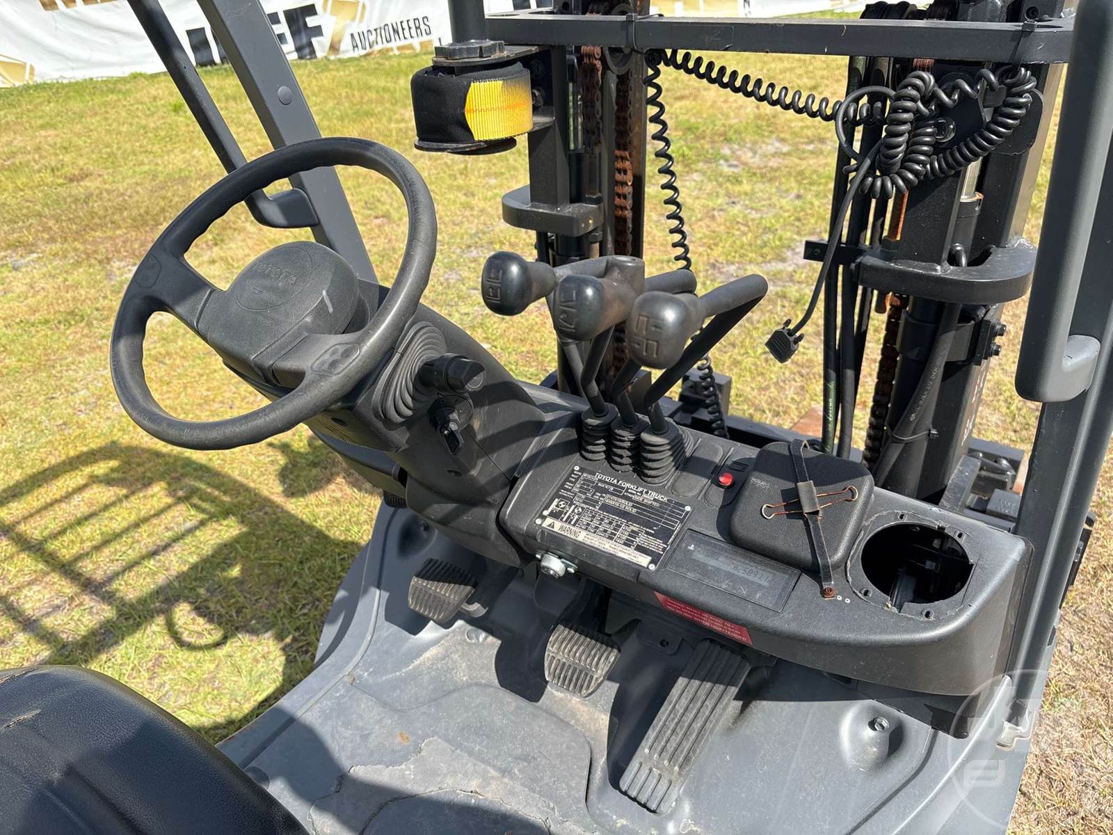 TOYOTA 4700 LBS CUSHION TIRE FORKLIFT, CAPACITY 4700 LBS, 4 CYLINDER , GAS, SIDE SHIFT, FORK POSITIONER, 3 STAGE MAST, FORK LENGTH:40", HOUR METER READS: 25890, ***LPG TANK NOT INCLUDED***