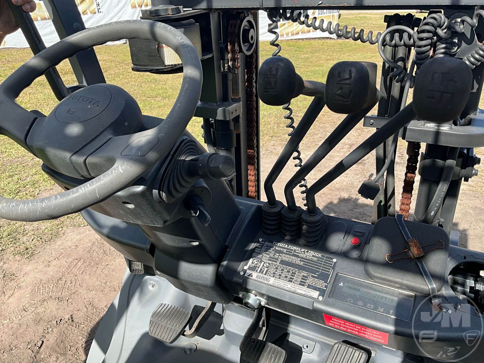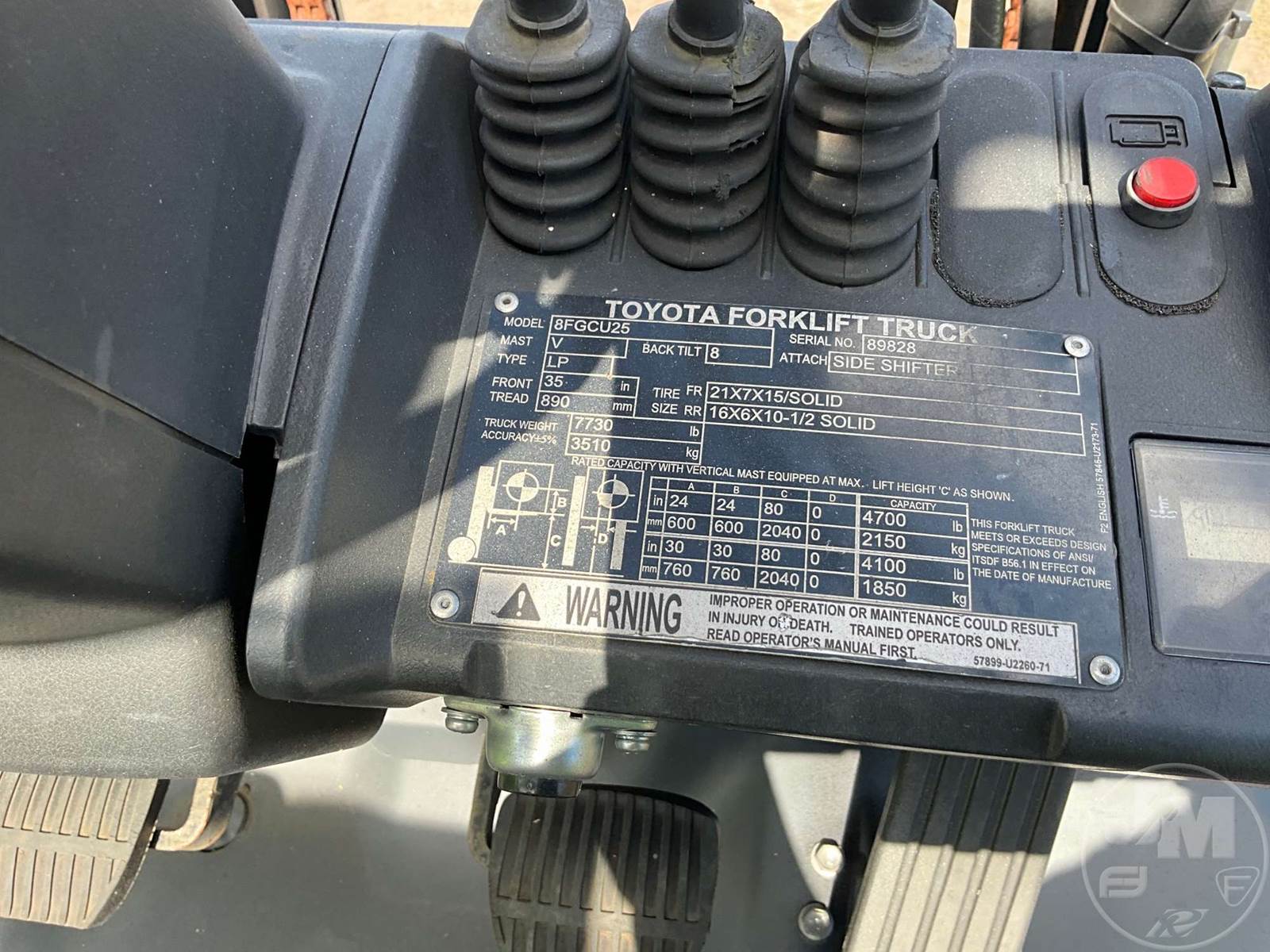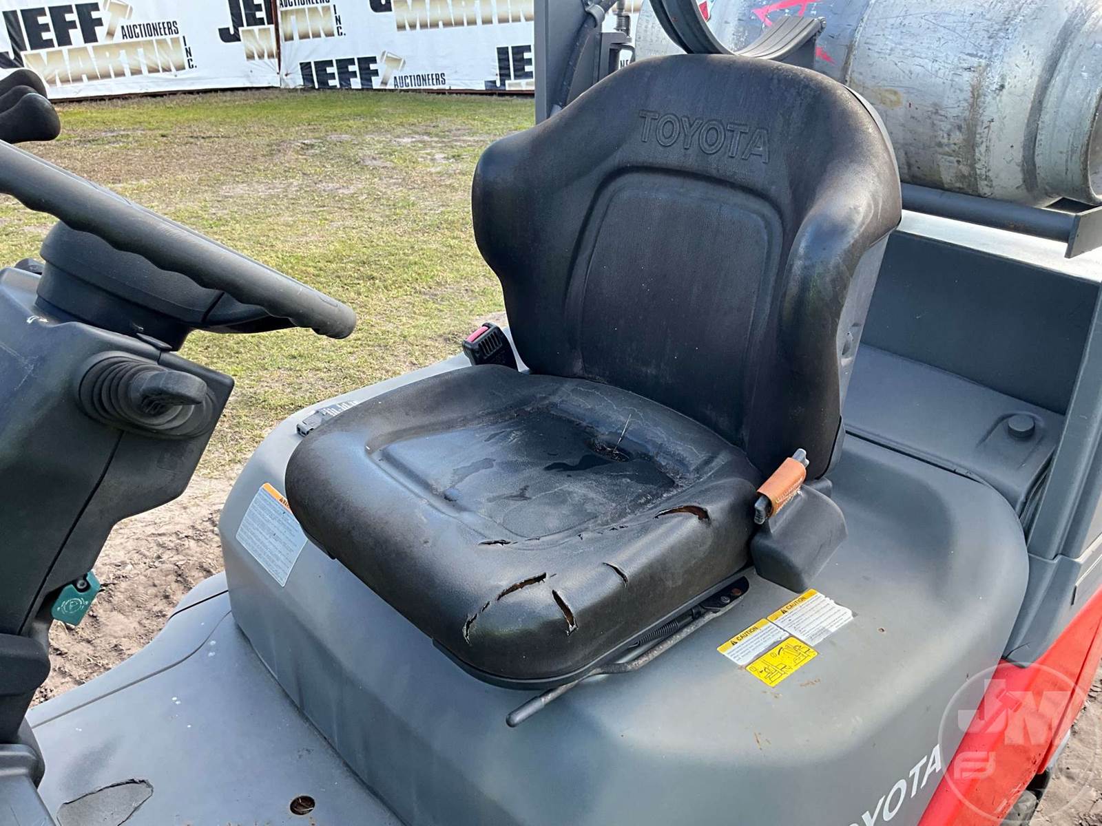 TOYOTA 4700 LBS CUSHION TIRE FORKLIFT, 4 CYLINDER , GAS, CANOPY, TILT CARRIAGE, SIDE SHIFT, 3 STAGE MAST, FORK LENGTH:40", HOUR METER READS: 25890, ***LPG TANK NOT INCLUDED***