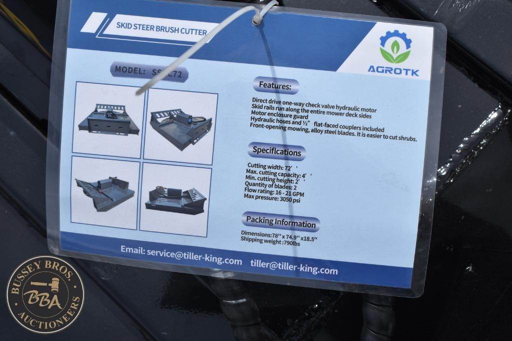 AGROTK Skid Steer Brush Cutter Attachment Skid Steer Mount, brush cutter, hydraulic, 72in cutting width, 4in min cutting height, 2 cutting blades, SSRC72, SN#SSRC26012202B, NEW/UNUSED
