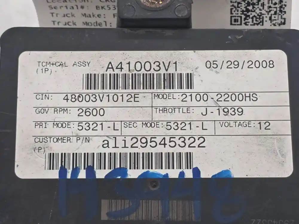 (Used) 2008 Allison 2100-2200HS, TRANSMISSION ECM- Part Number: 29545322, Serial Number:BK5322N18097DP32, CIN: 48003V1012E, GOV RPM: 2600 THROTTLE: J-1939 PRI MODE: 5321-L SEC MODE: 5321-L VOLTAGE: 12 TCM Model: A41, E11 022849 10 R 022849 SU Part Number: ATA4103 Base Part Number: 29545322, 1 Rectangular Plug with 80 Pins, Reference images for condition, For more information about this item, give us a call. We ship Worldwide! (CRG HEAVY TRUCK PARTS) 929 W PULASKI HWY ELKTON, MD 21921, Serial#: BK5322N18097DP32, Engine Make: Cummins, Engine Model: ISB, Casting#: 29545322